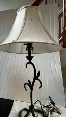 Heavy metal table lamp with an iron arm stand, blending a soft fabric shade with a sleek metal base. Adds a stylish and functional touch to any room. Will need electrical repair/splice.