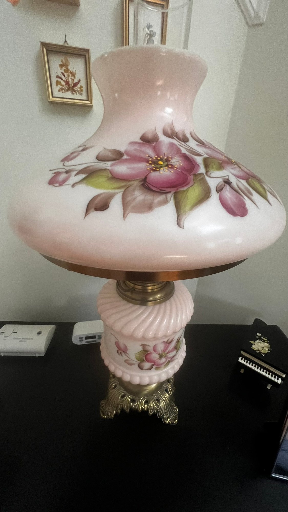 Elegant vintage hurricane lamp featuring a beautifully detailed floral design. Ideal for adding a classic and charming touch to any room.