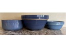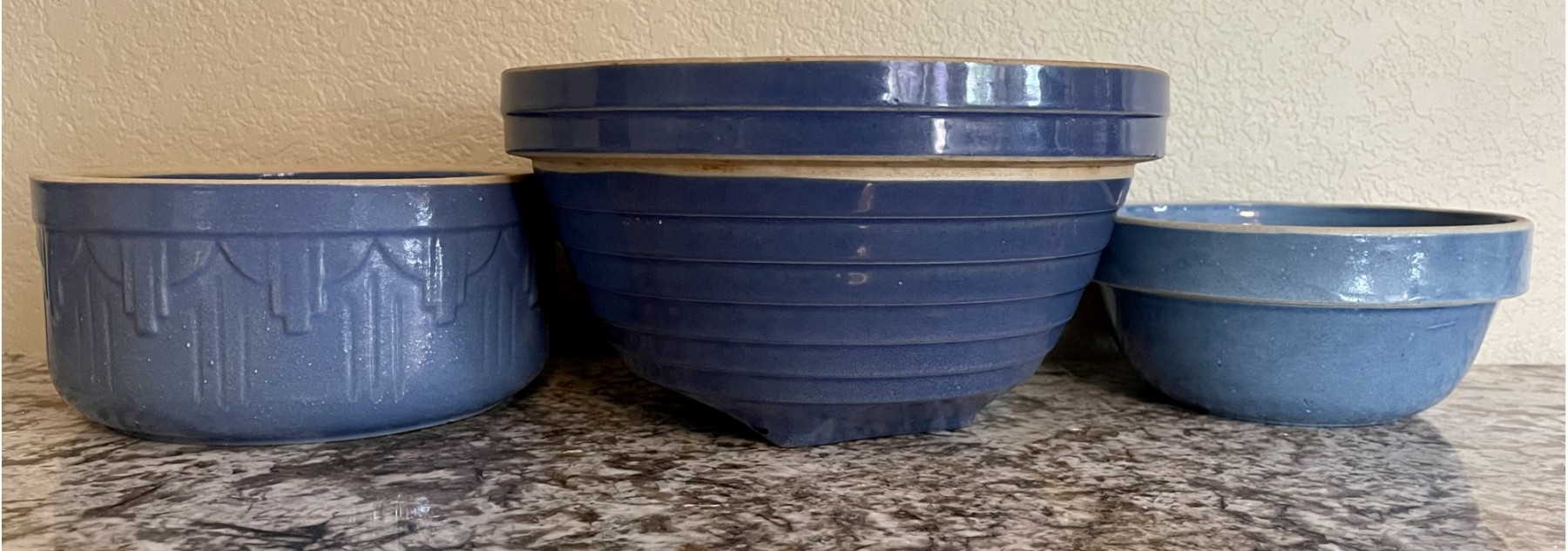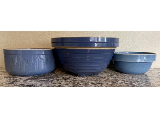 Good used condition. Some scratch lines in the bottom of the large bowl but it is not cracked. Largest is 9"W x 5"H, smaller are 6.75" Wide and 7.5" Wide. Some scrapes and wear due to age. Large bowl has a chip on bottom see photographs.