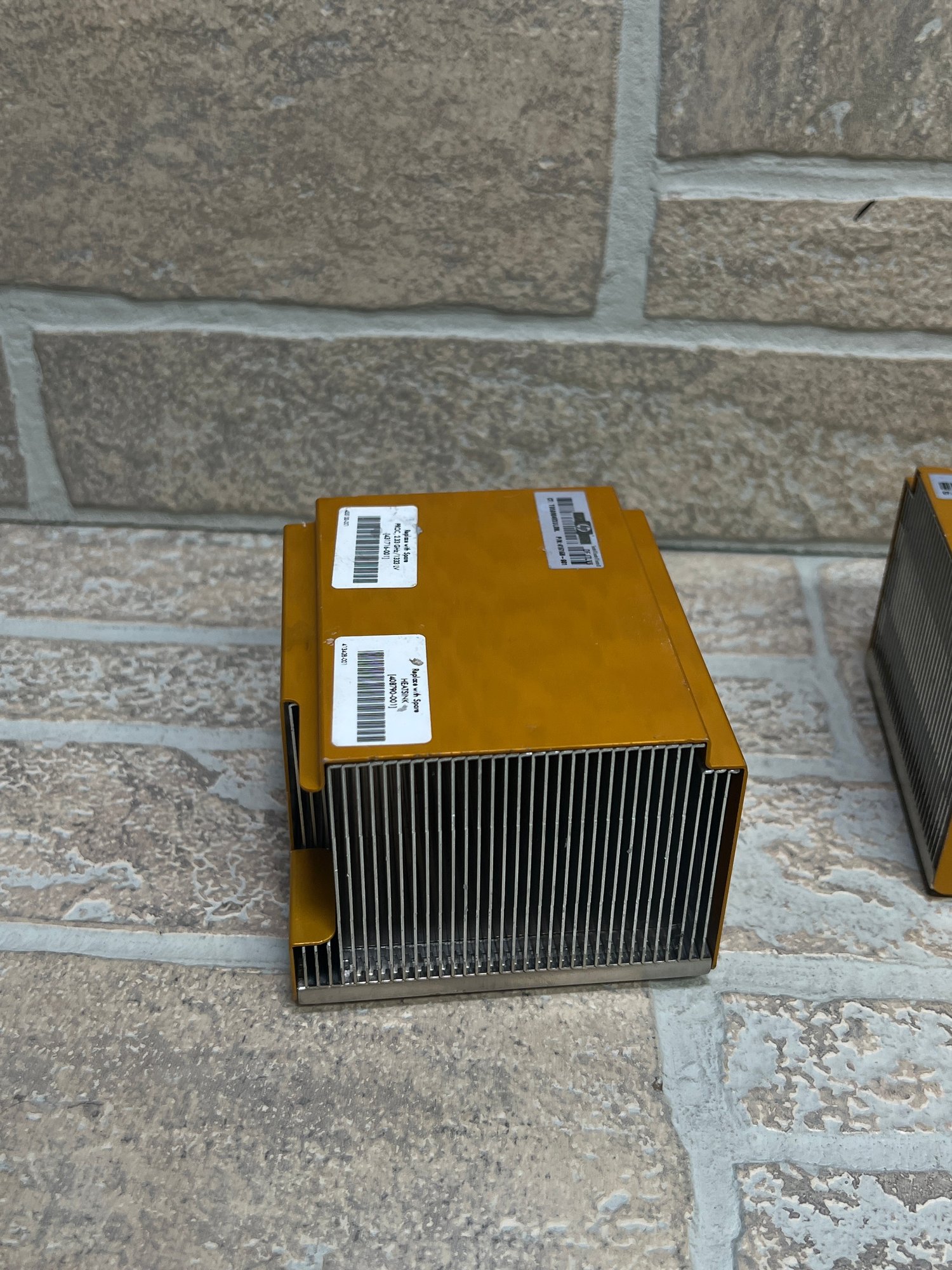 These are heavy-duty aluminum/copper cooling blocks designed for high-performance server processors. Each unit features dense fin arrays for efficient heat dissipation and OEM HP labeling.