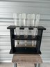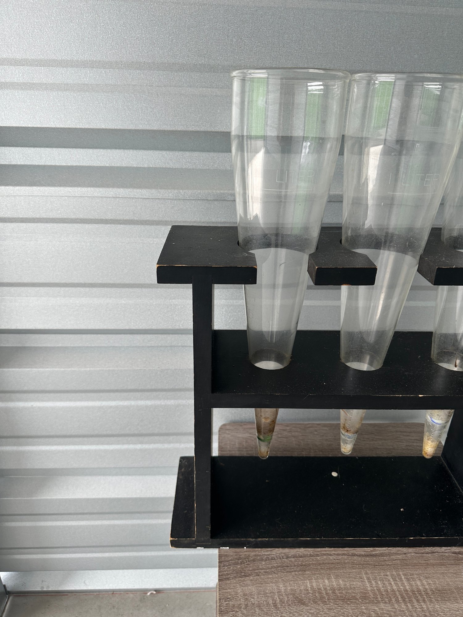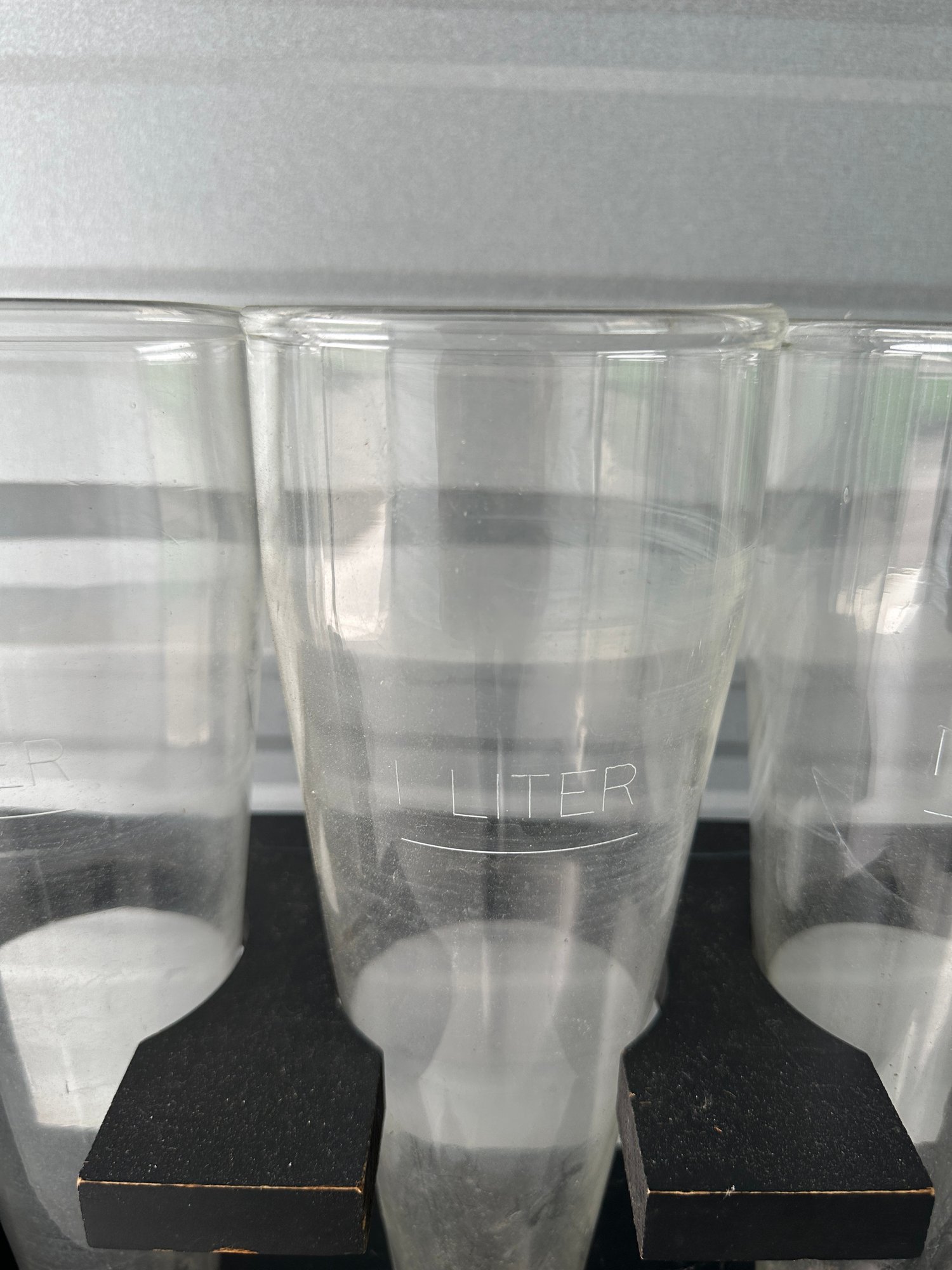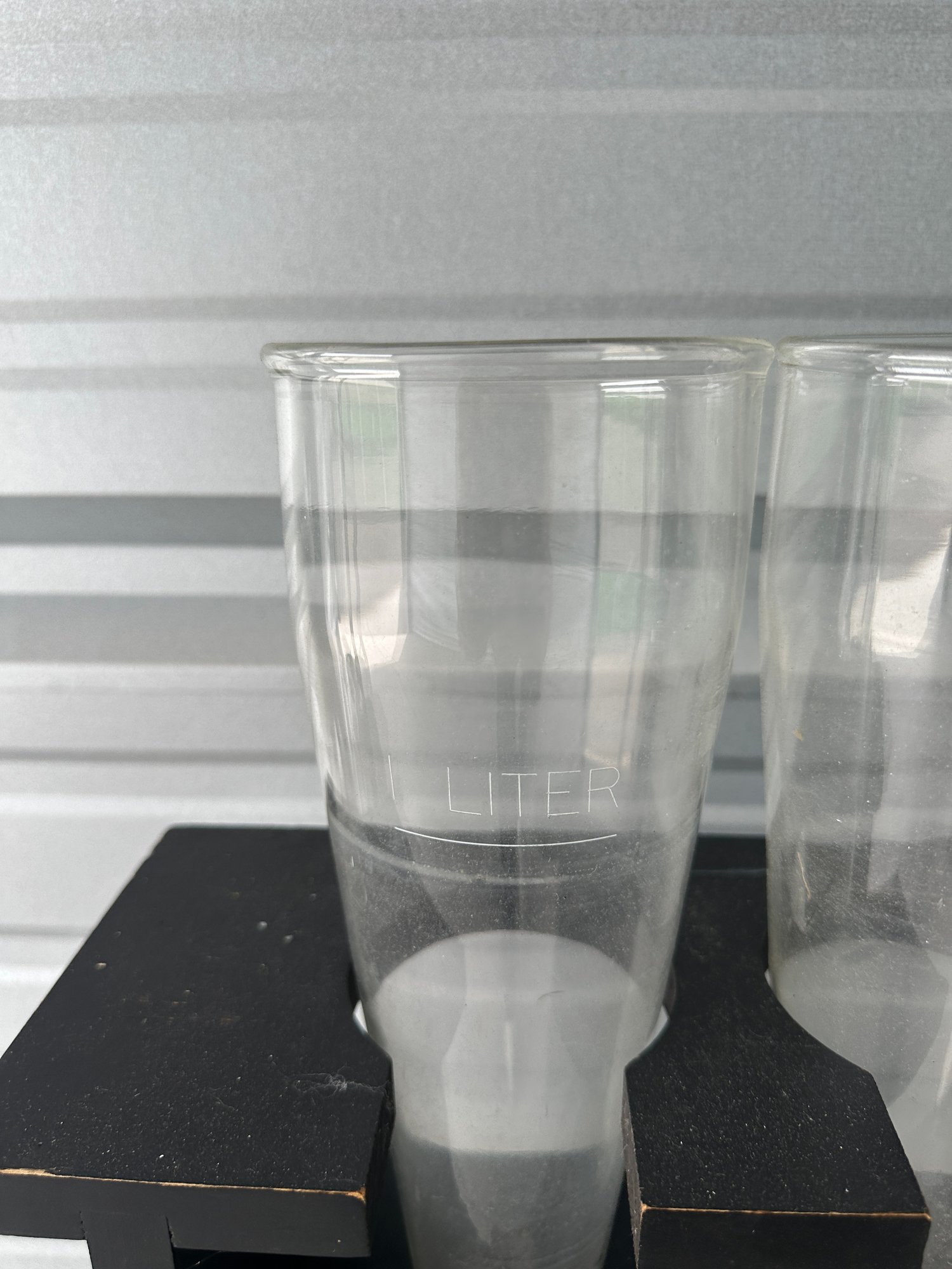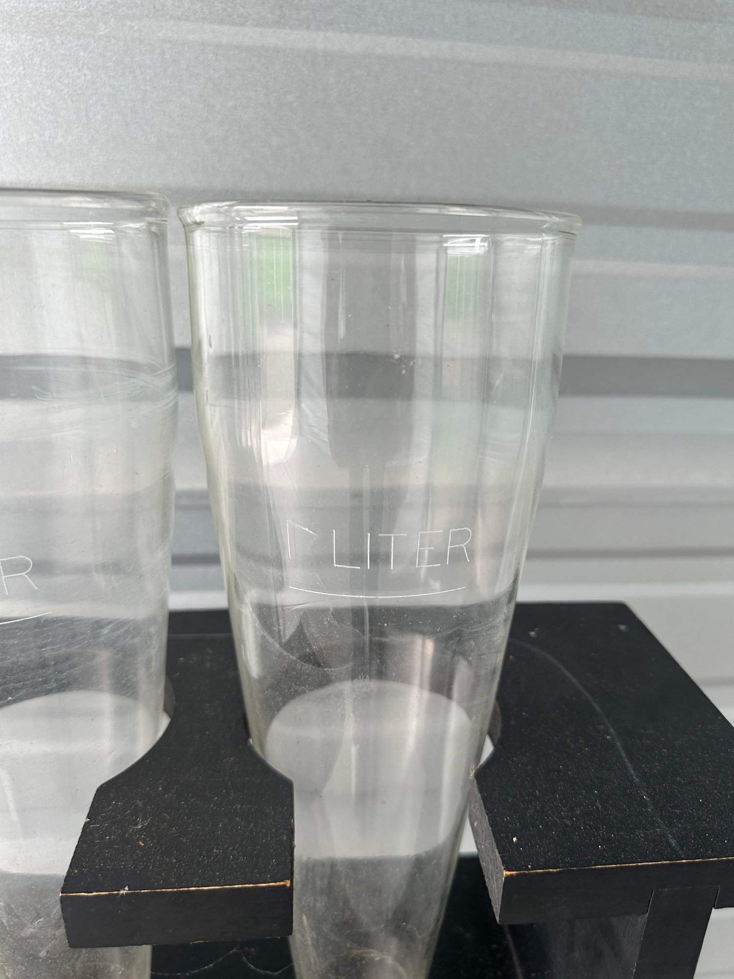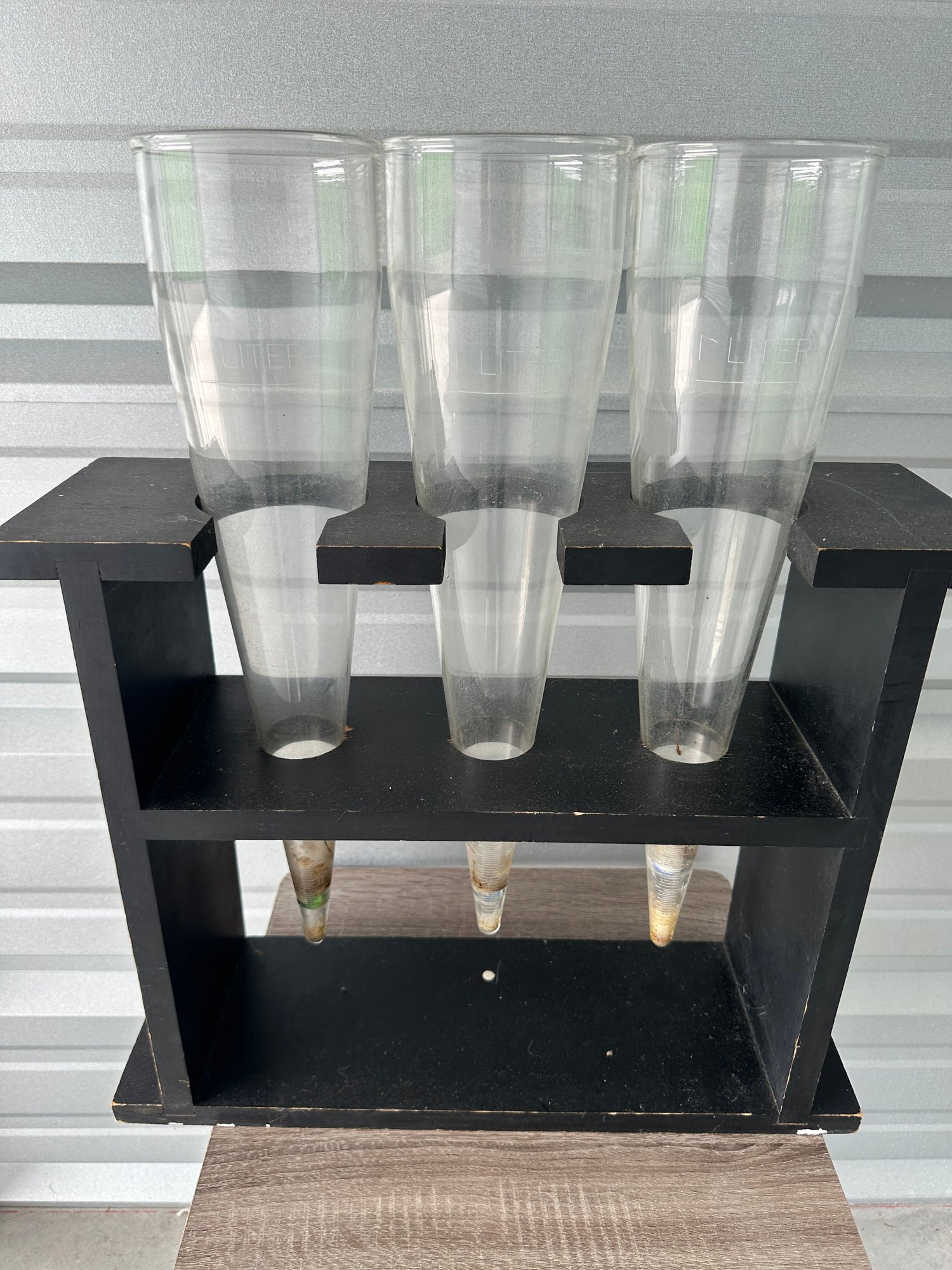 Unique 3-tube glass vessel display set in a black wooden stand. Features three large glass containers labeled “1 Liter” with graduated lower sections (appears similar to lab-style or decorative bar/science display piece).