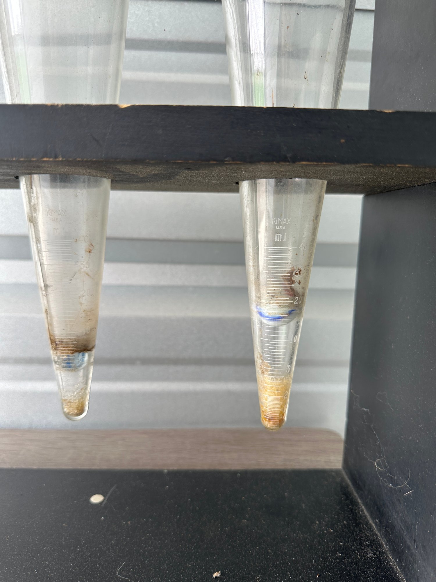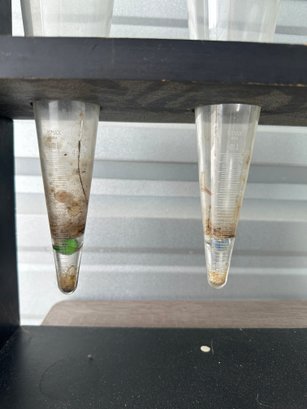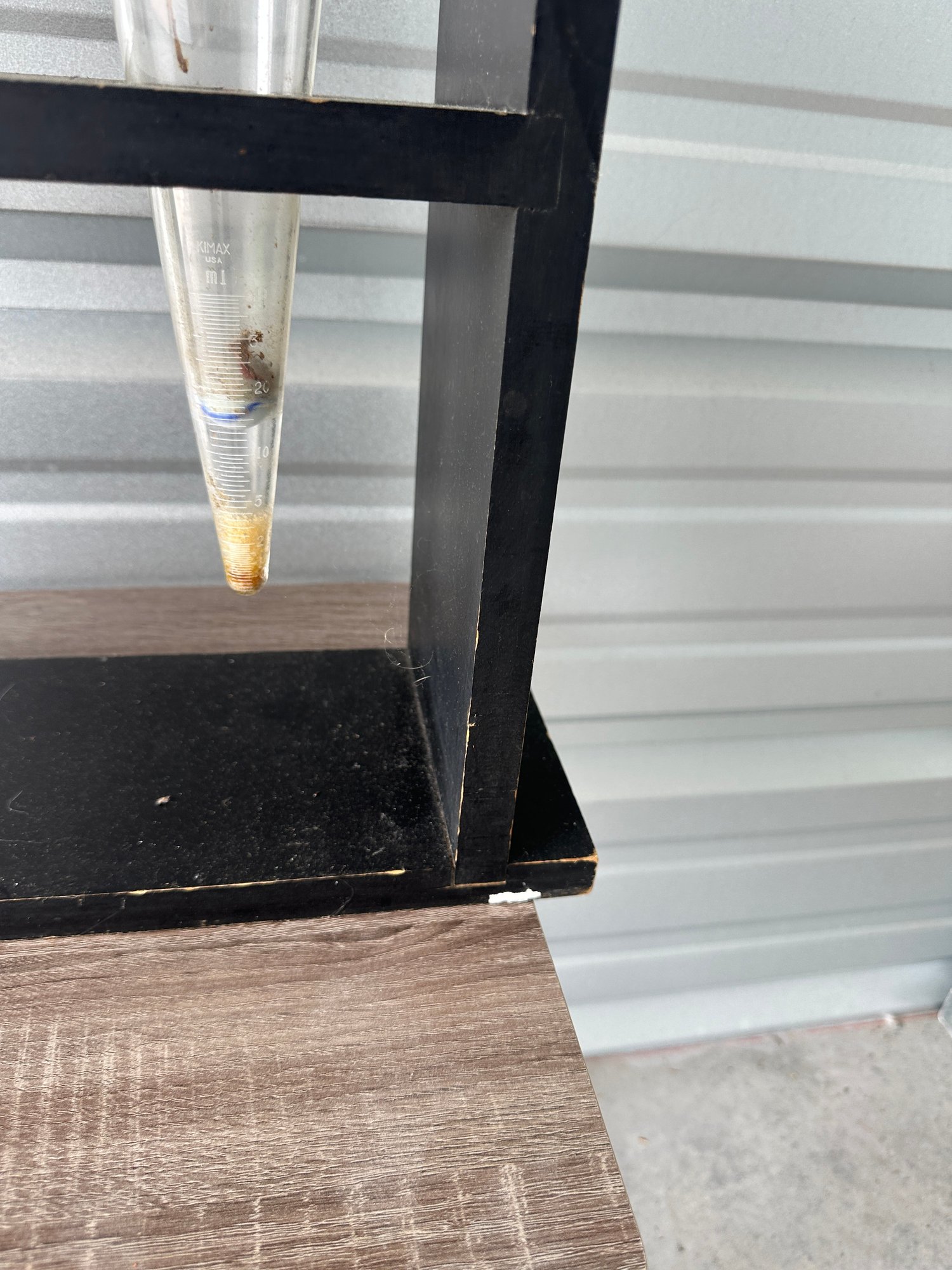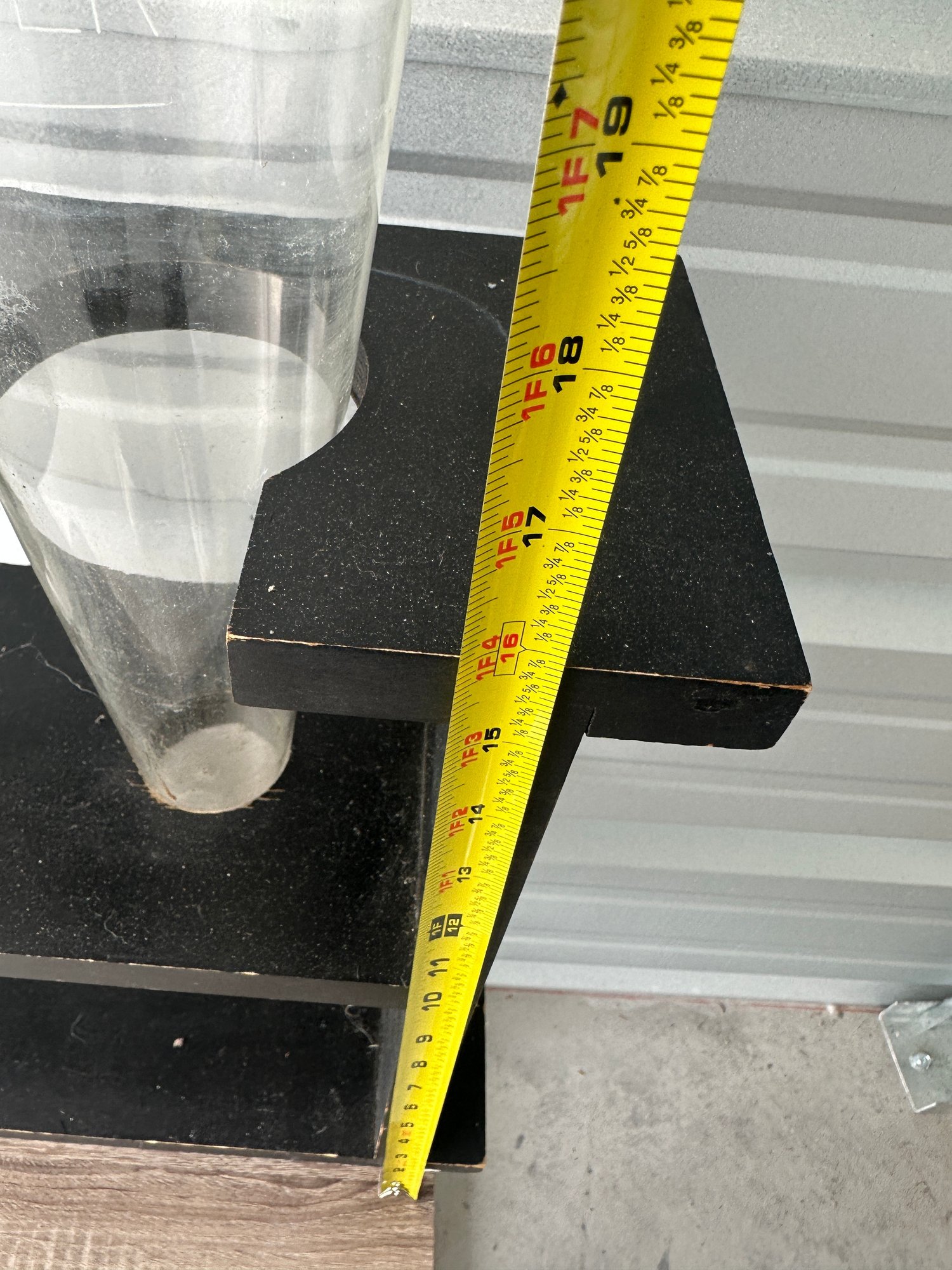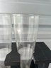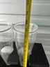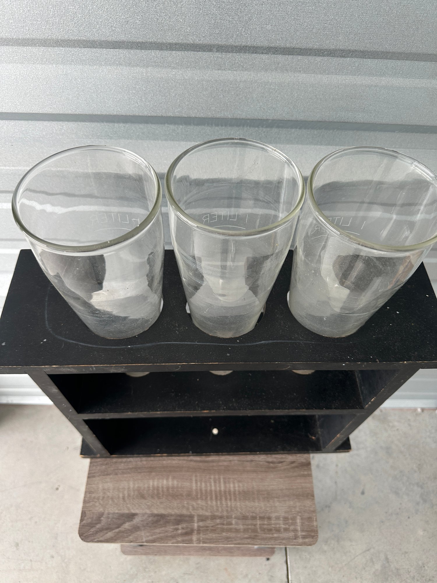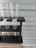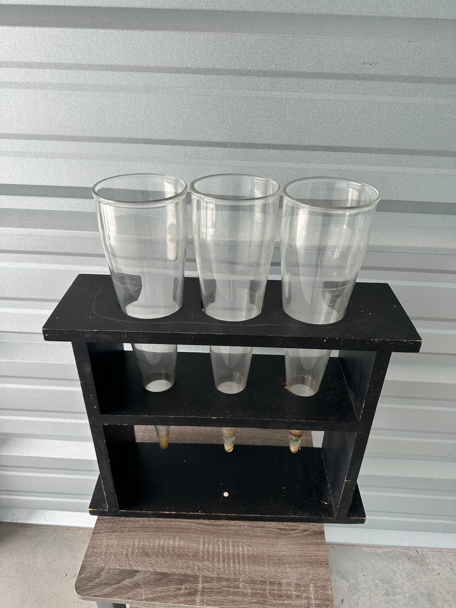 Unique 3-tube glass vessel display set in a black wooden stand. Features three large glass containers labeled “1 Liter” with graduated lower sections (appears similar to lab-style or decorative bar/science display piece).