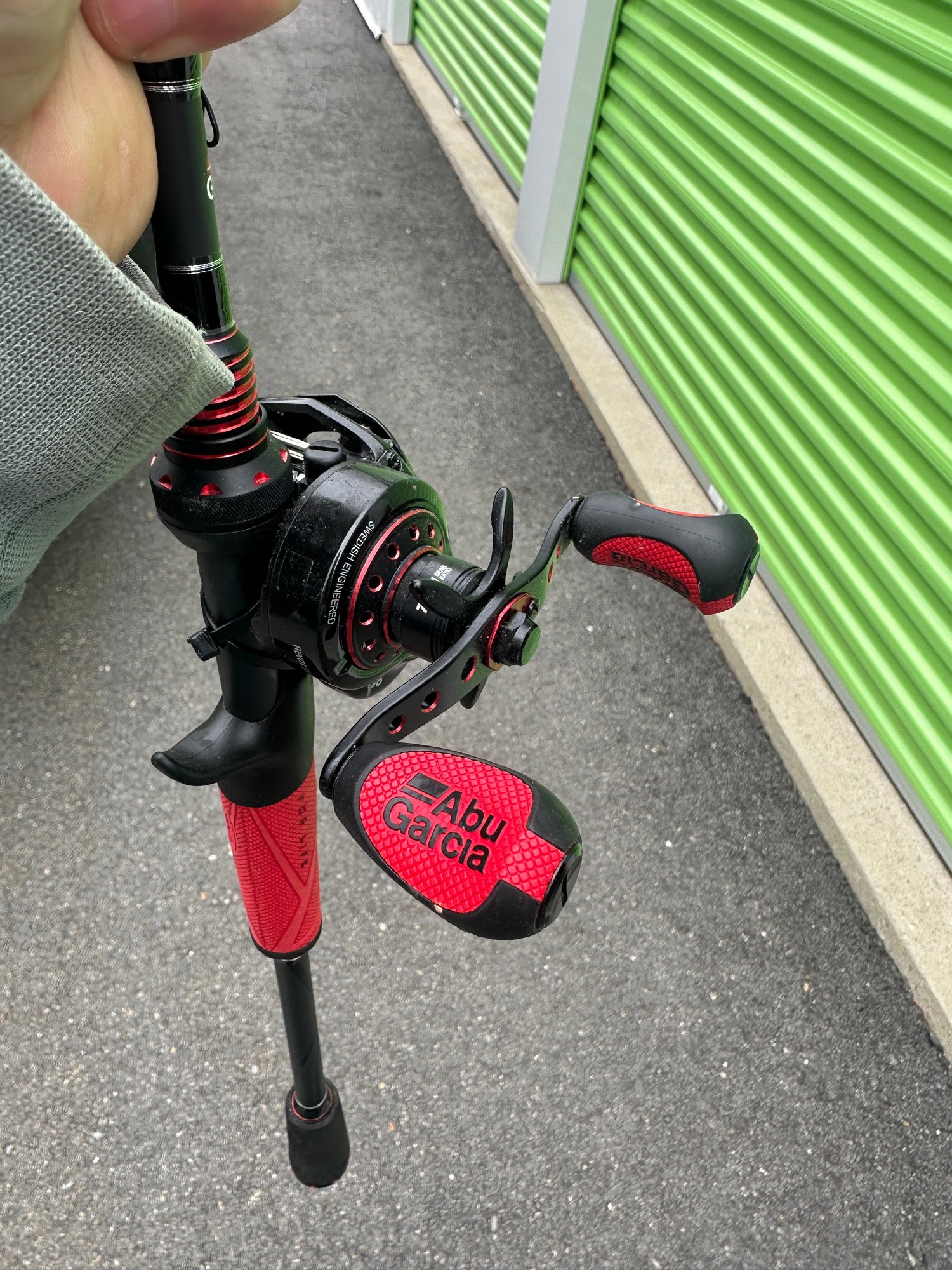 Abu Garcia baitcasting rod and reel combo featuring a Veritas Carbon rod paired with a Revo4 SX-HS-L low profile baitcasting reel.