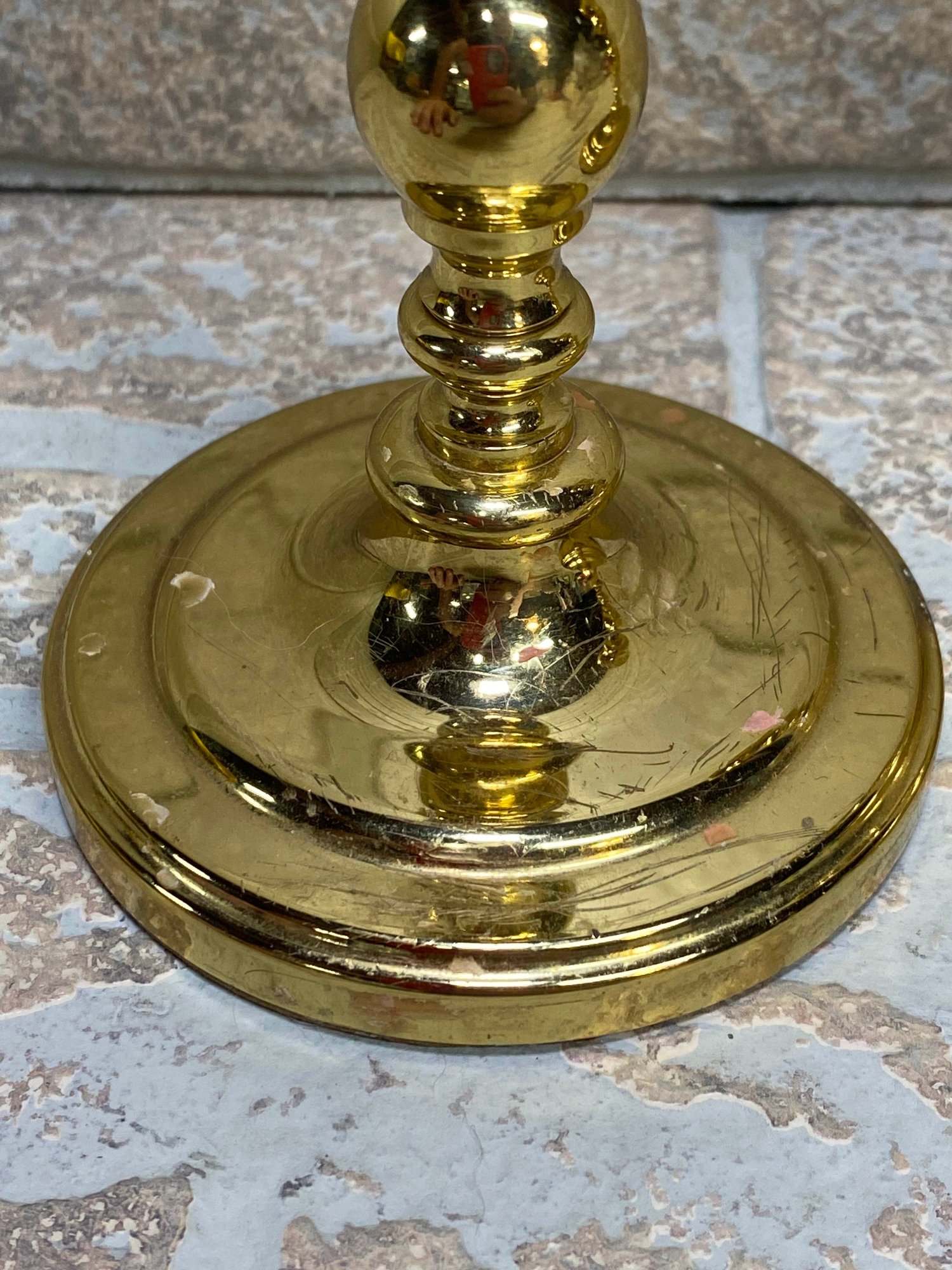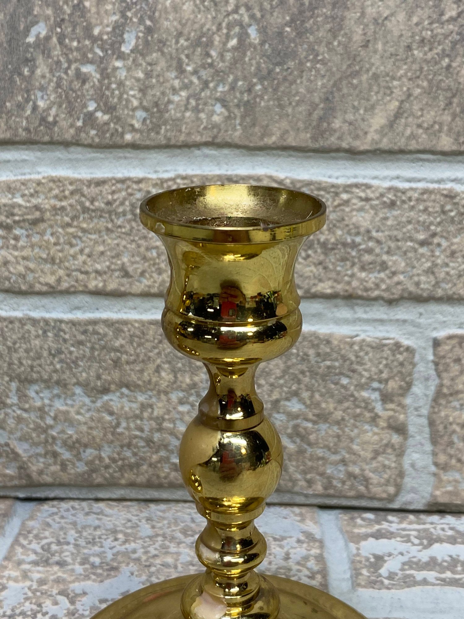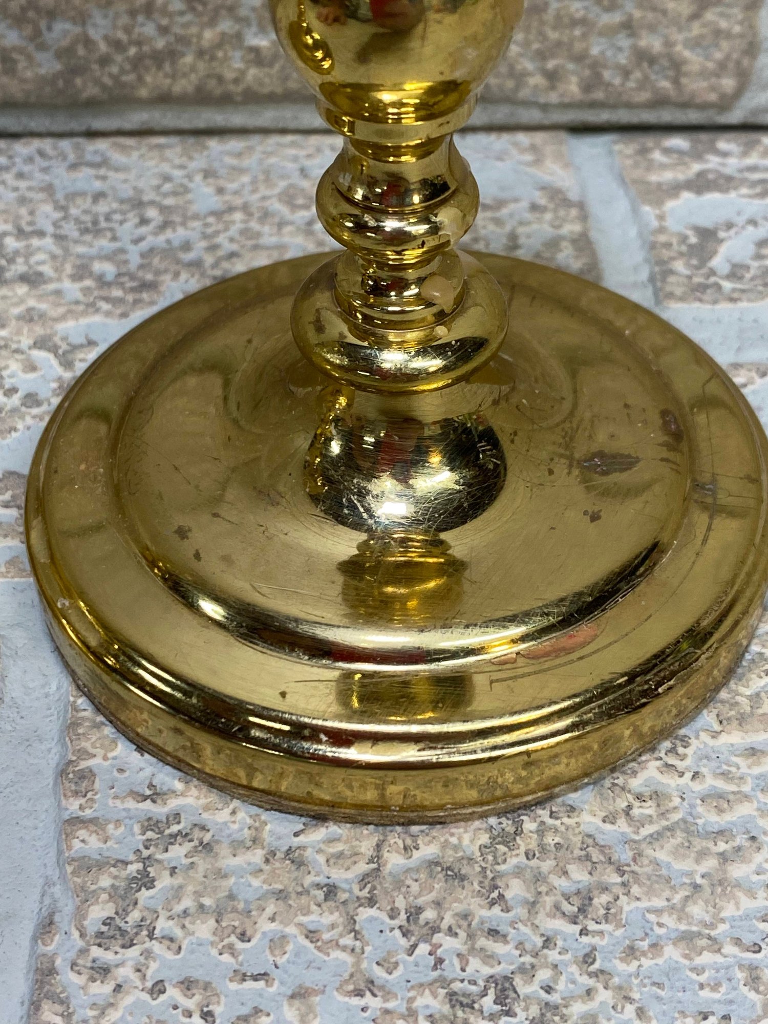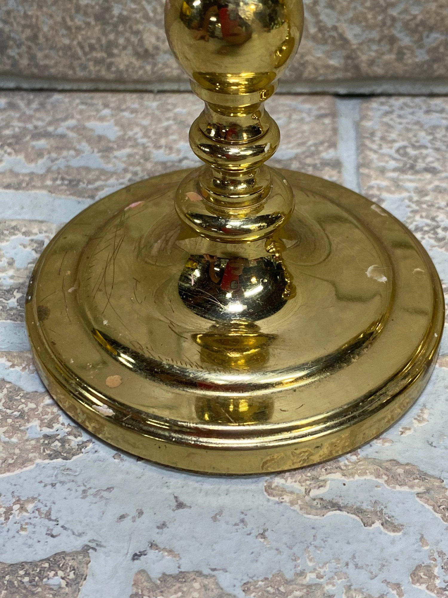 Notes: Pre-owned vintage condition Noticeable surface scratches and scuffs, especially on bases (see photos) Some wax residue present in candle cups Minor tarnish/patina consistent with age Felt bottoms show wear but still intact Overall solid and presentable with a nice aged brass look.