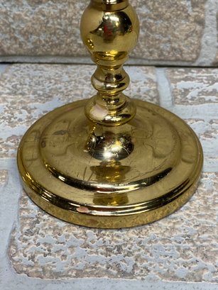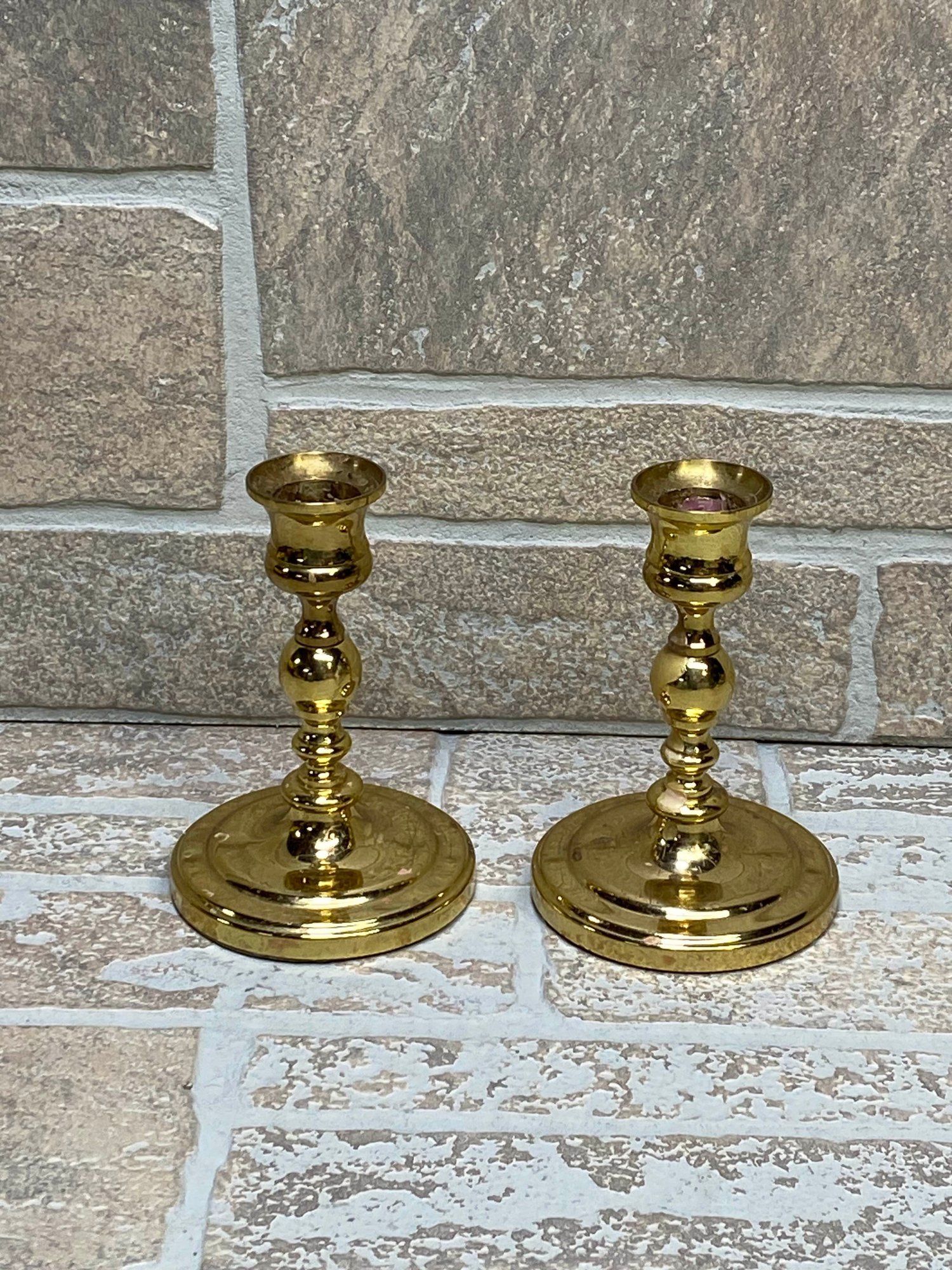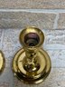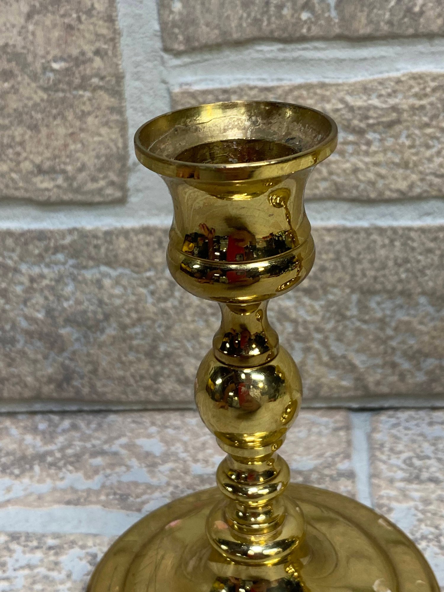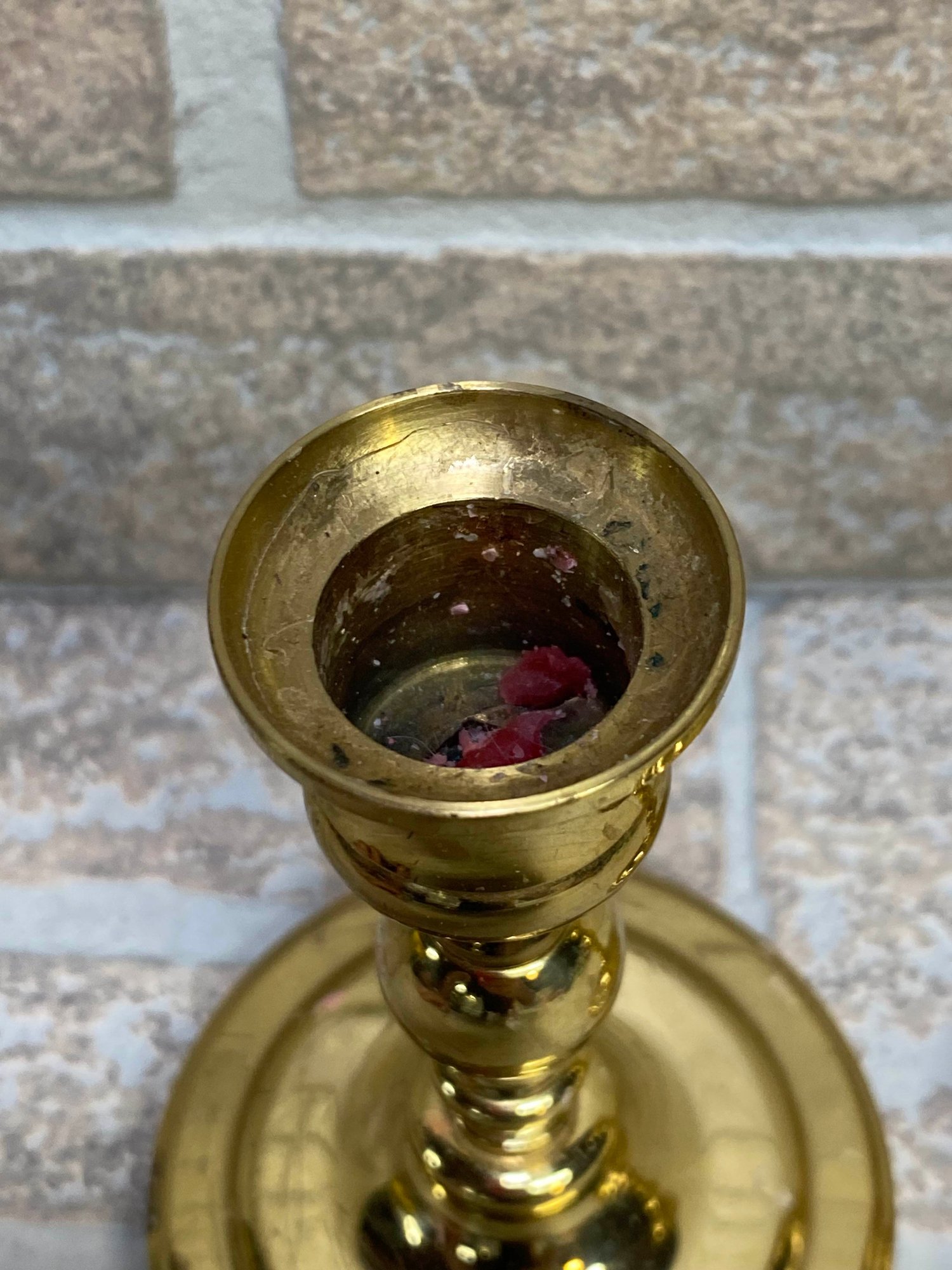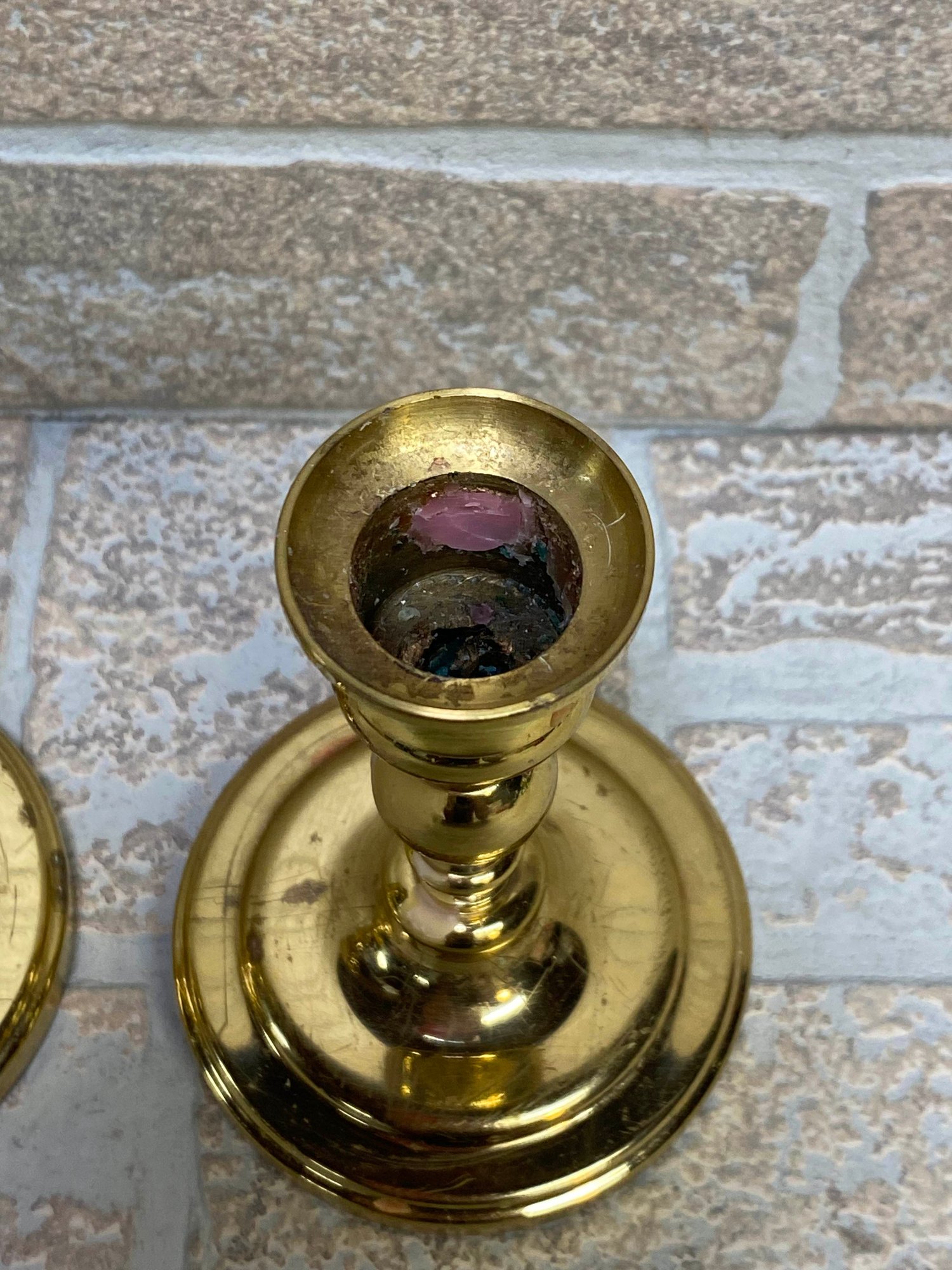 Notes: Pre-owned vintage condition Noticeable surface scratches and scuffs, especially on bases (see photos) Some wax residue present in candle cups Minor tarnish/patina consistent with age Felt bottoms show wear but still intact Overall solid and presentable with a nice aged brass look.
