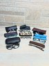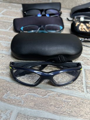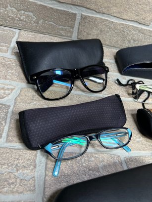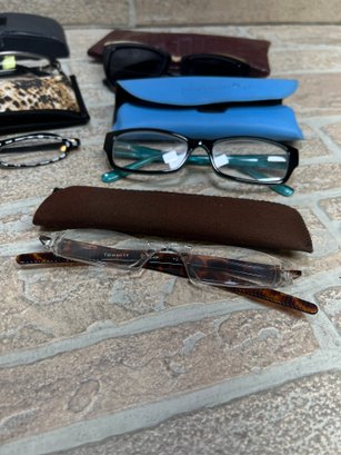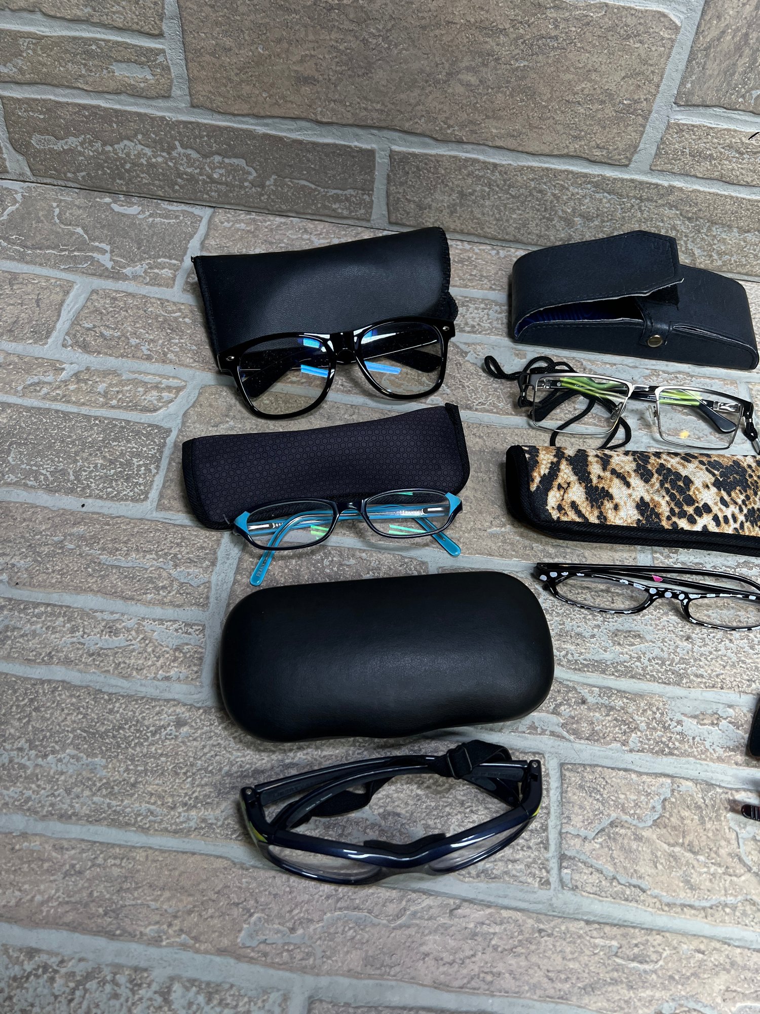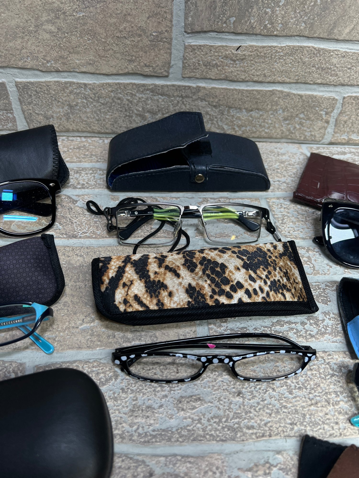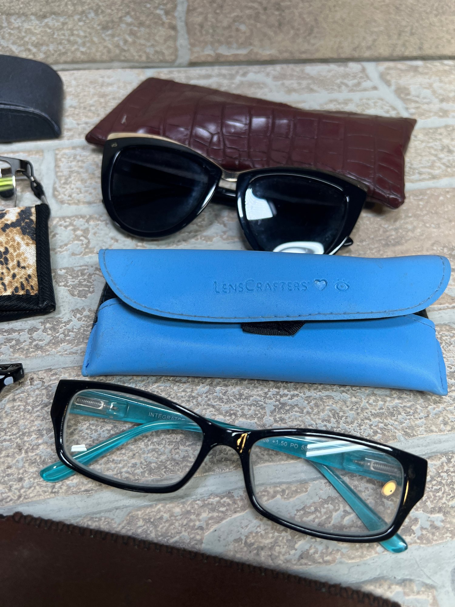 Assorted lot of eyeglasses and sunglasses including a variety of frames and multiple cases.