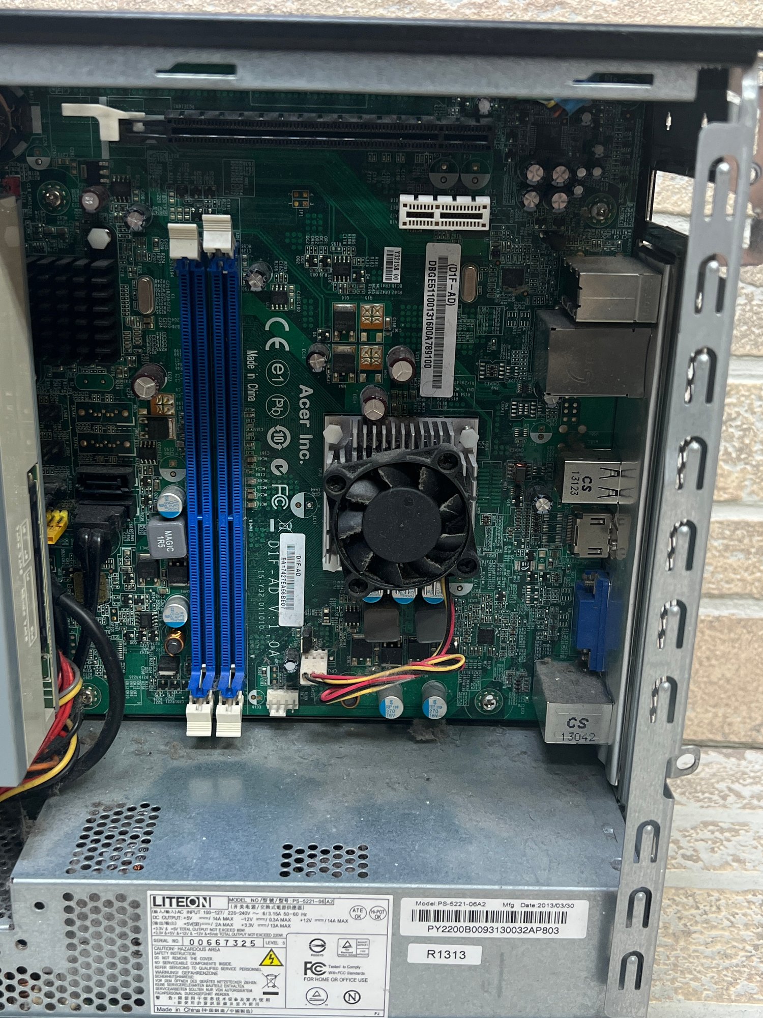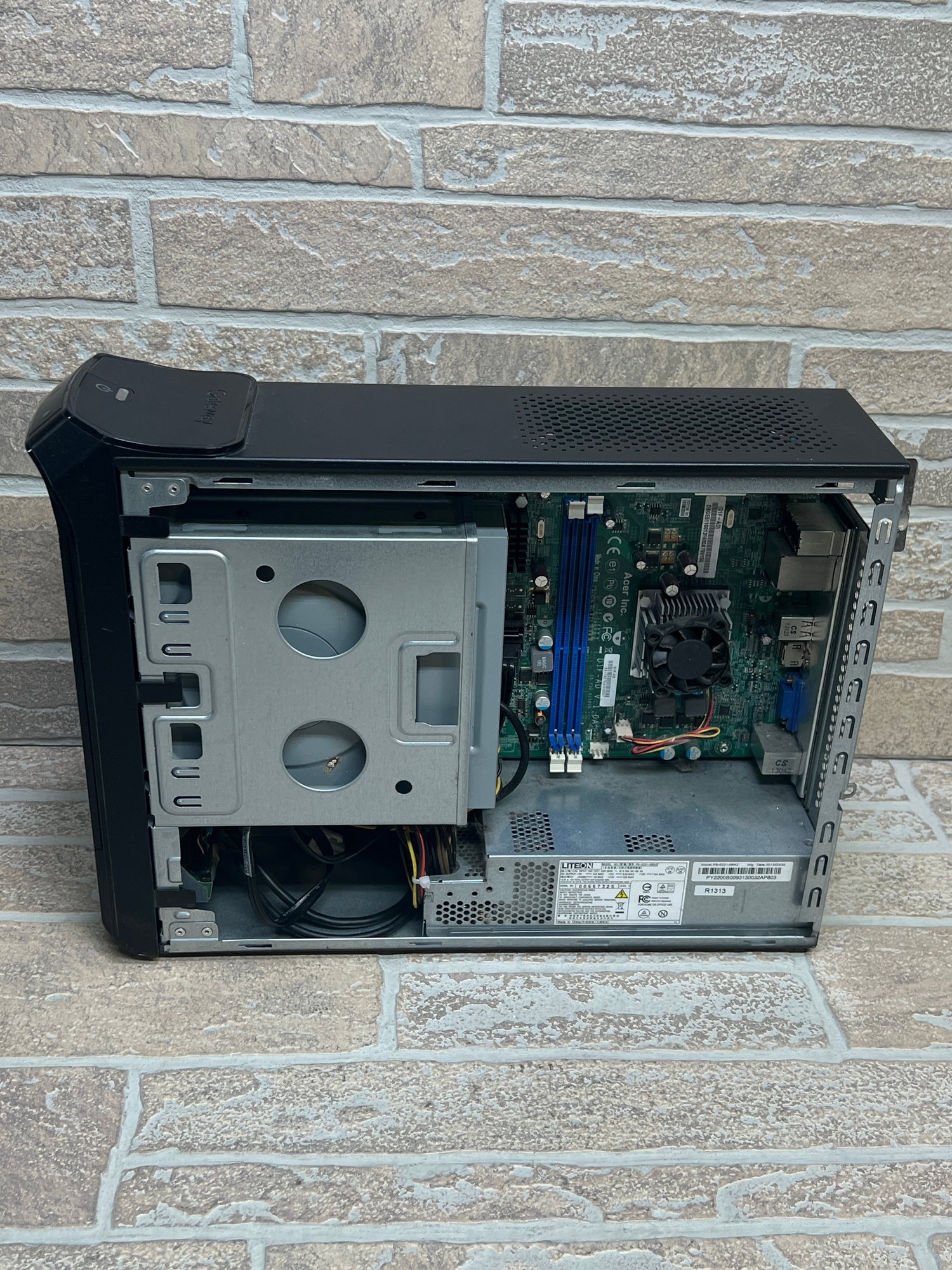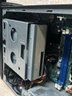 Interior components appear largely intact including motherboard, power supply, and optical drive. Hard drive presence and condition are not guaranteed.