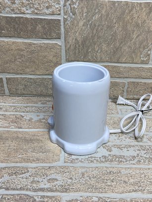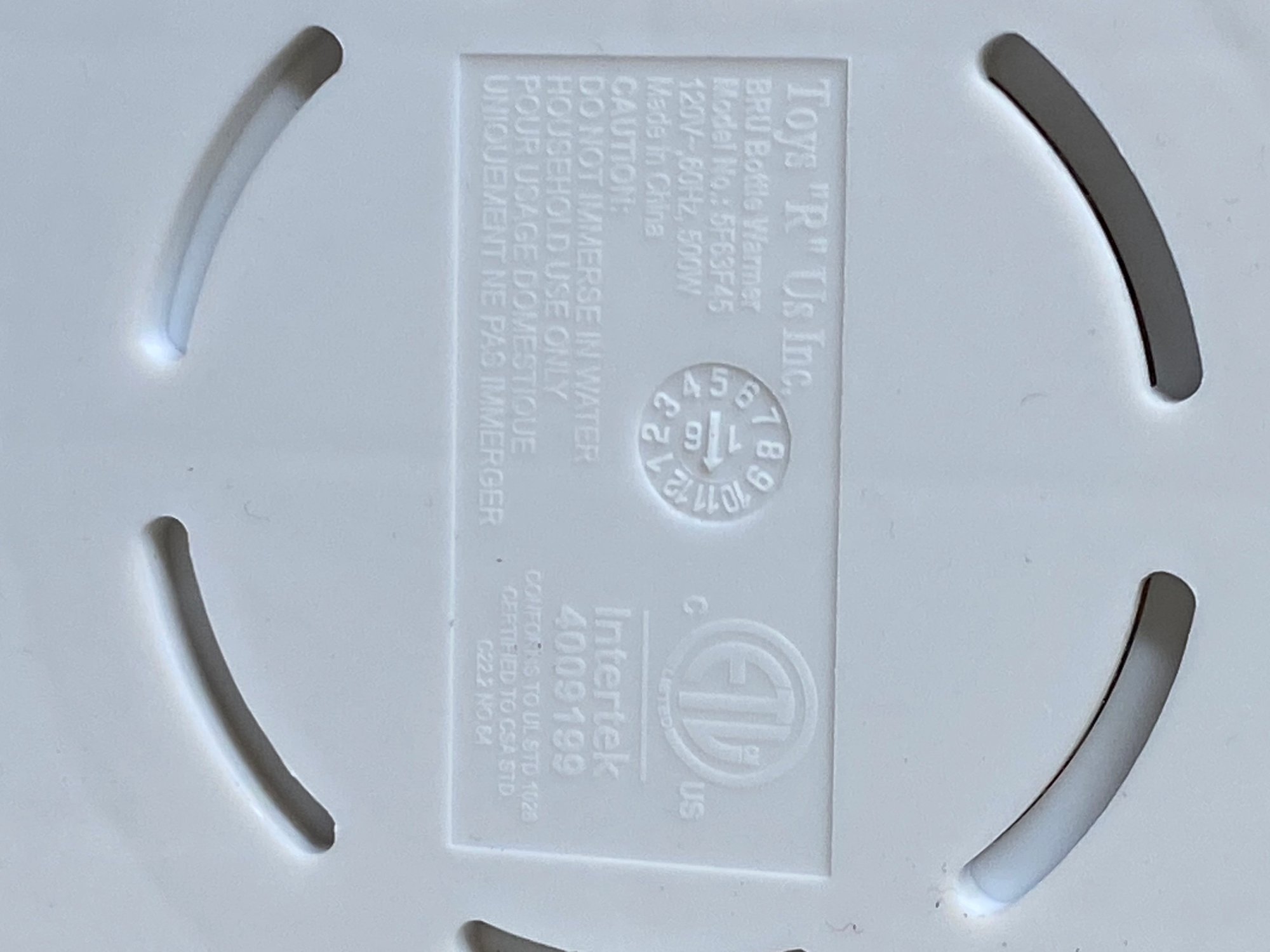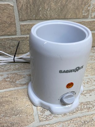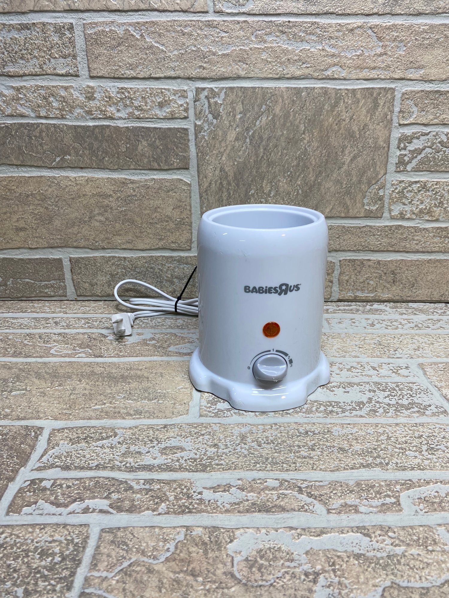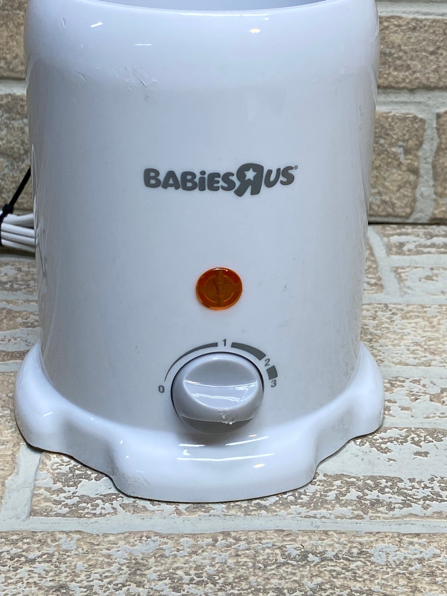 Babies“R”Us electric baby bottle warmer in white finish. Features a simple adjustable temperature dial (0–3 settings) and indicator light for easy use. Compact design fits most standard baby bottles.