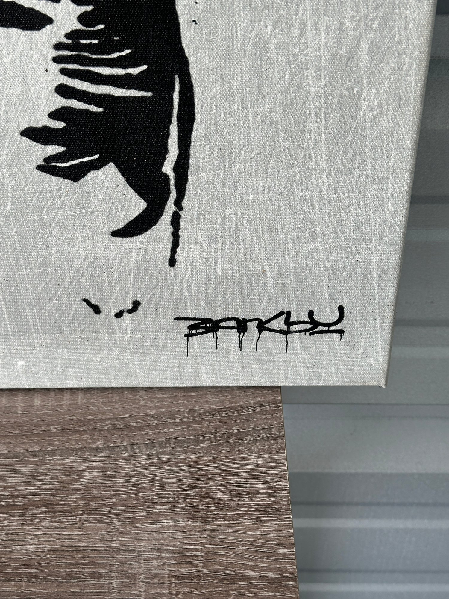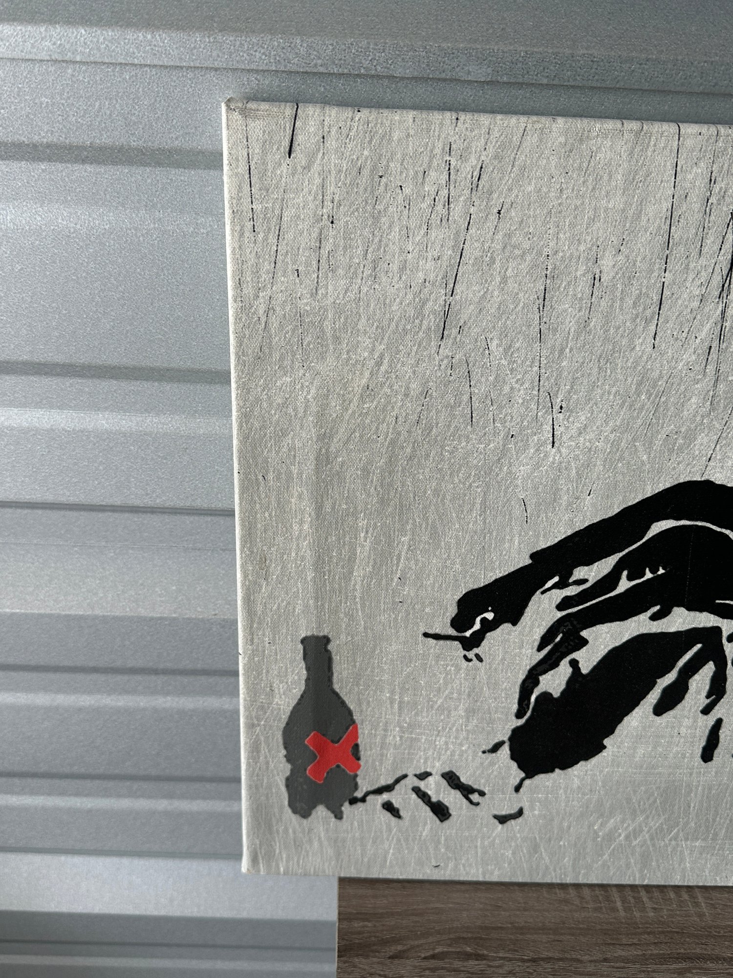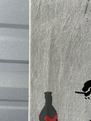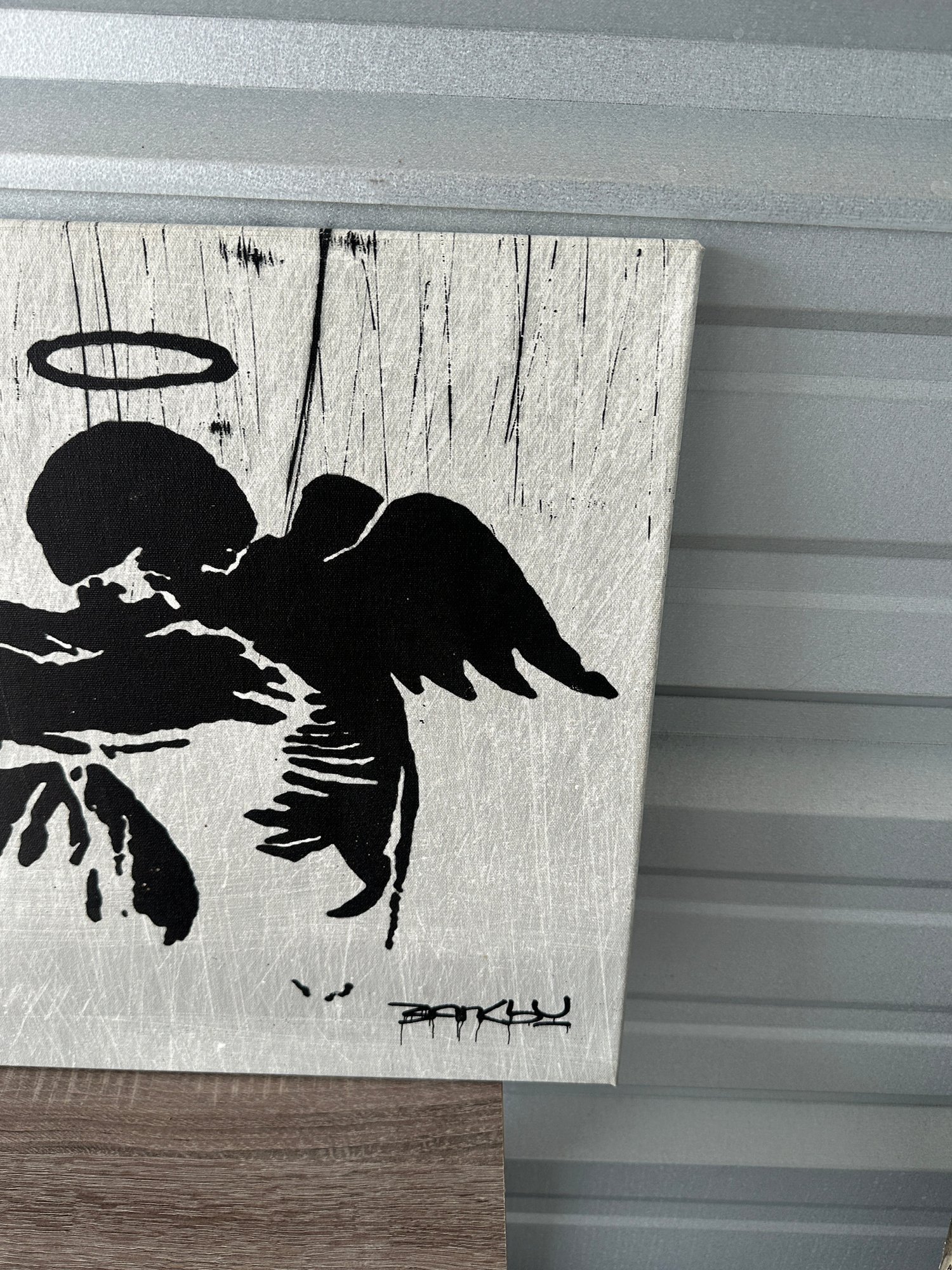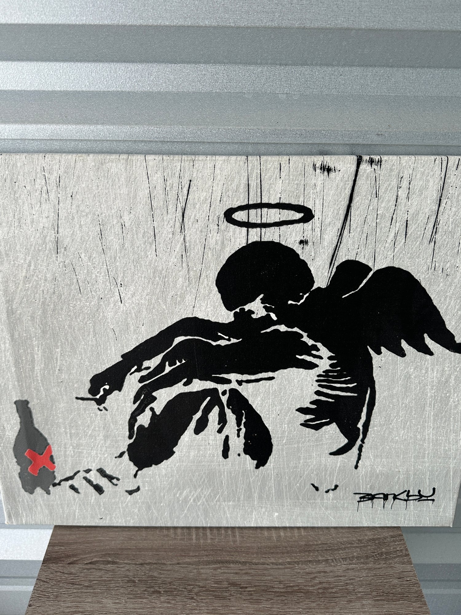 Striking Banksy-style street art canvas print featuring a fallen angel figure with halo and wings, paired with a minimalist bottle graphic. A bold and edgy piece that captures the raw, urban aesthetic associated with modern graffiti and protest art.