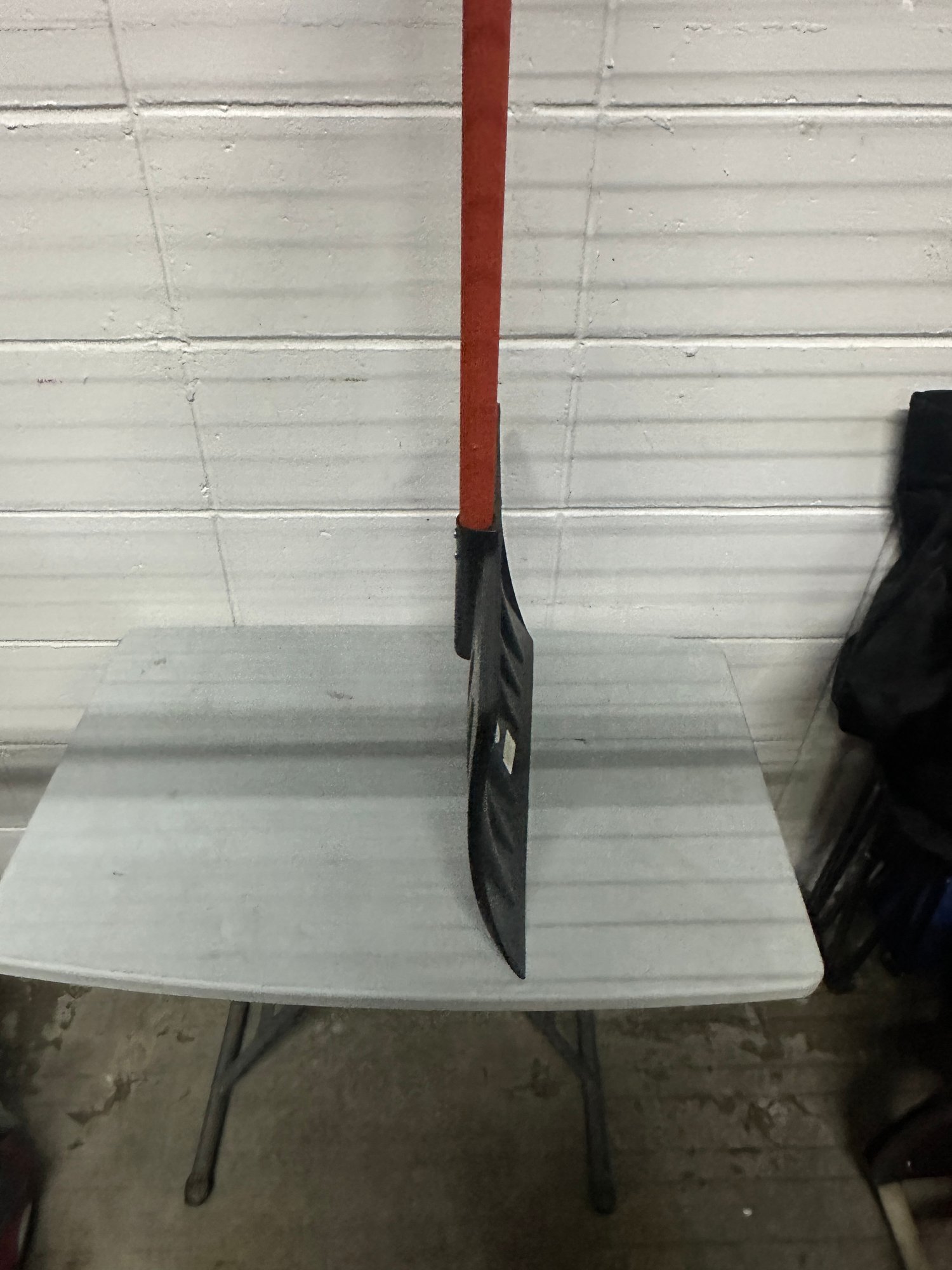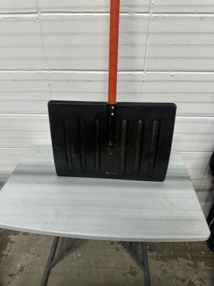 Durable Bigfoot wide snow shovel/pusher designed for efficiently clearing snow from driveways, sidewalks, and large surfaces.