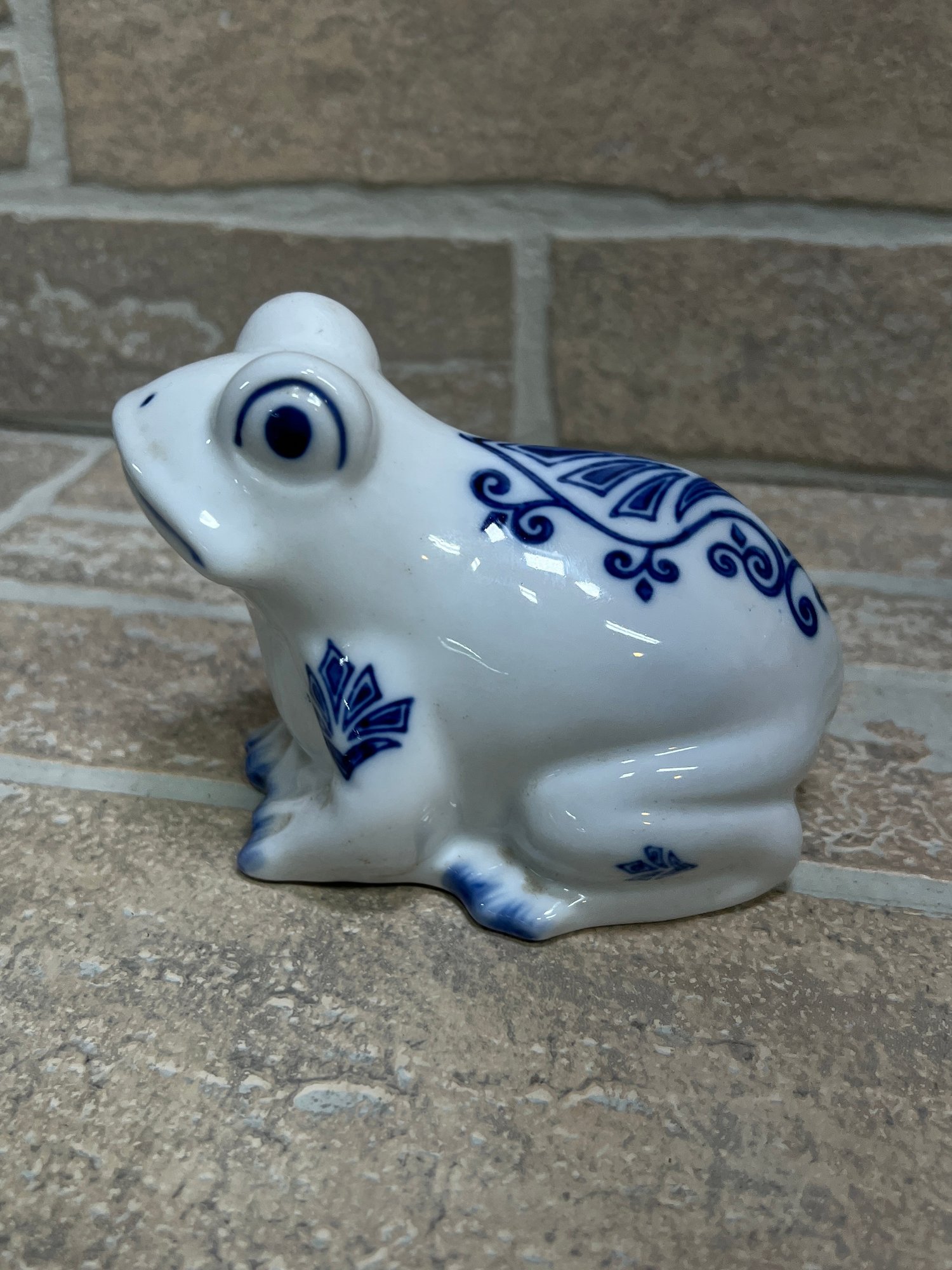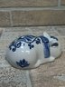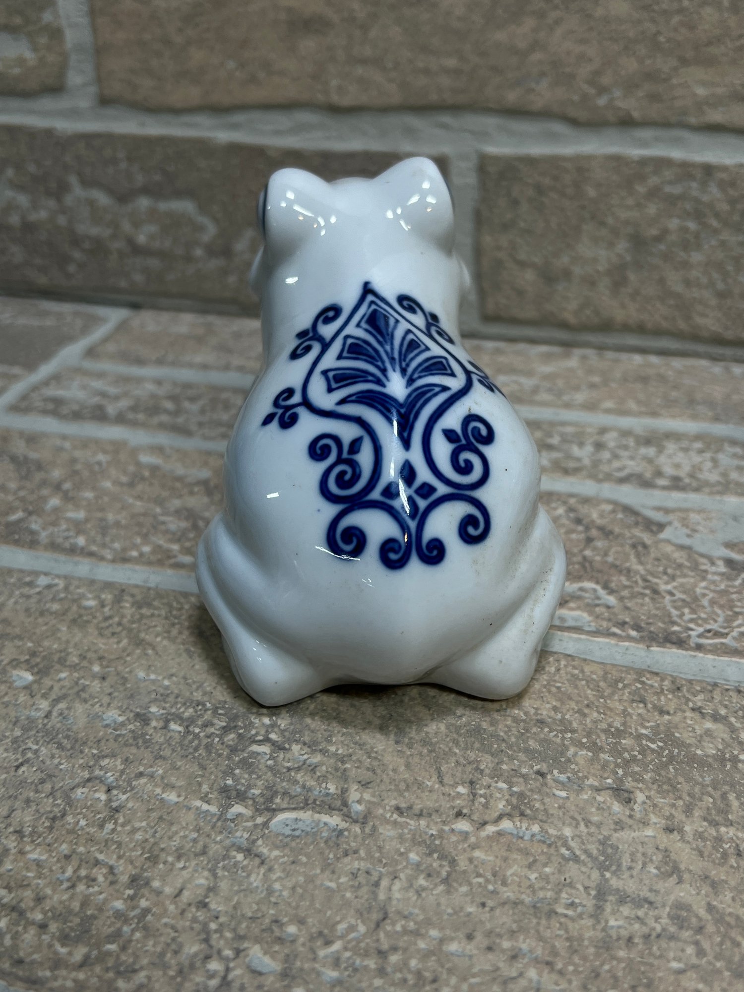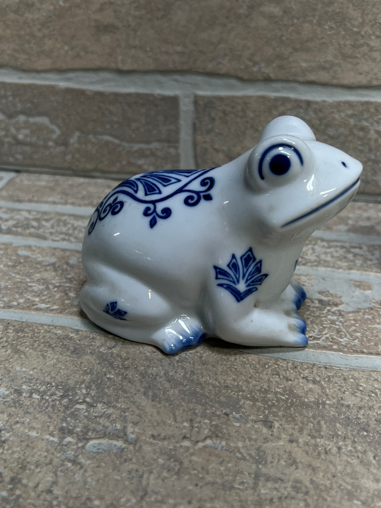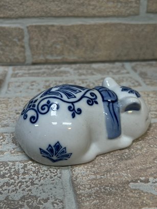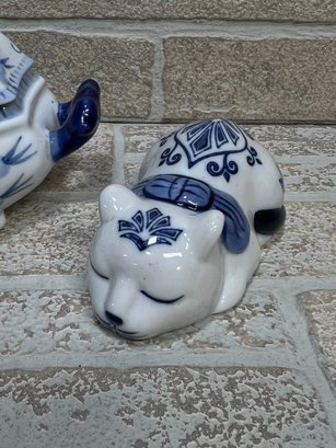 Charming lot of blue and white porcelain décor pieces including a sleeping cat figurine, frog figurine, and a lidded dish with handles. Each piece features classic blue floral and decorative patterns on a white glazed background.