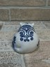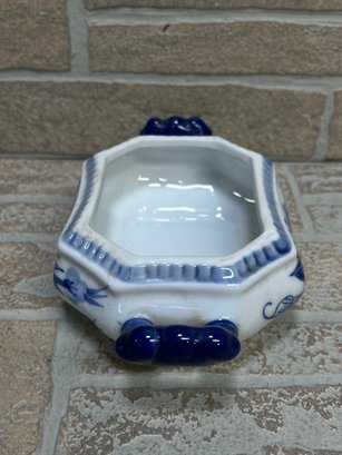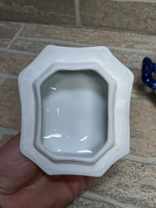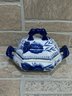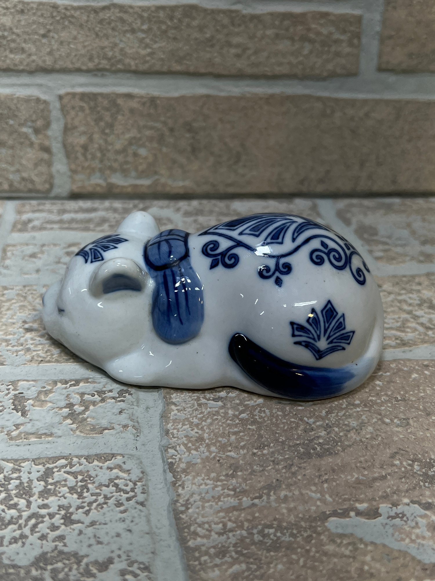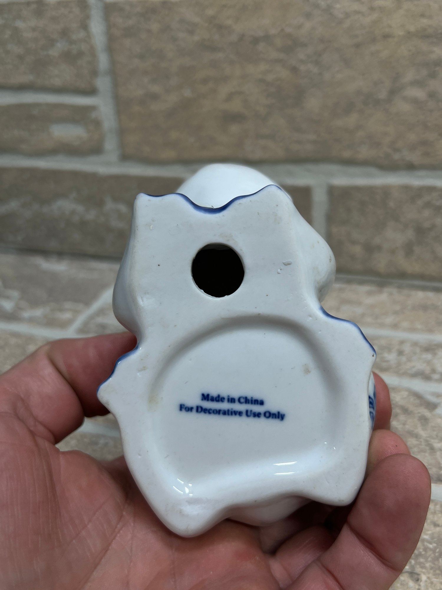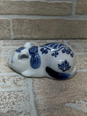 Charming lot of blue and white porcelain décor pieces including a sleeping cat figurine, frog figurine, and a lidded dish with handles. Each piece features classic blue floral and decorative patterns on a white glazed background.