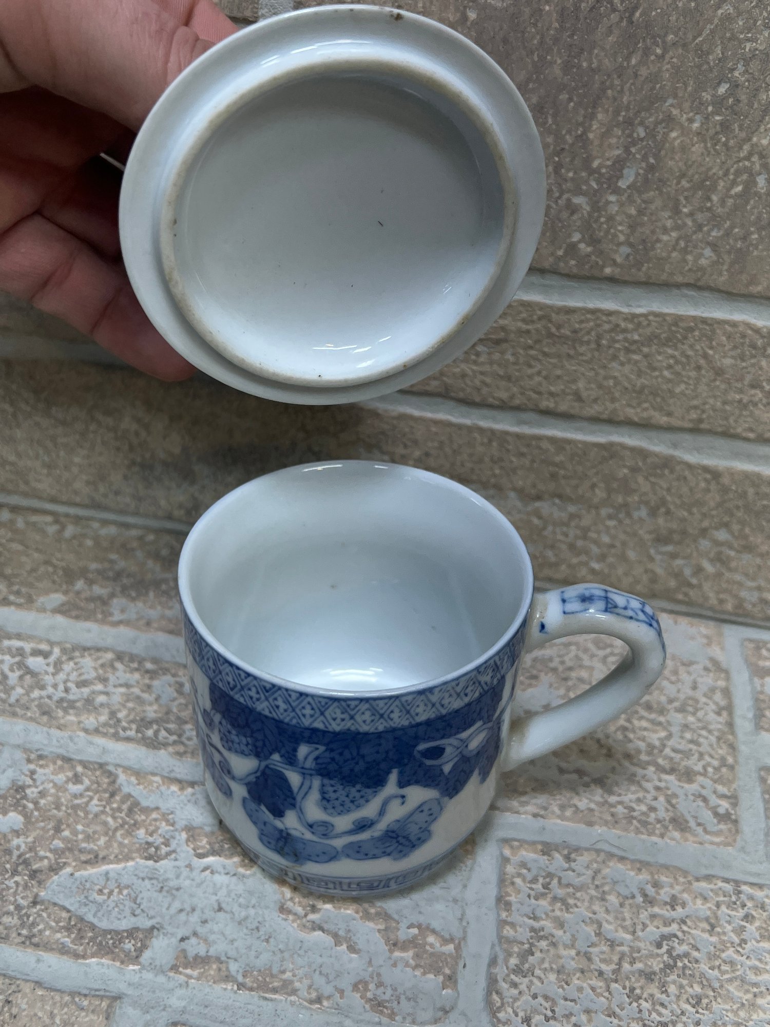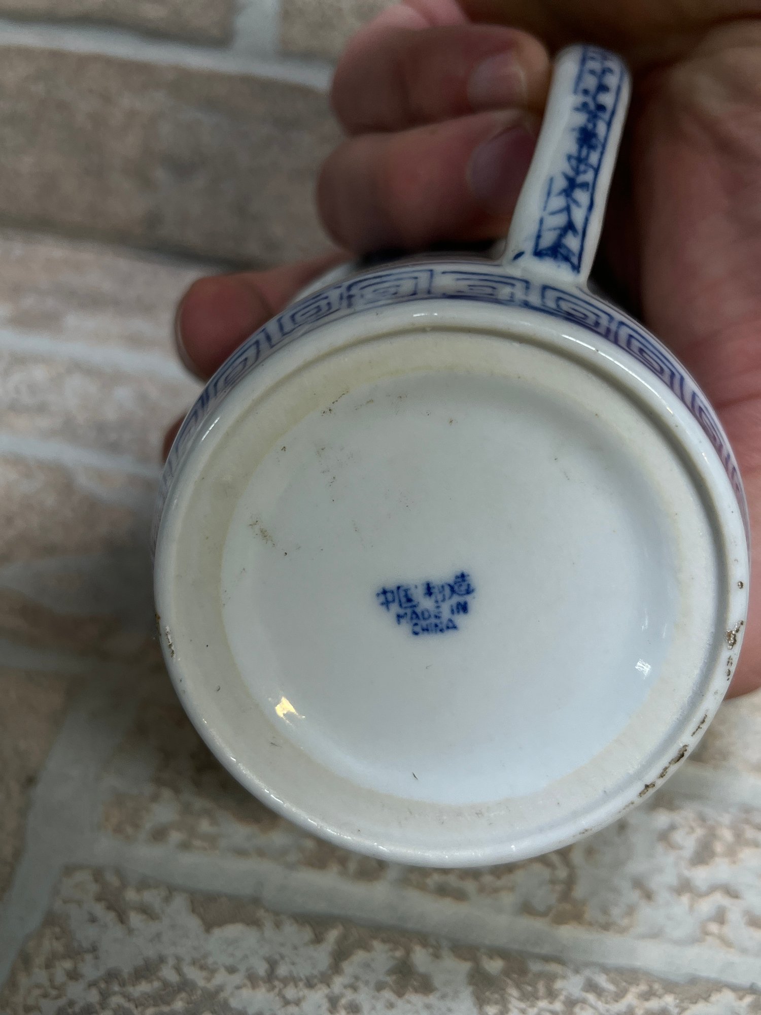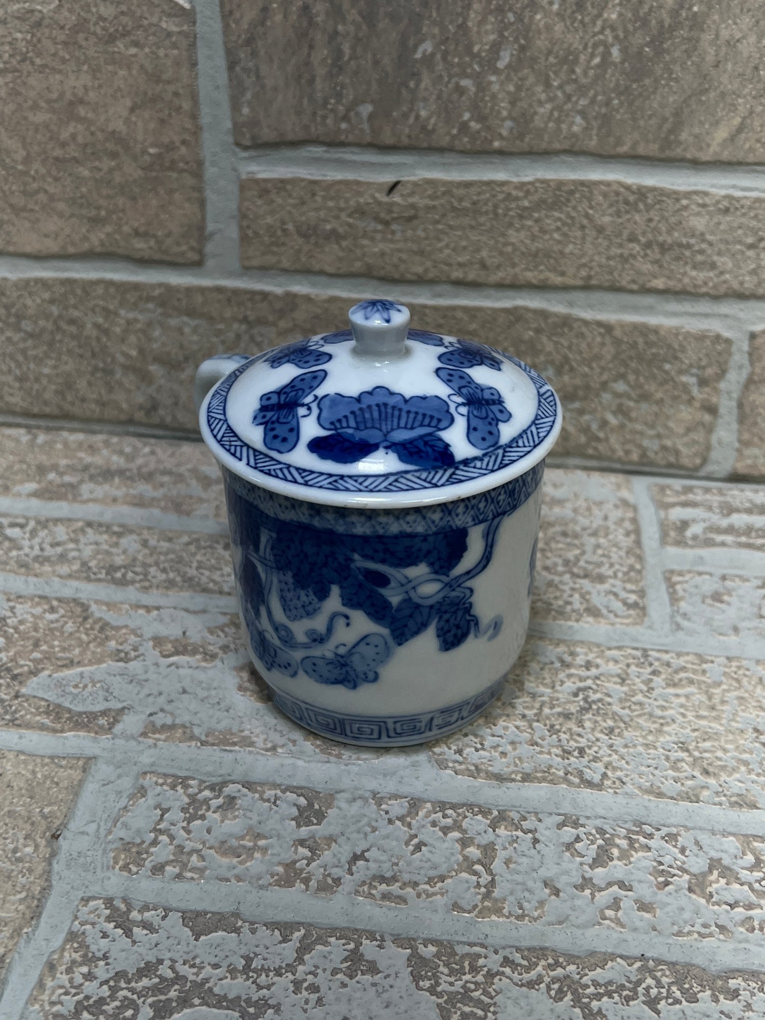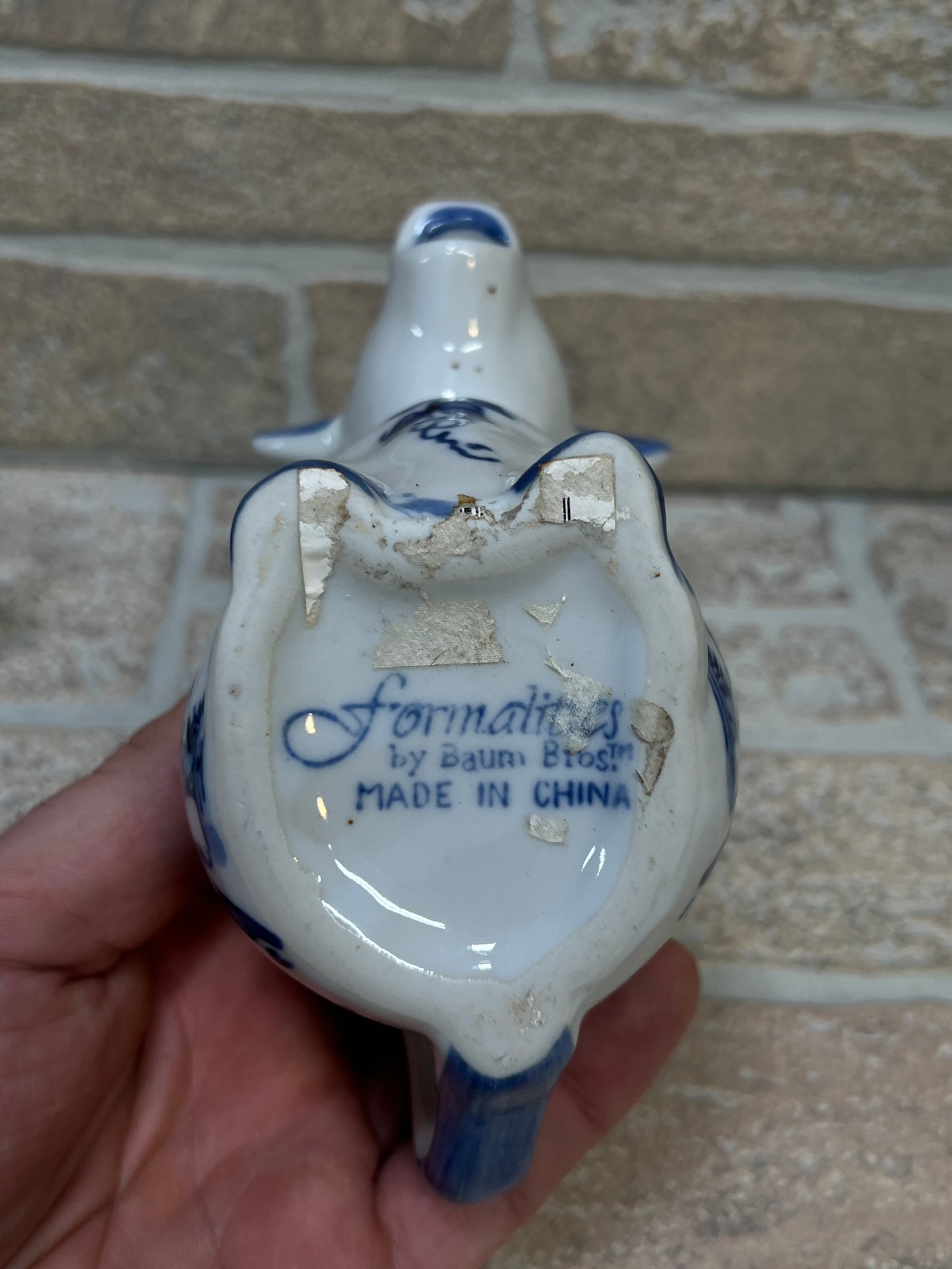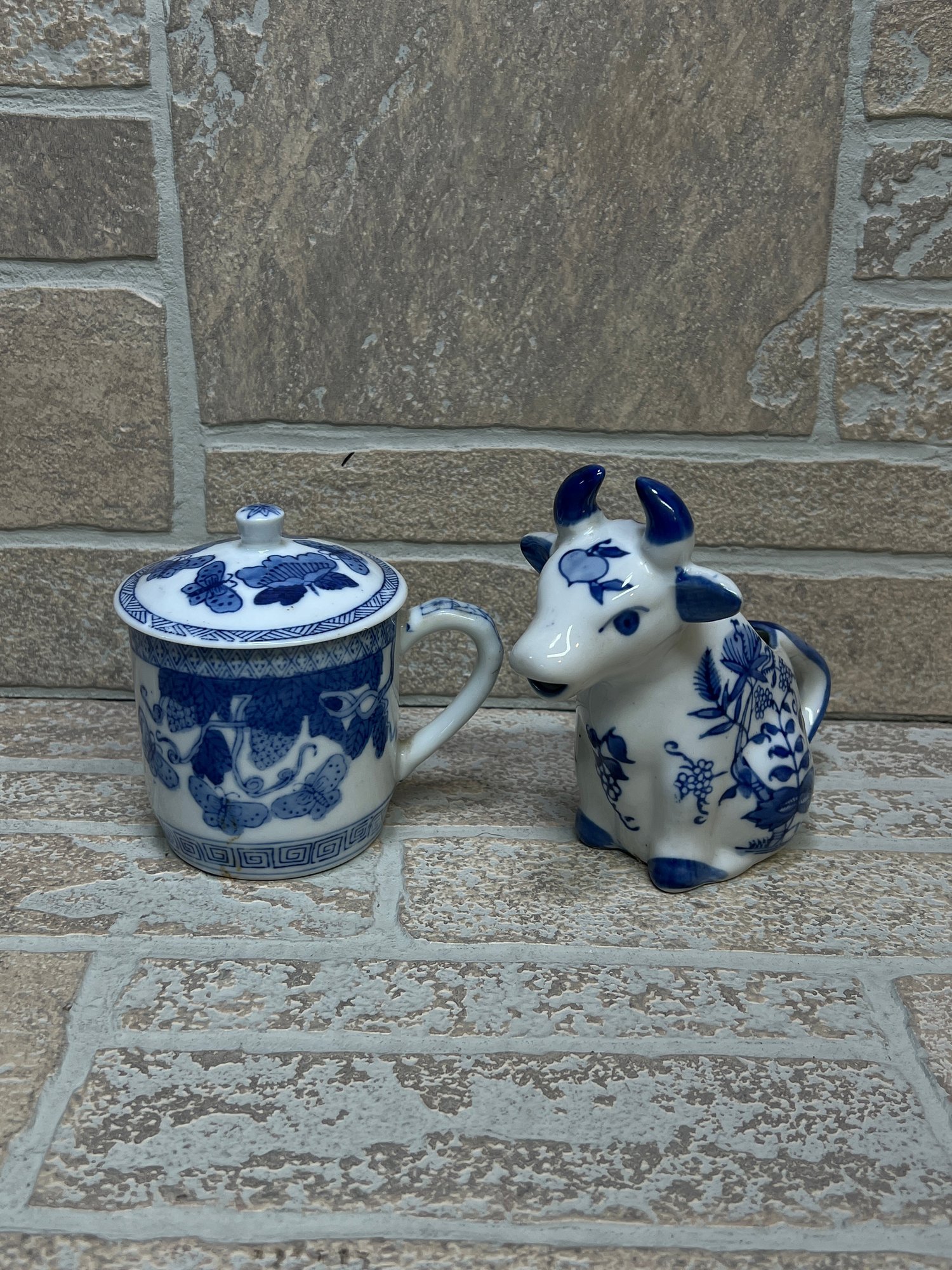 The cow creamer is marked “Formations by Baum Bros – Made in China” on the underside. The lidded cup features a traditional decorative pattern with butterflies and scrolling vine designs, marked “Made in China.”