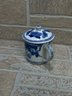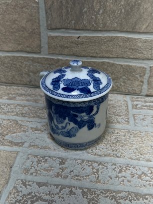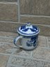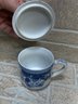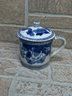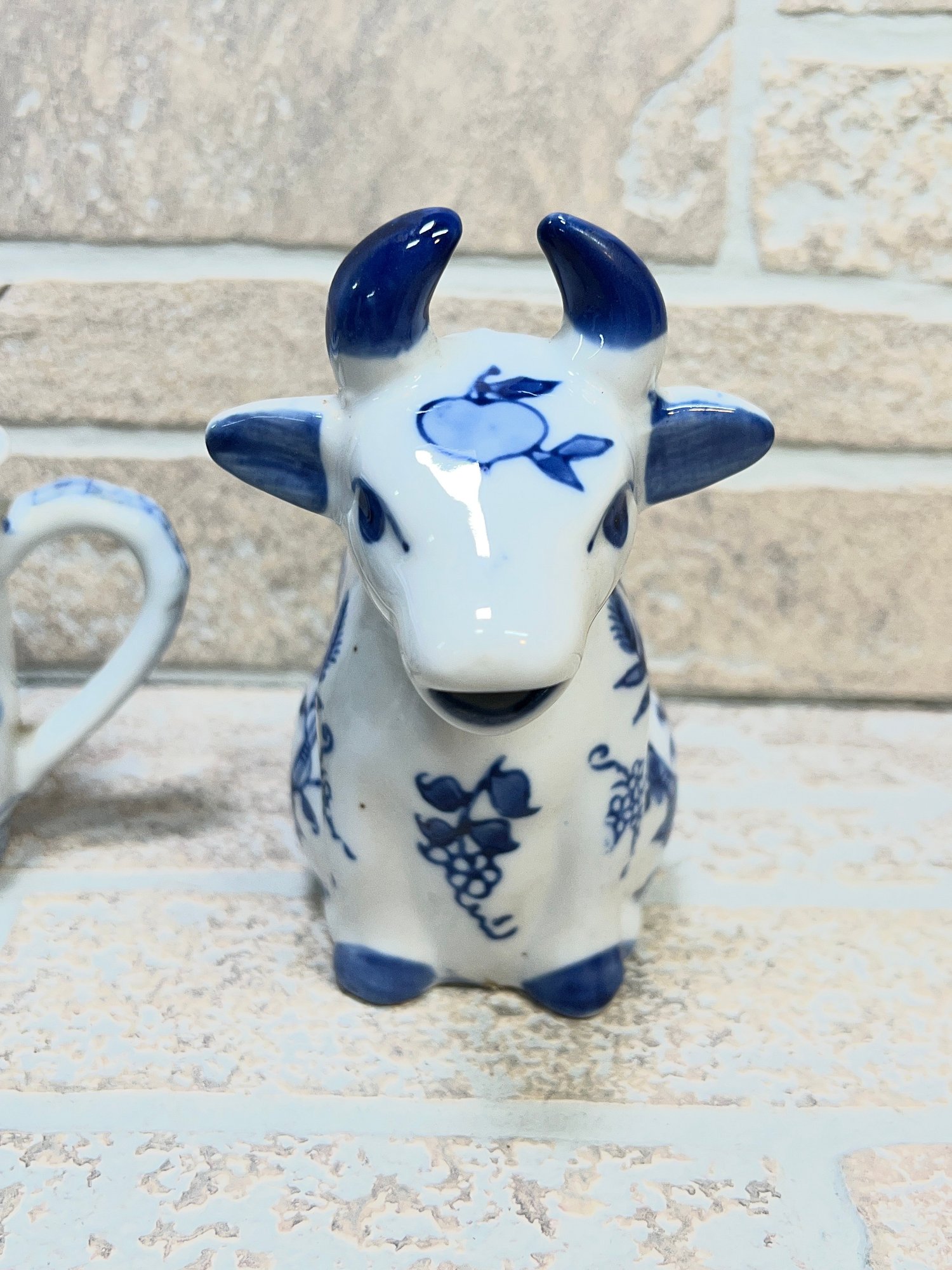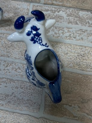 Charming blue and white porcelain set featuring a whimsical cow-shaped creamer/pitcher paired with a matching lidded tea cup. Both pieces showcase classic Asian-inspired floral and vine motifs in cobalt blue on a white background.