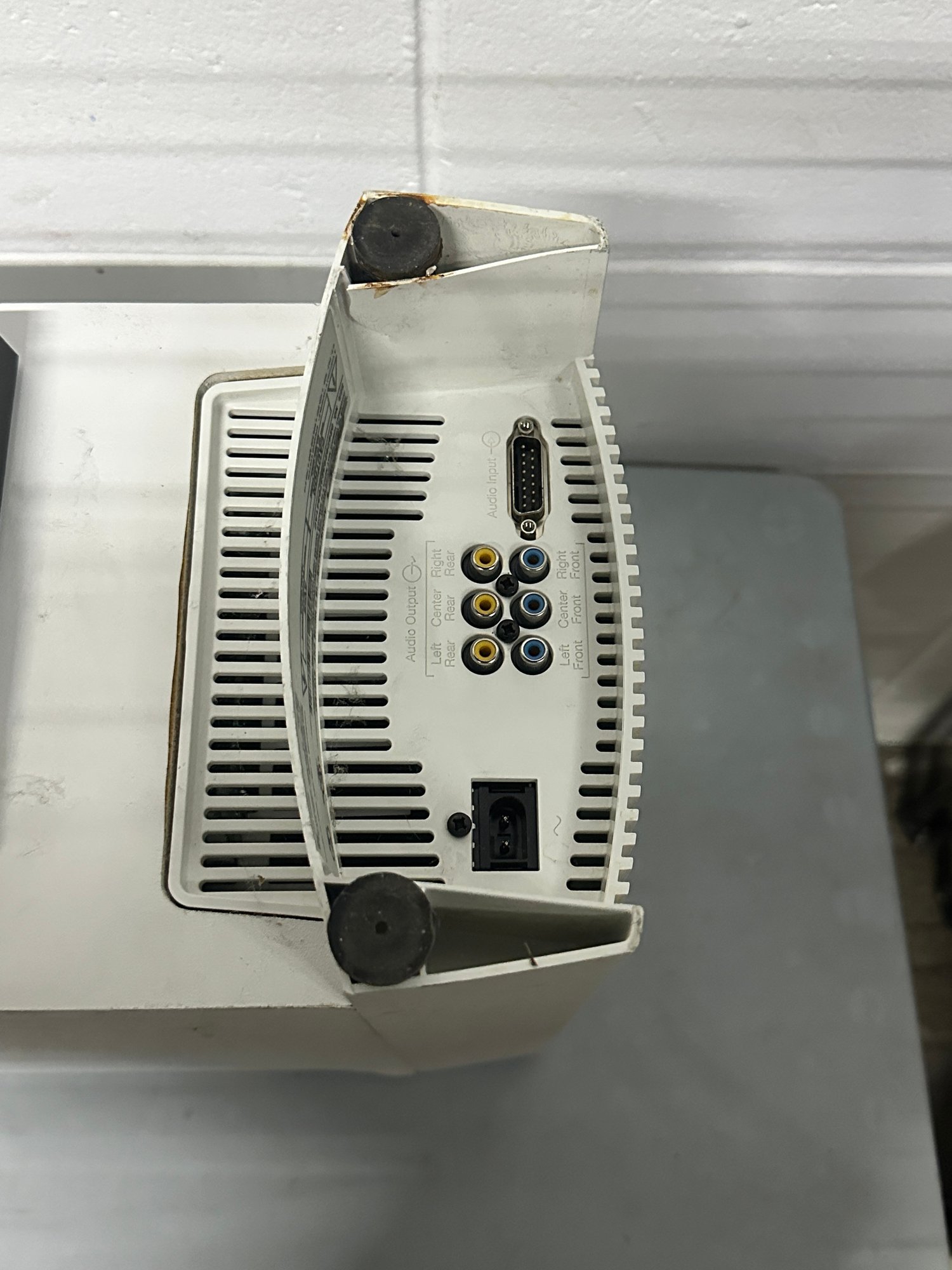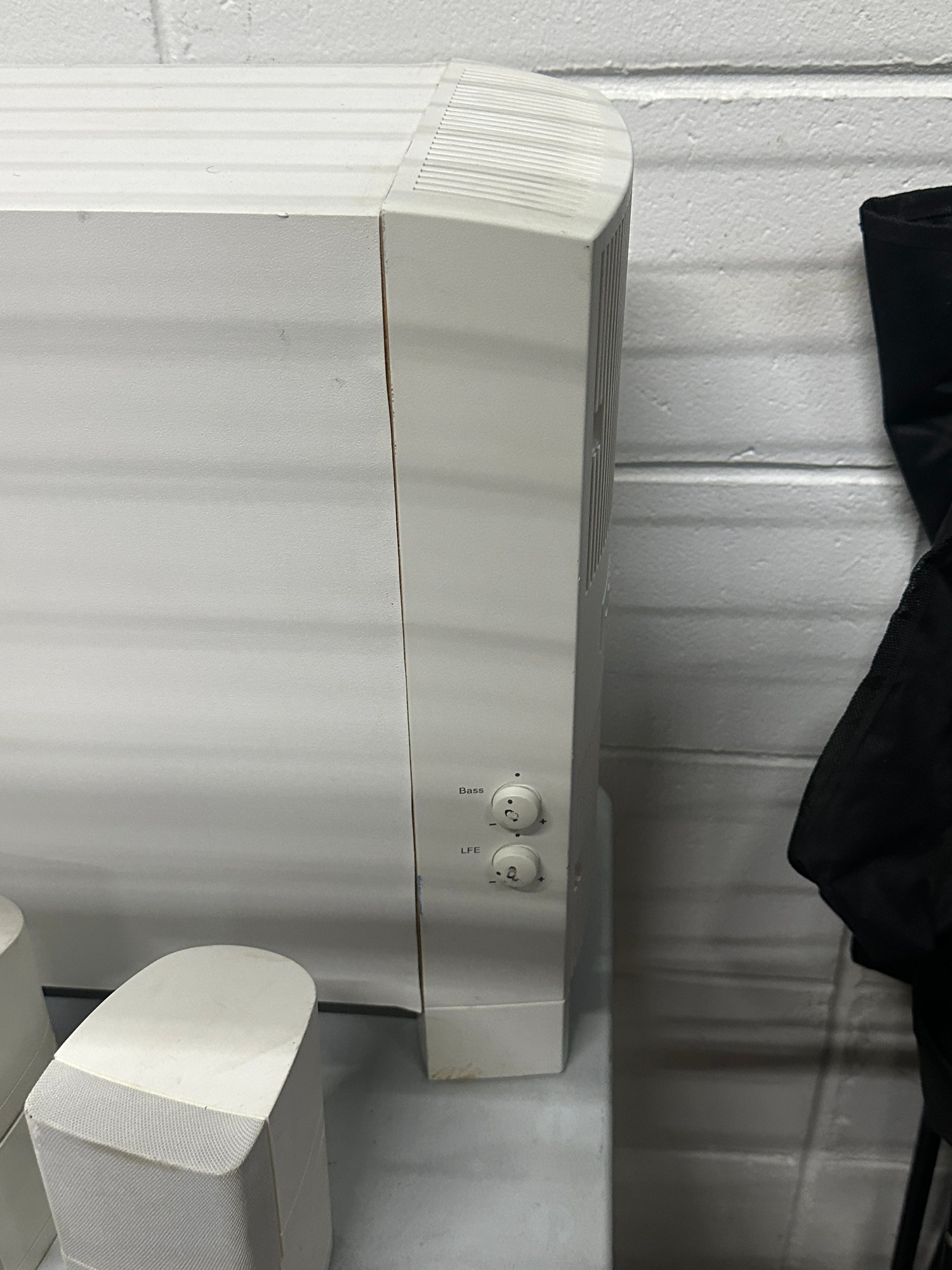 Notes: Untested / functionality unknown Cosmetic wear throughout: Dirt, scuffs, discoloration on speakers Some fabric grille wear and marks Subwoofer casing has visible wear and damage to outer covering General signs of use/storage May require cleaning, repair, or parts (See photos for full condition details)