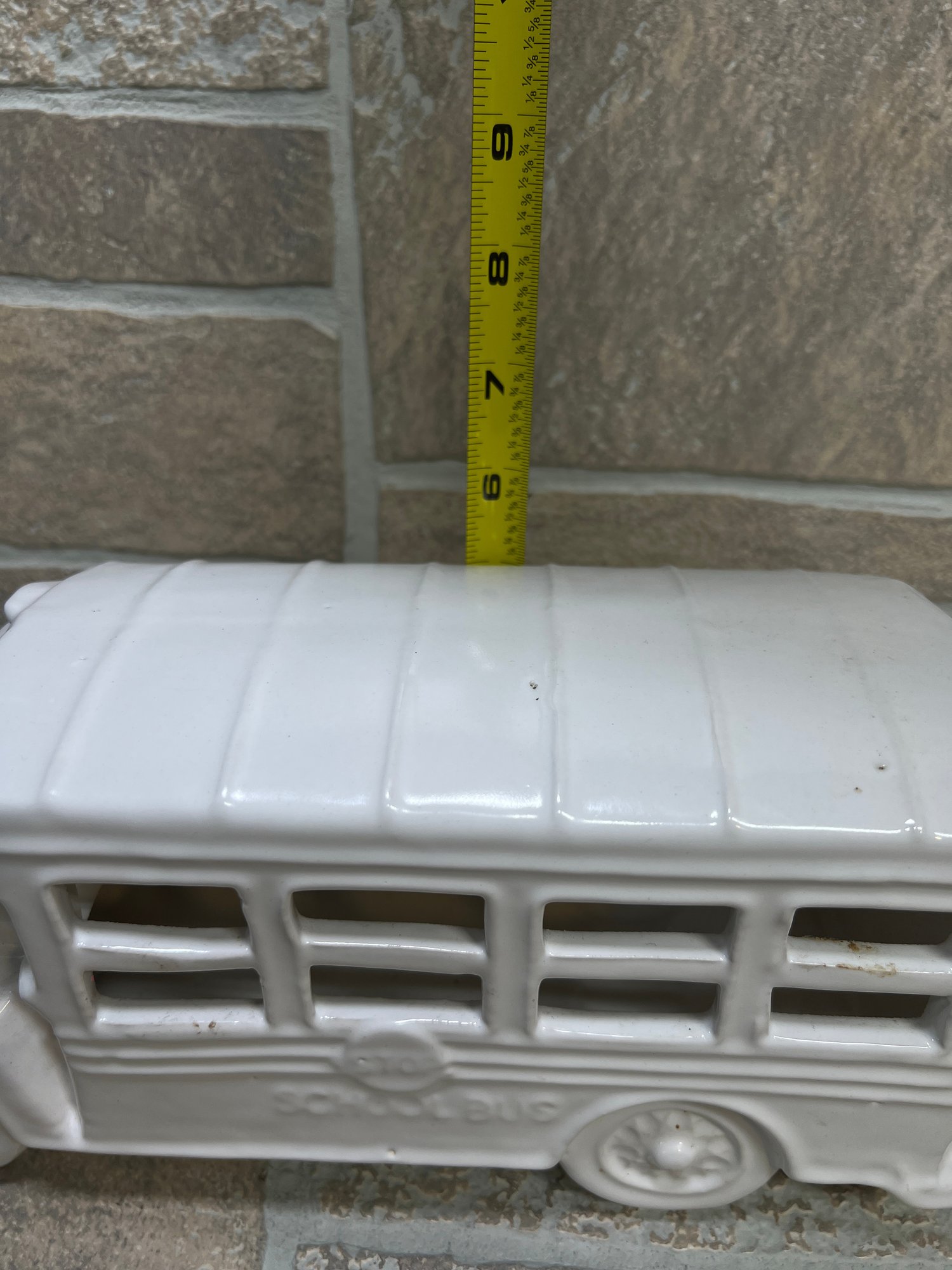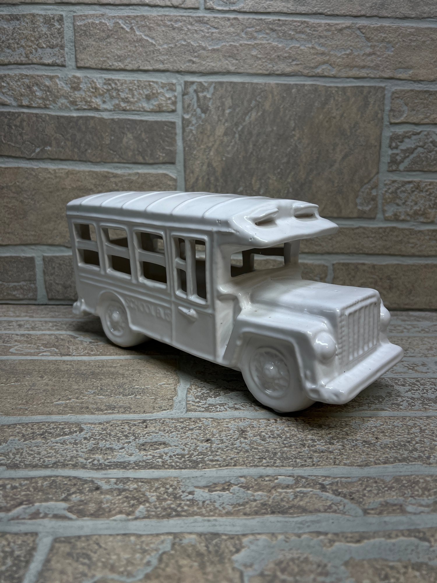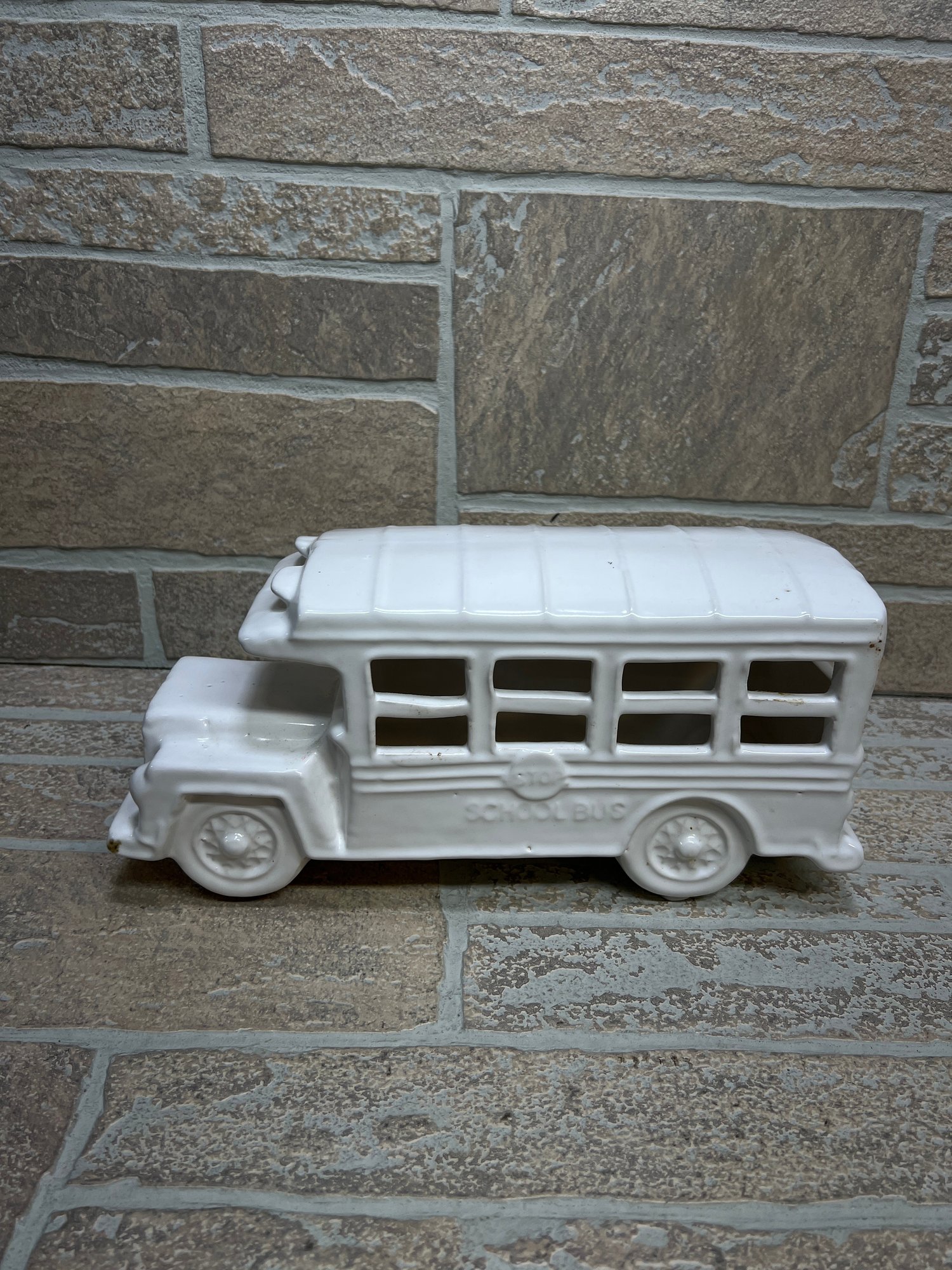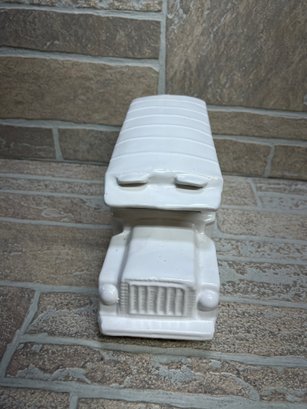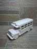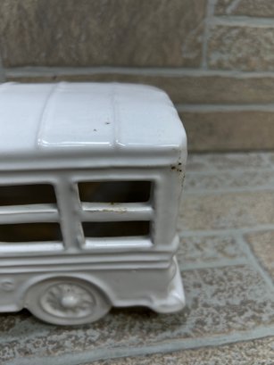 White ceramic school bus coin bank / decorative piece with molded details and glossy finish.