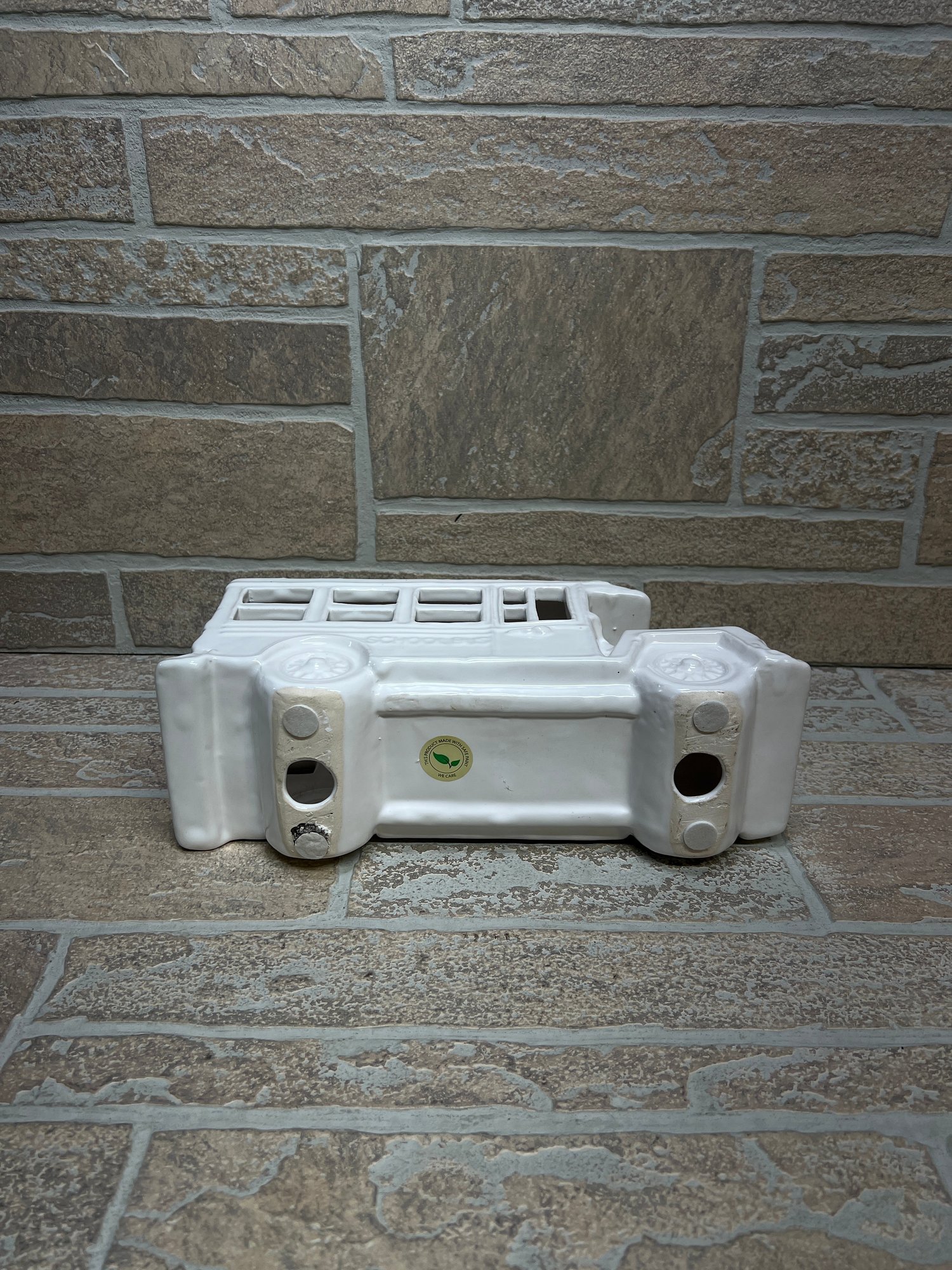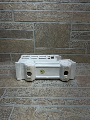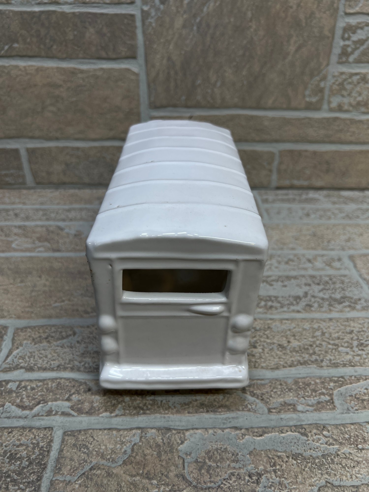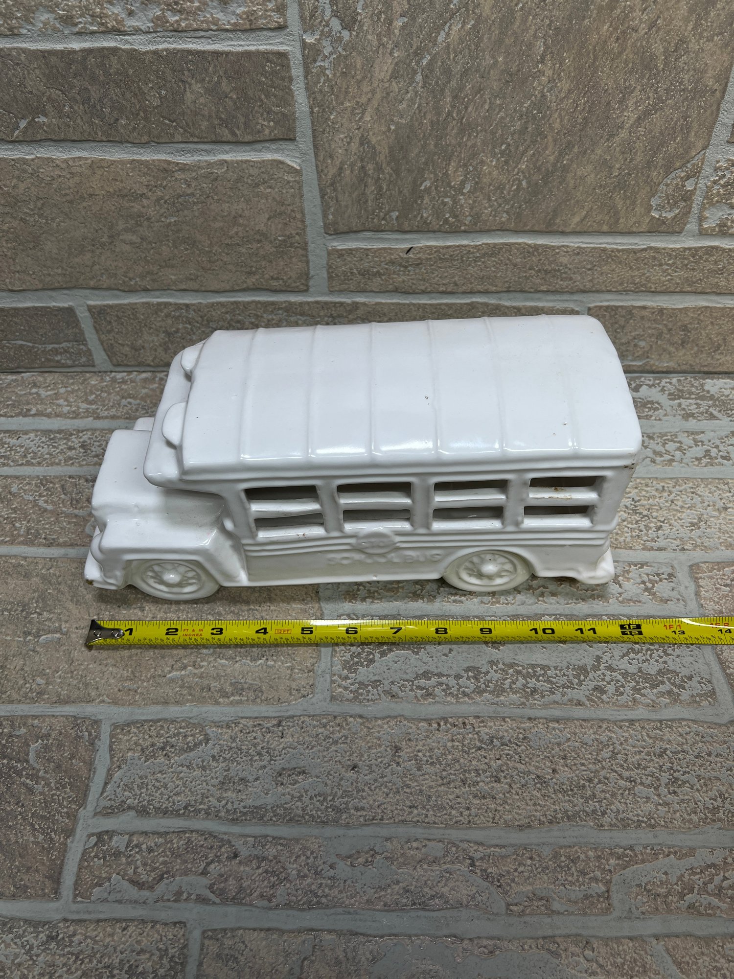 White ceramic school bus coin bank / decorative piece with molded details and glossy finish.