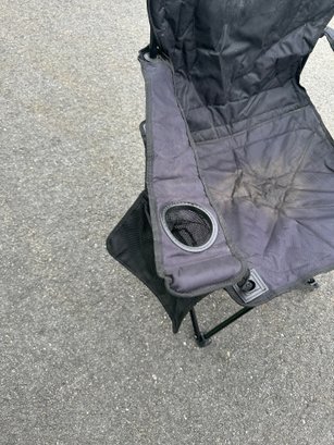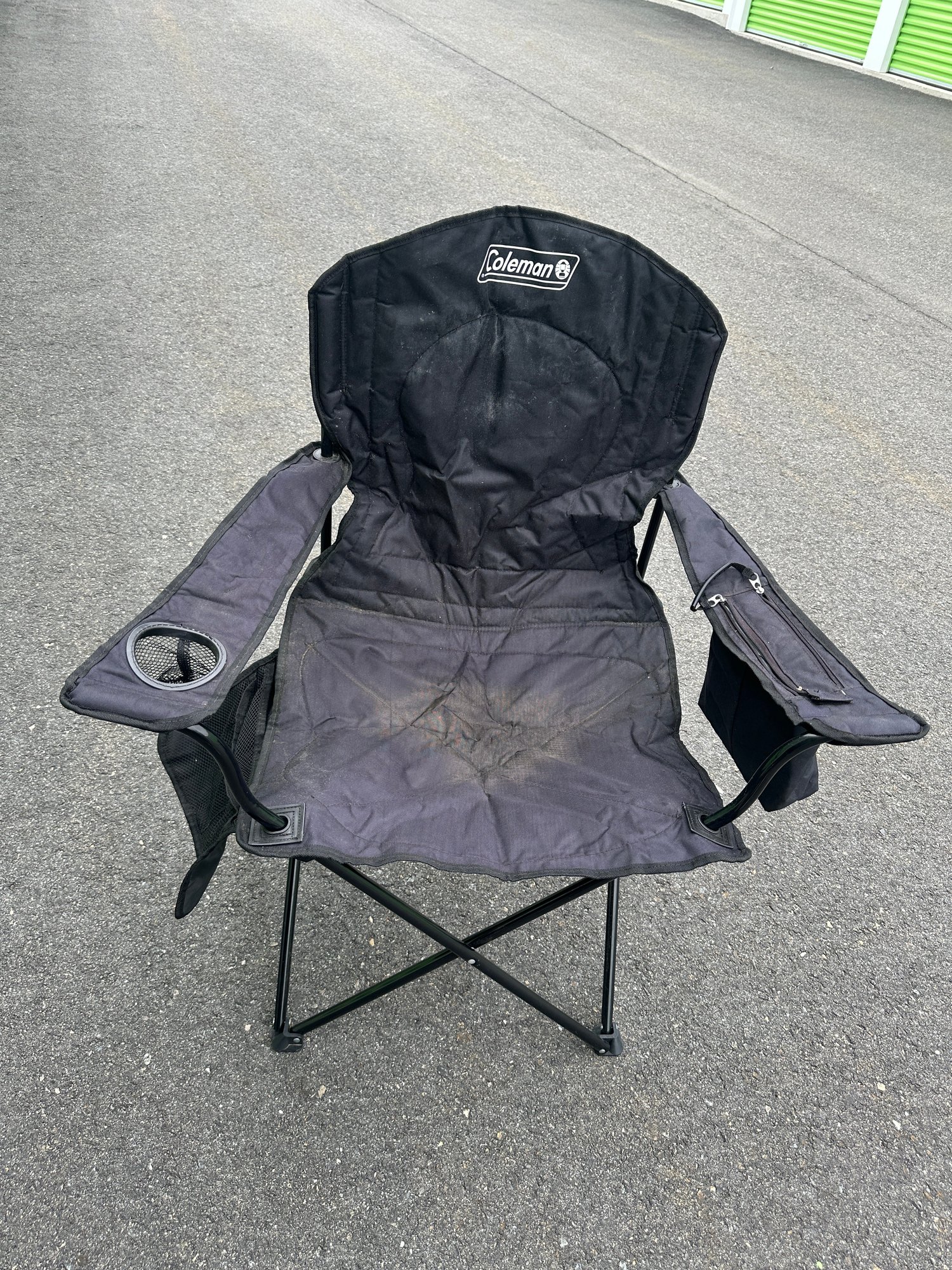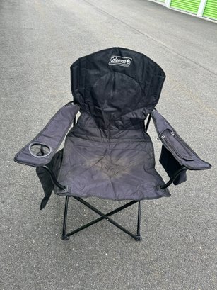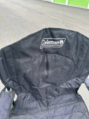 Coleman folding camping chair with built-in cup holder and side storage pocket. Includes original carry bag for easy transport.