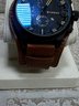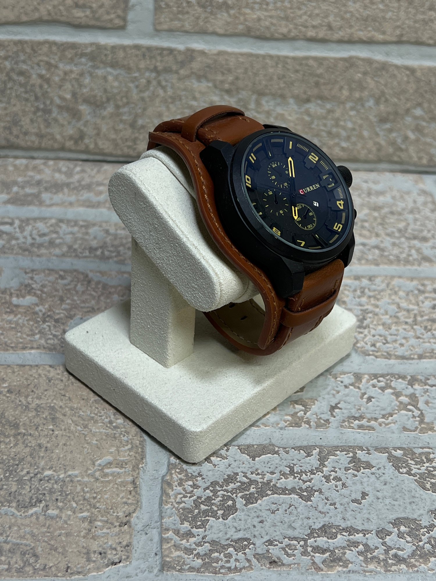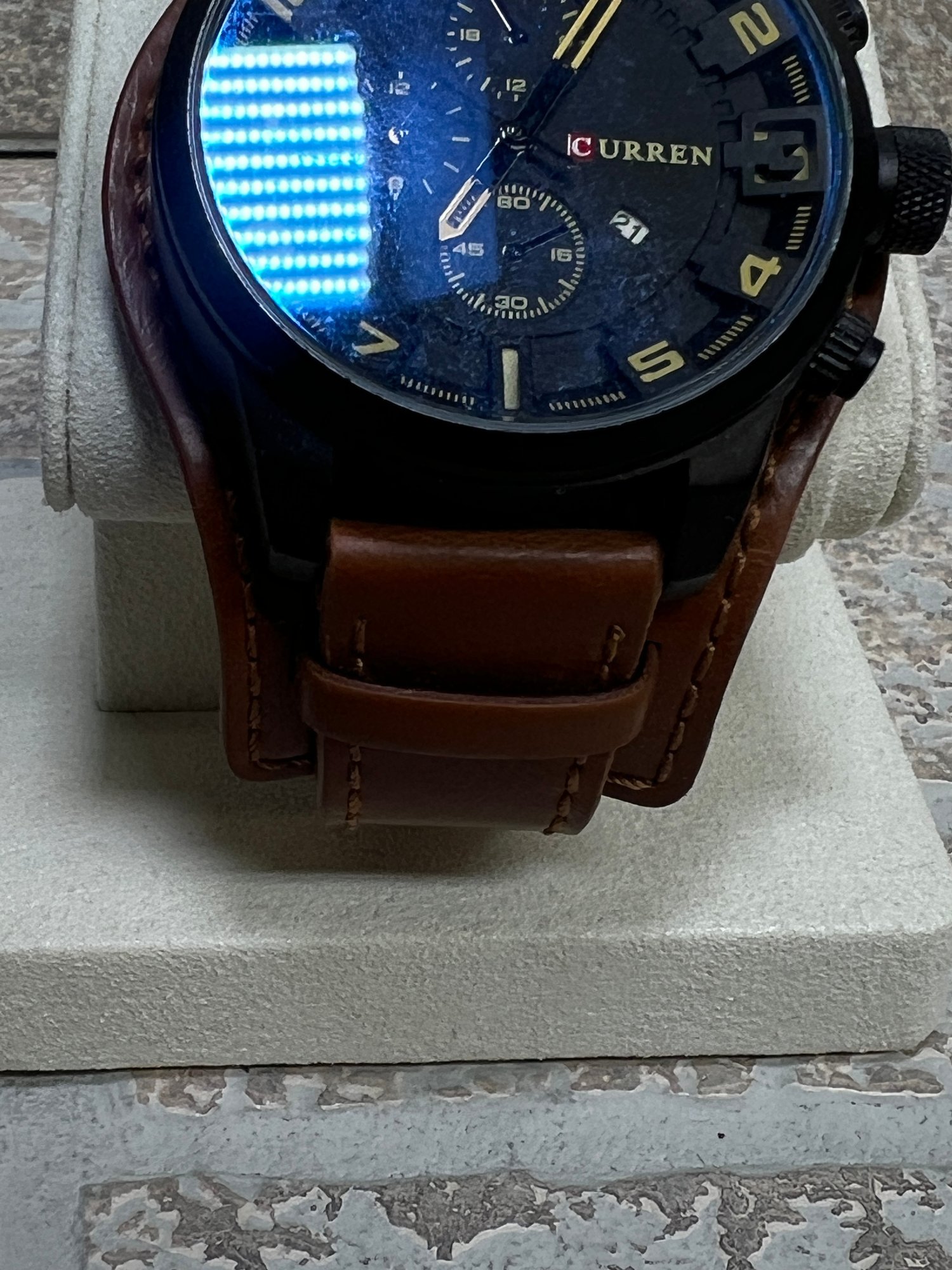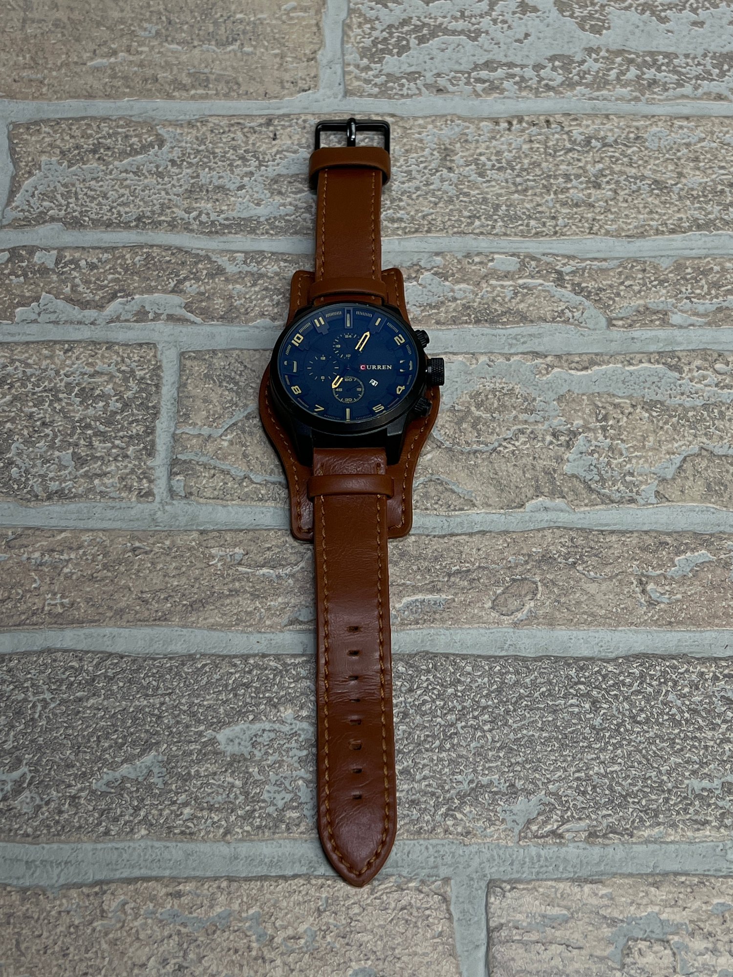 Notes: curren, watch, mens watch, chronograph, quartz watch, leather strap, blue dial, wristwatch, fashion watch, analog watch, date watch, black case, brown leather, gift