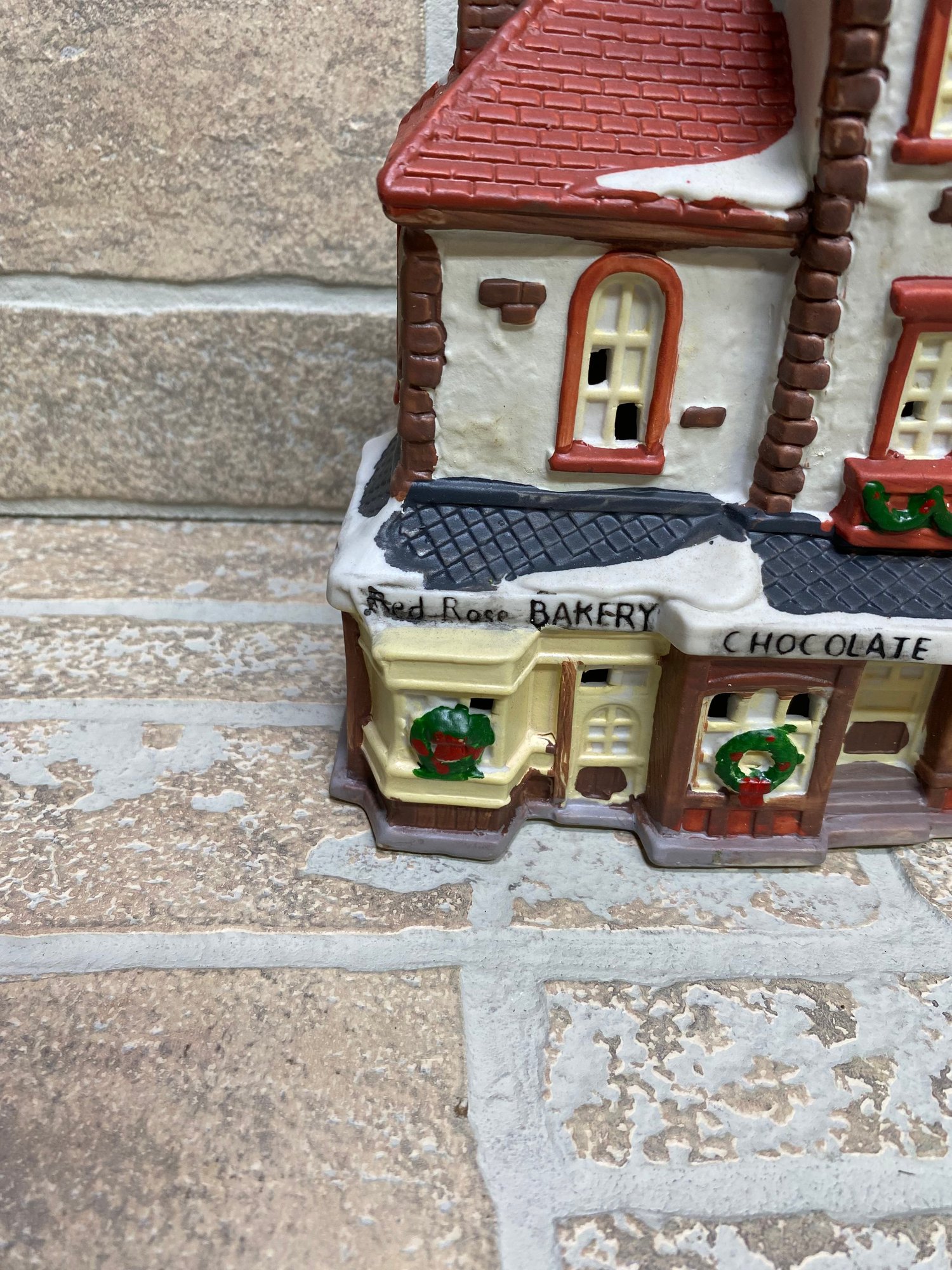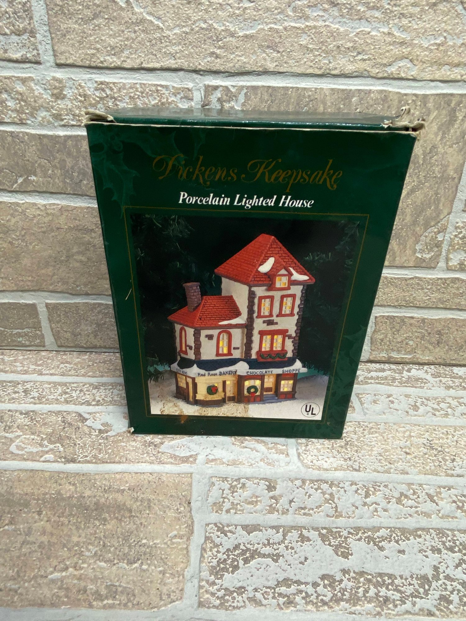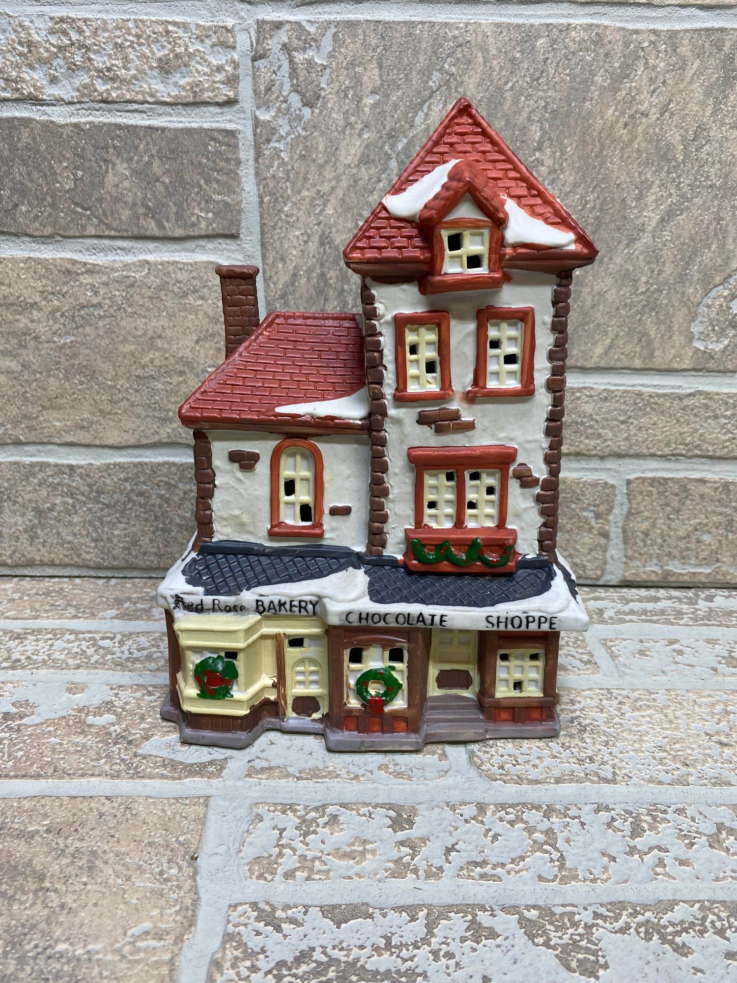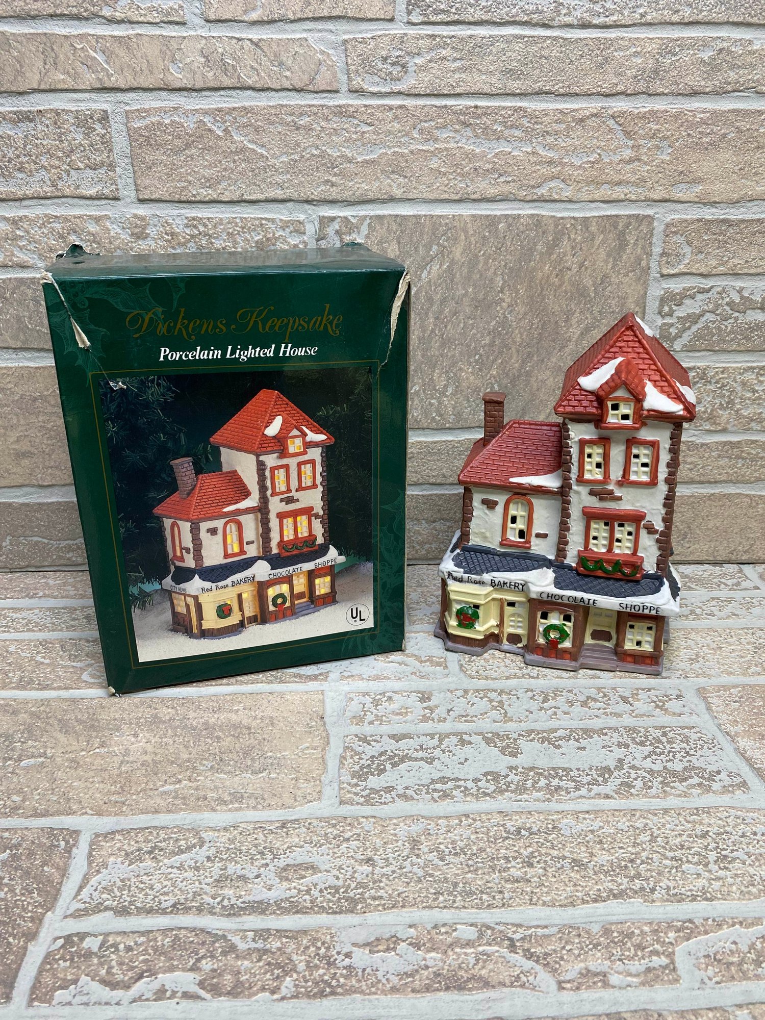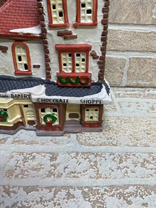 Charming Dickens Keepsake porcelain lighted house featuring a detailed “Red Rose Bakery Chocolate Shoppe” storefront. A classic addition to any Christmas village display, with festive wreath accents, snow-covered rooflines, and warm glowing windows when lit.