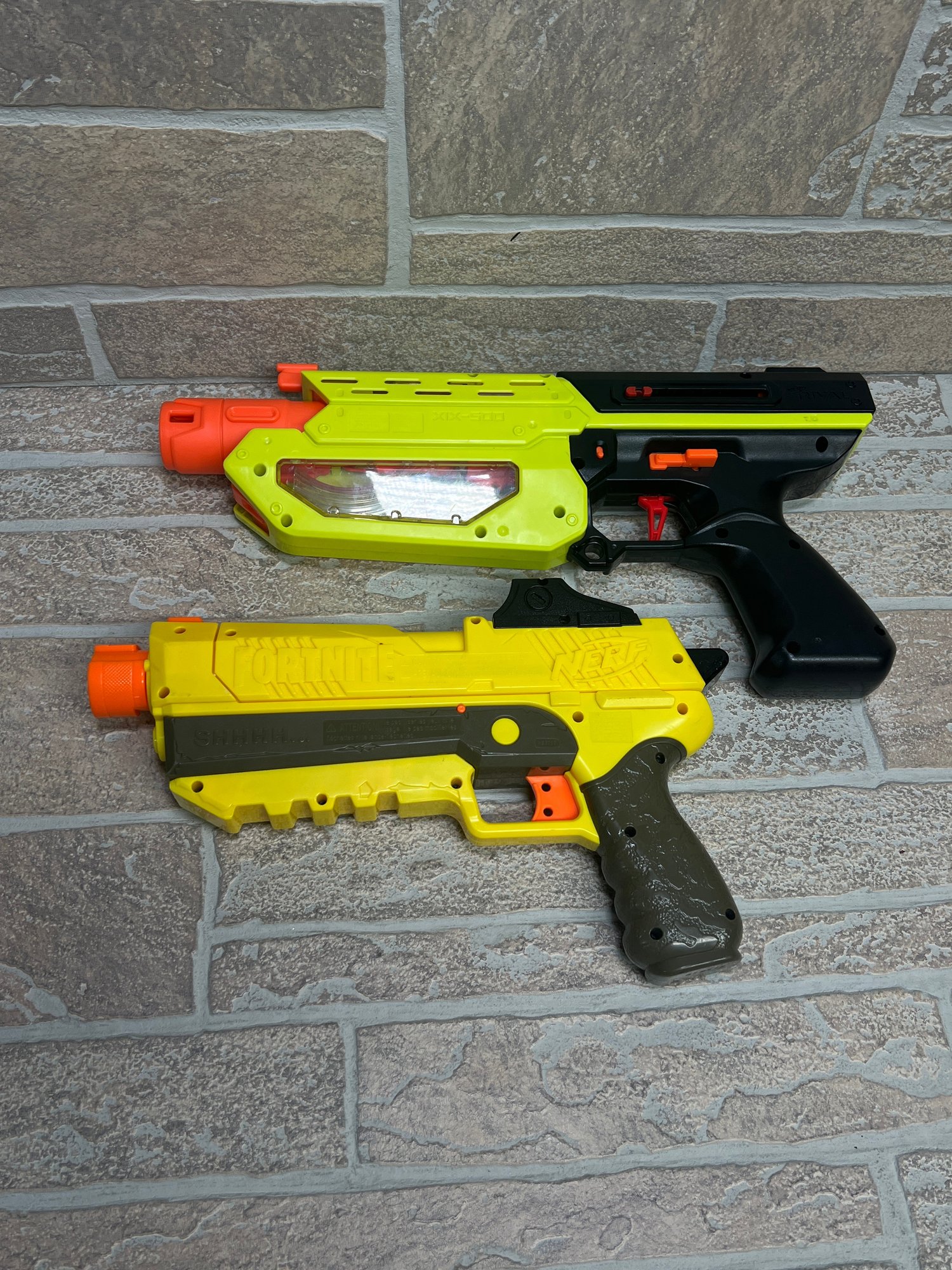 Lot of 2 Nerf toy blasters including a Nerf Rival XIX-500 and a Nerf Fortnite-themed pistol blaster.