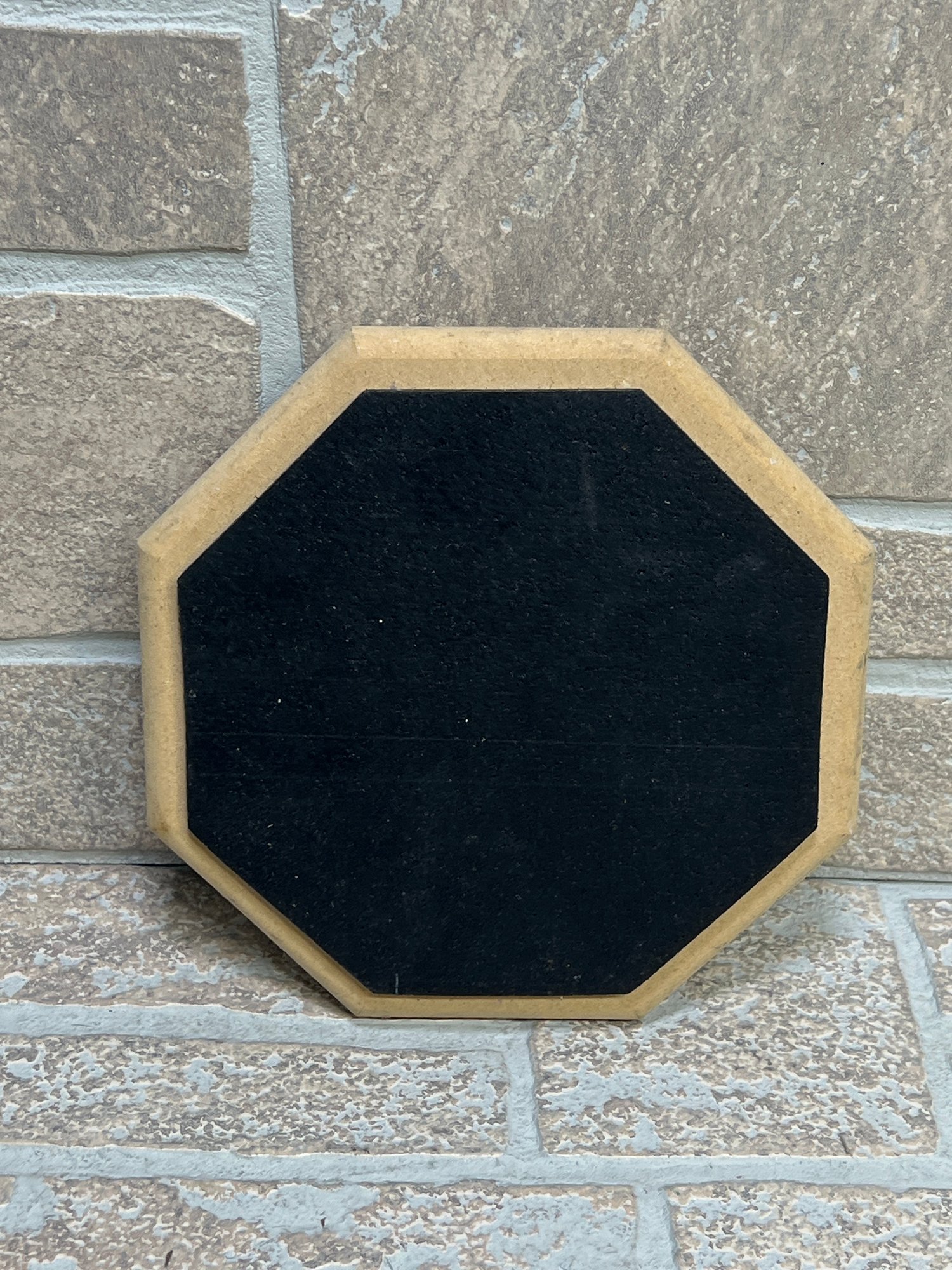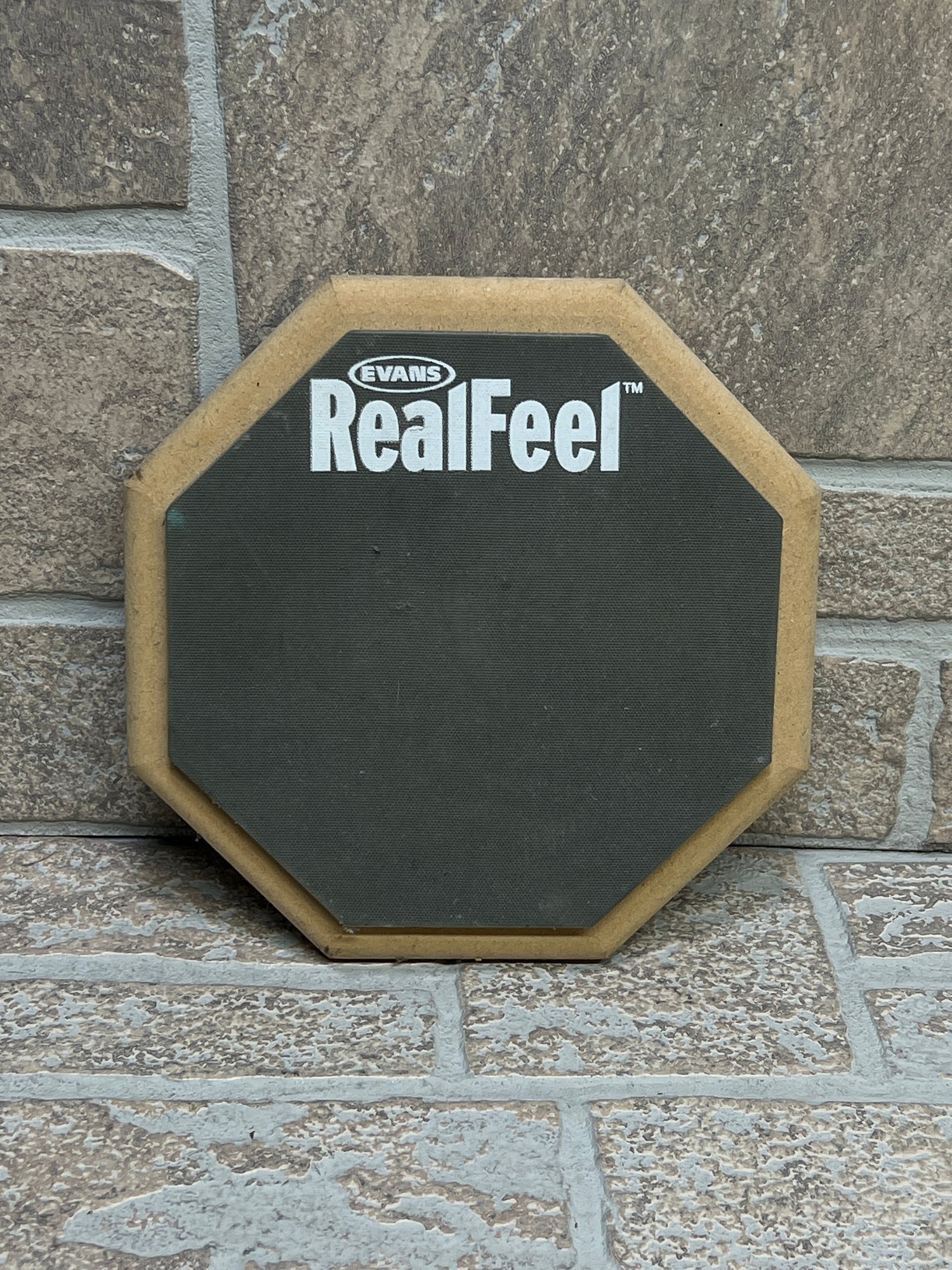 Evans RealFeel drum practice pad with octagonal shape and black playing surface. Designed for realistic stick rebound and quiet practice. Compact size is great for drummers, students, or percussion practice at home or on the go.