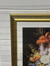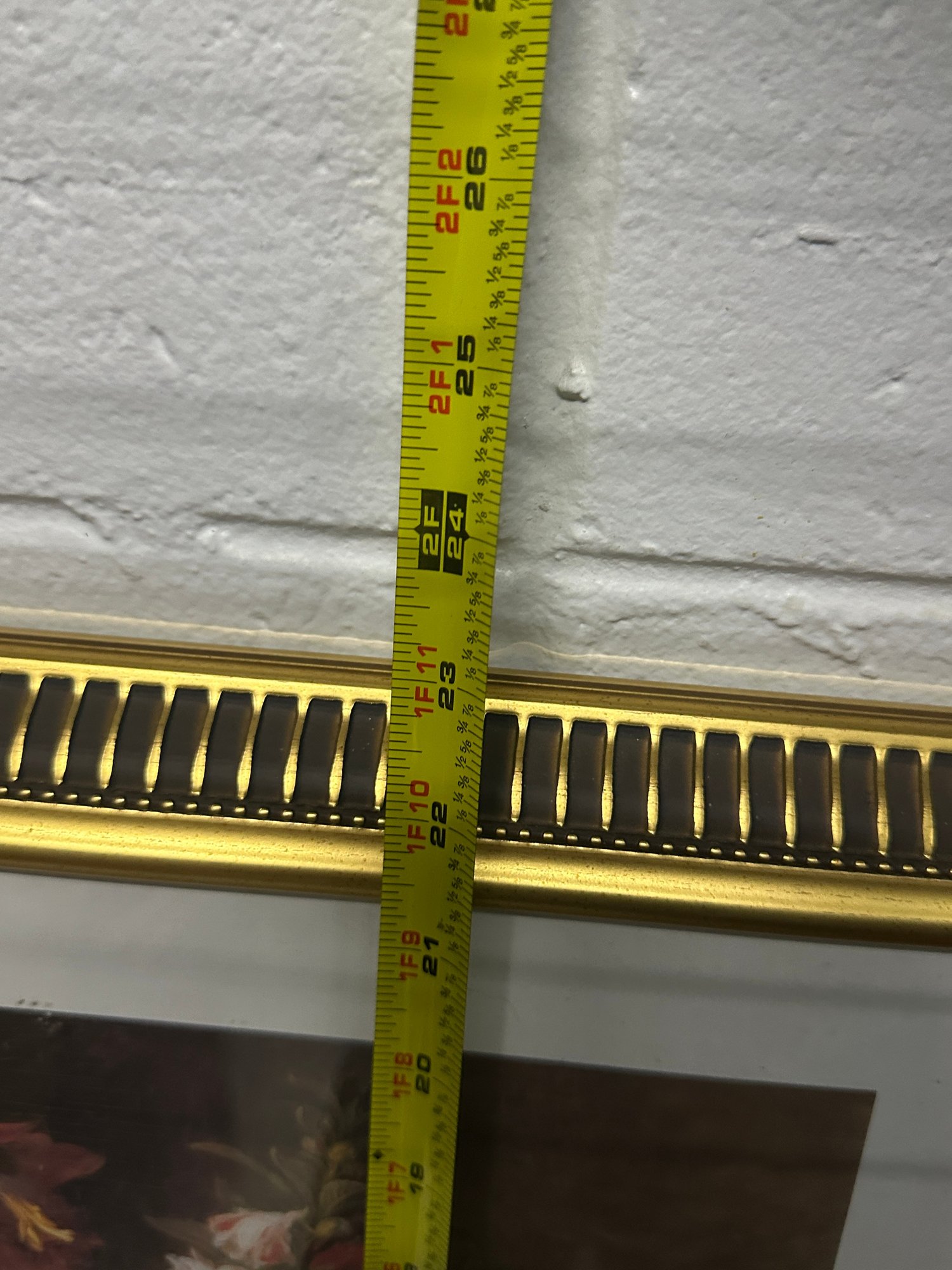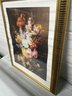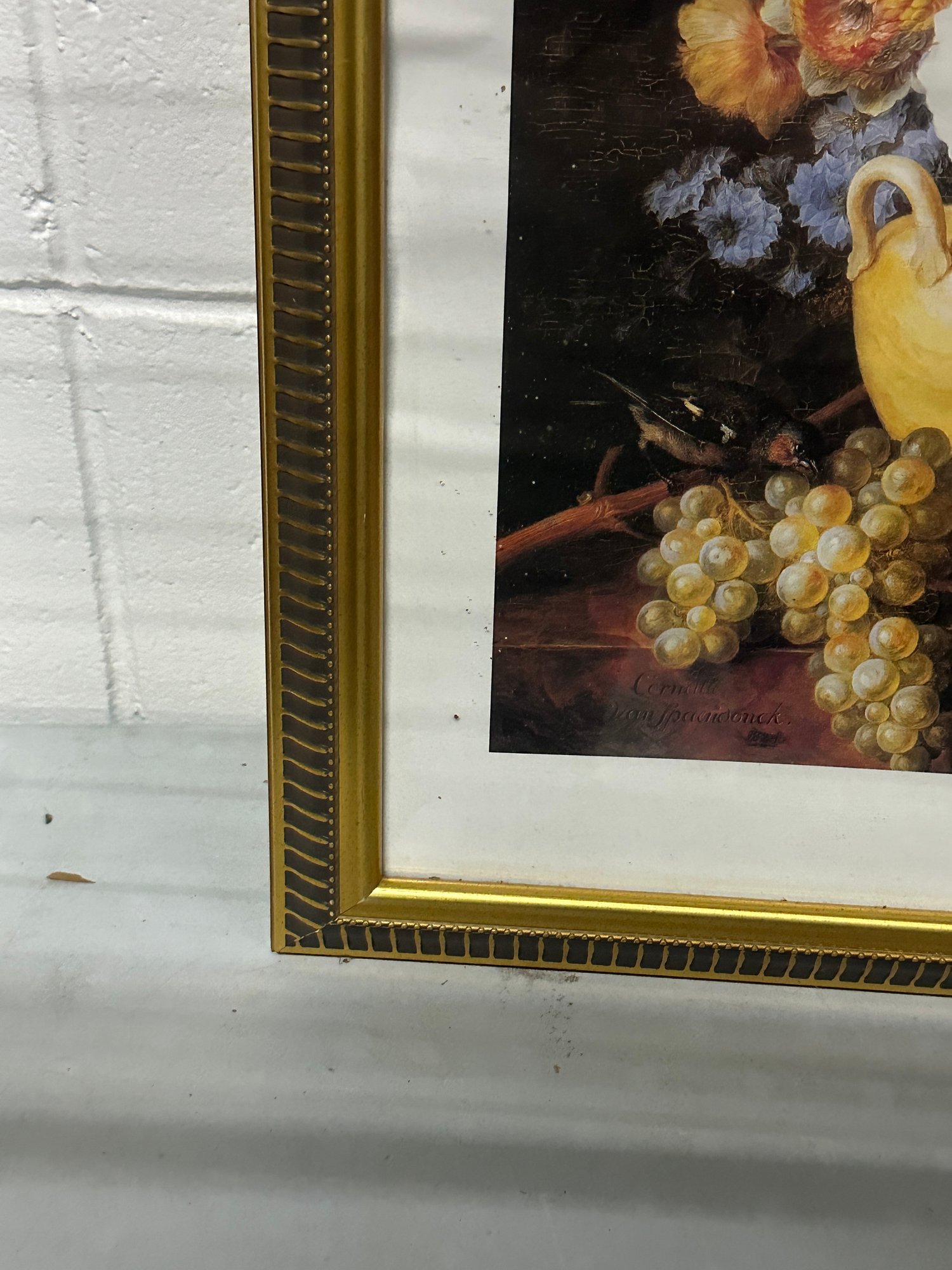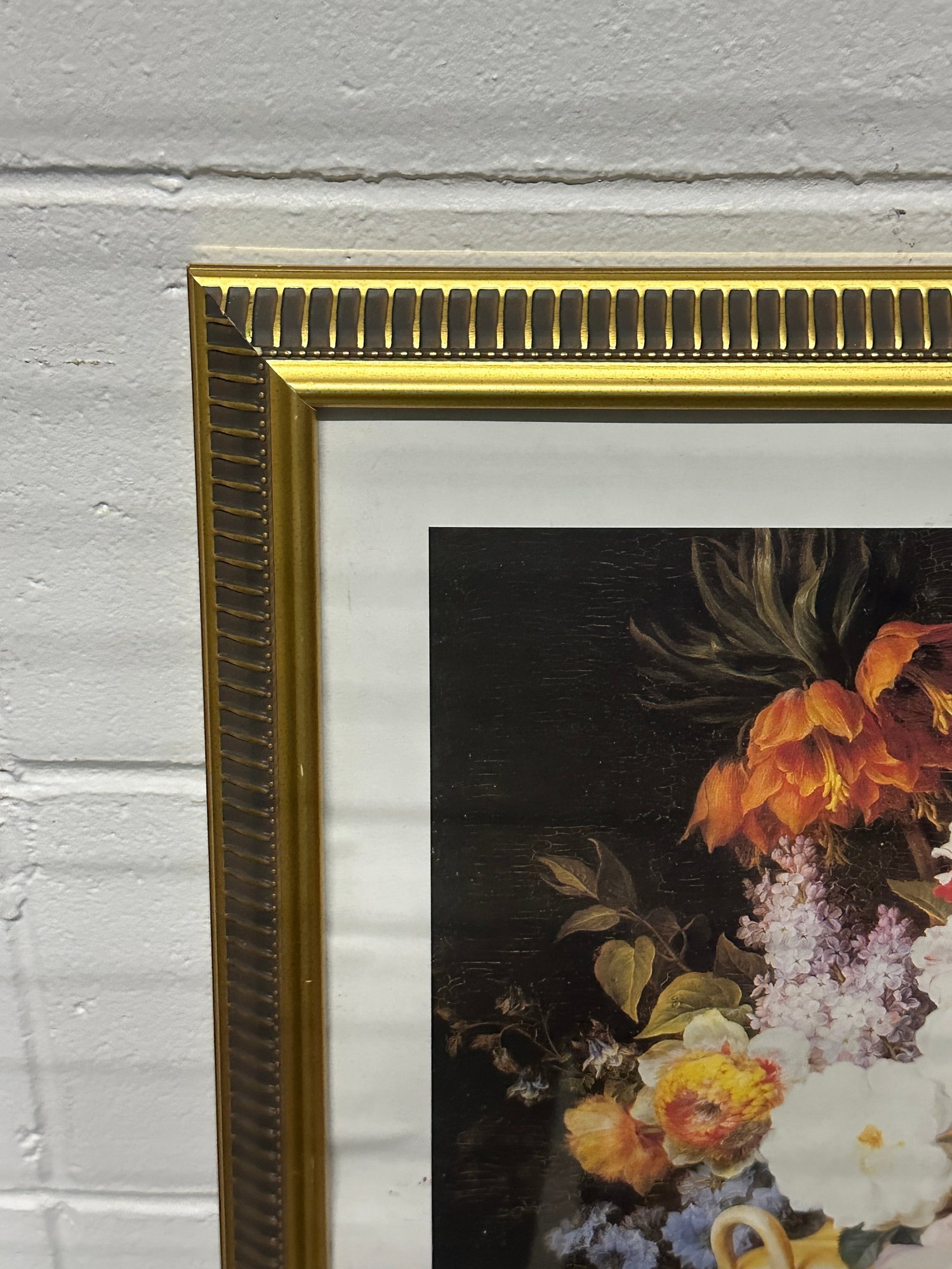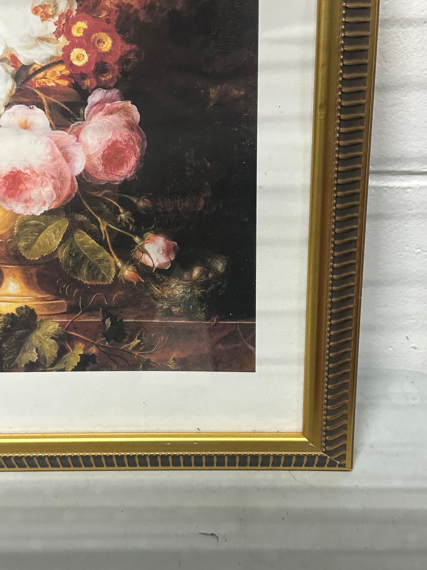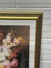 Elegant framed floral still life print in a decorative gold-tone frame, after the style of Cornelis Van Spaendonck.