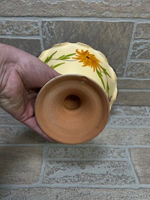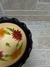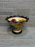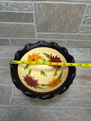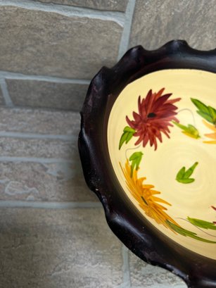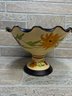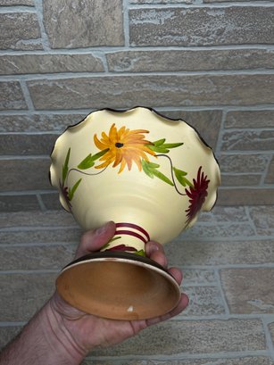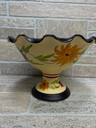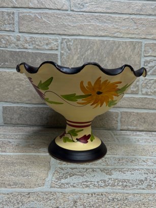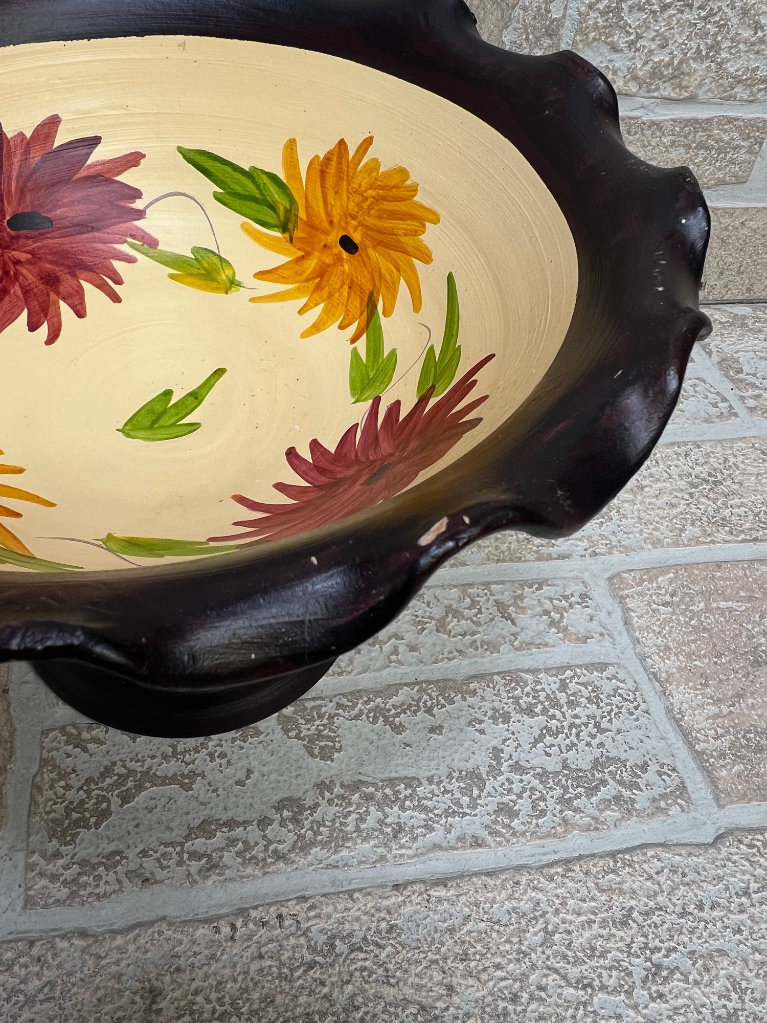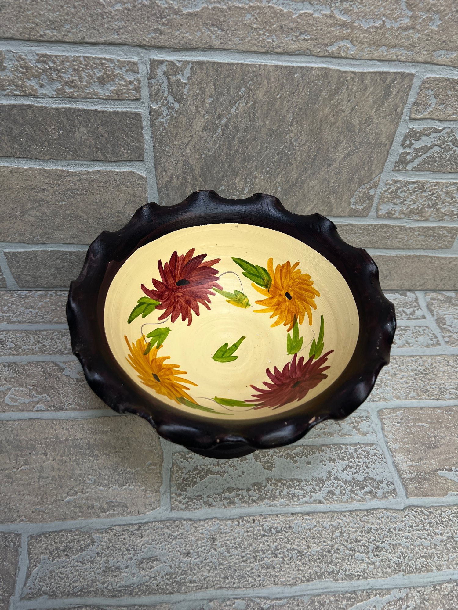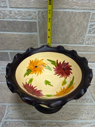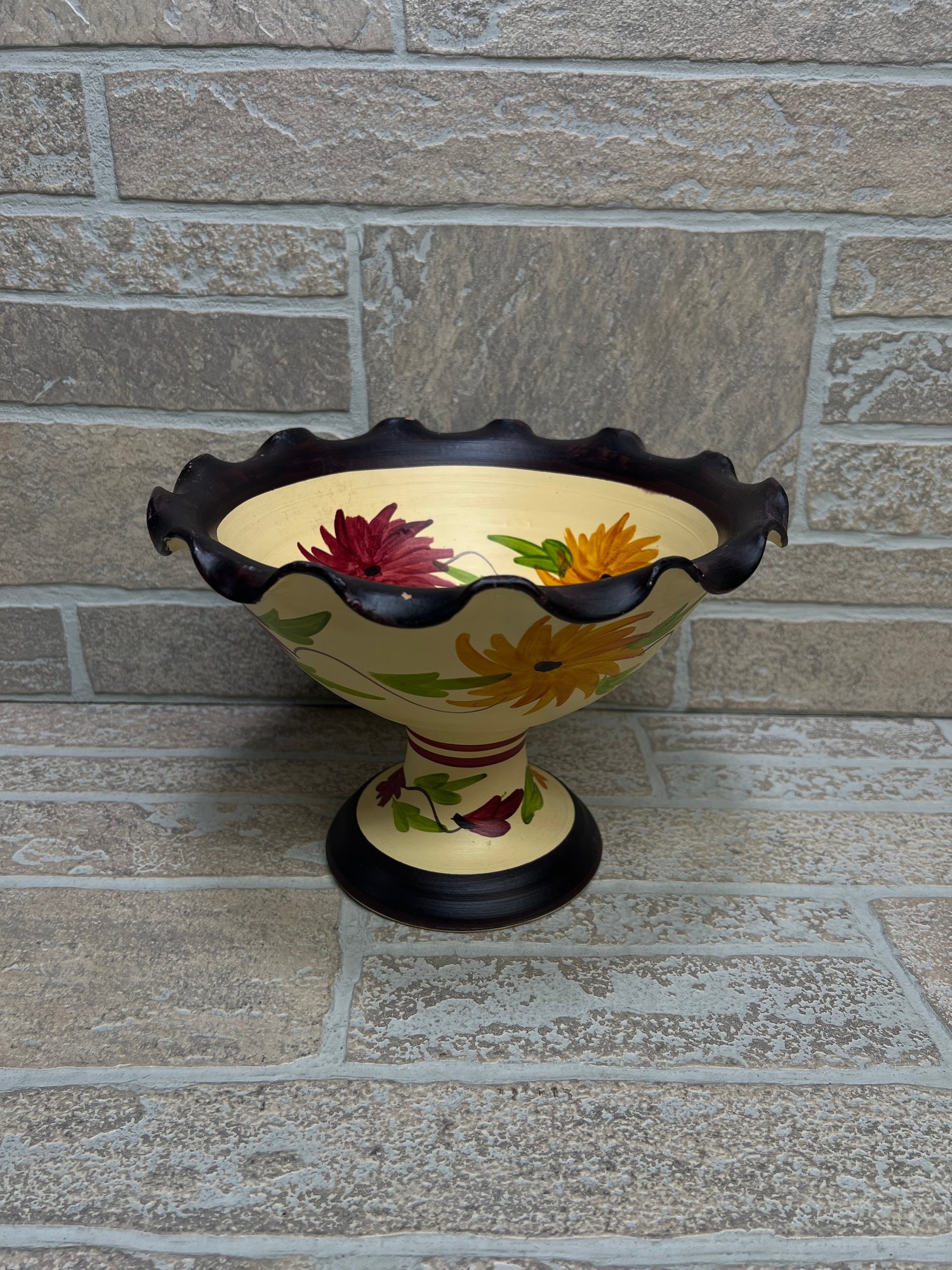 Beautiful hand-painted pedestal bowl featuring a floral motif with red and yellow flowers and green leaves on a cream background. The bowl has a scalloped, ruffled edge with a dark accent rim, giving it a classic country or farmhouse-style look.