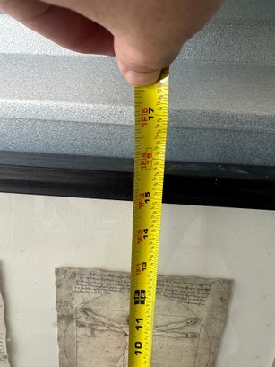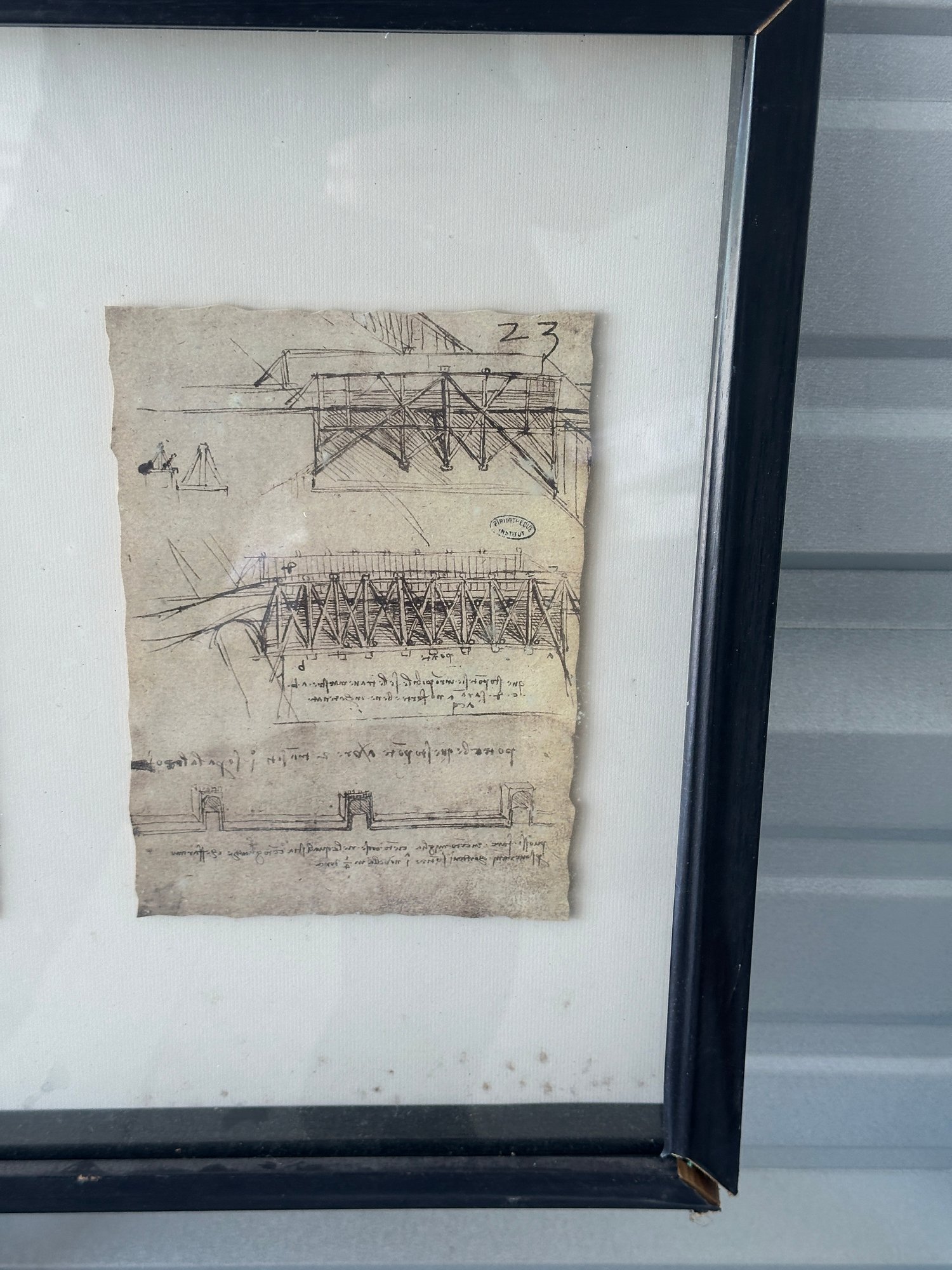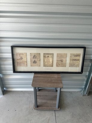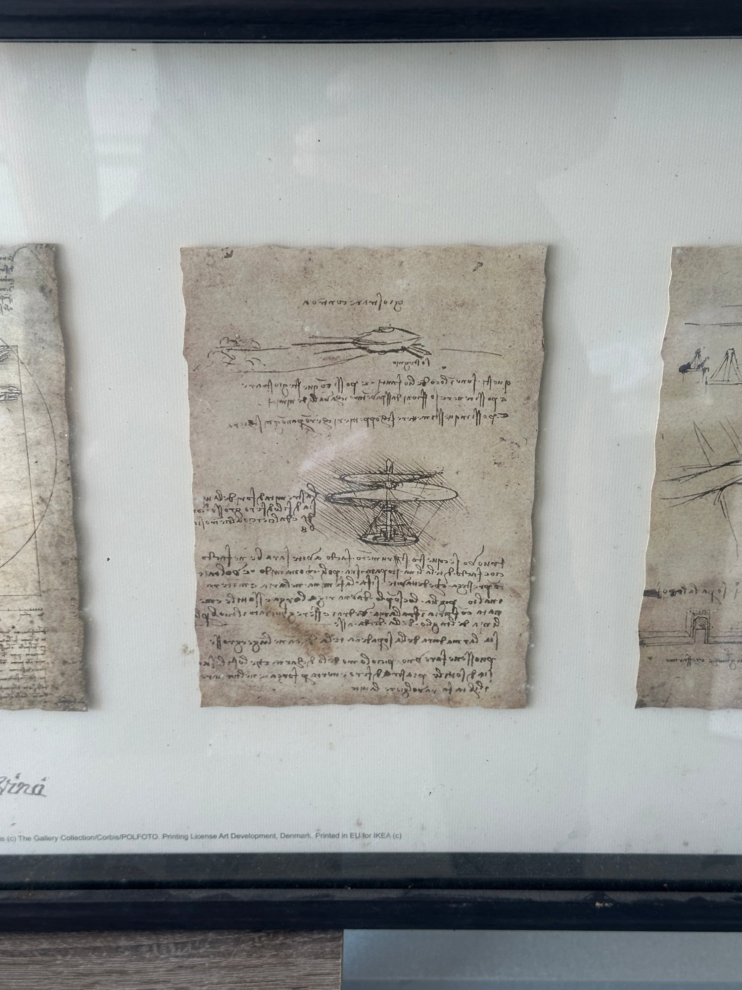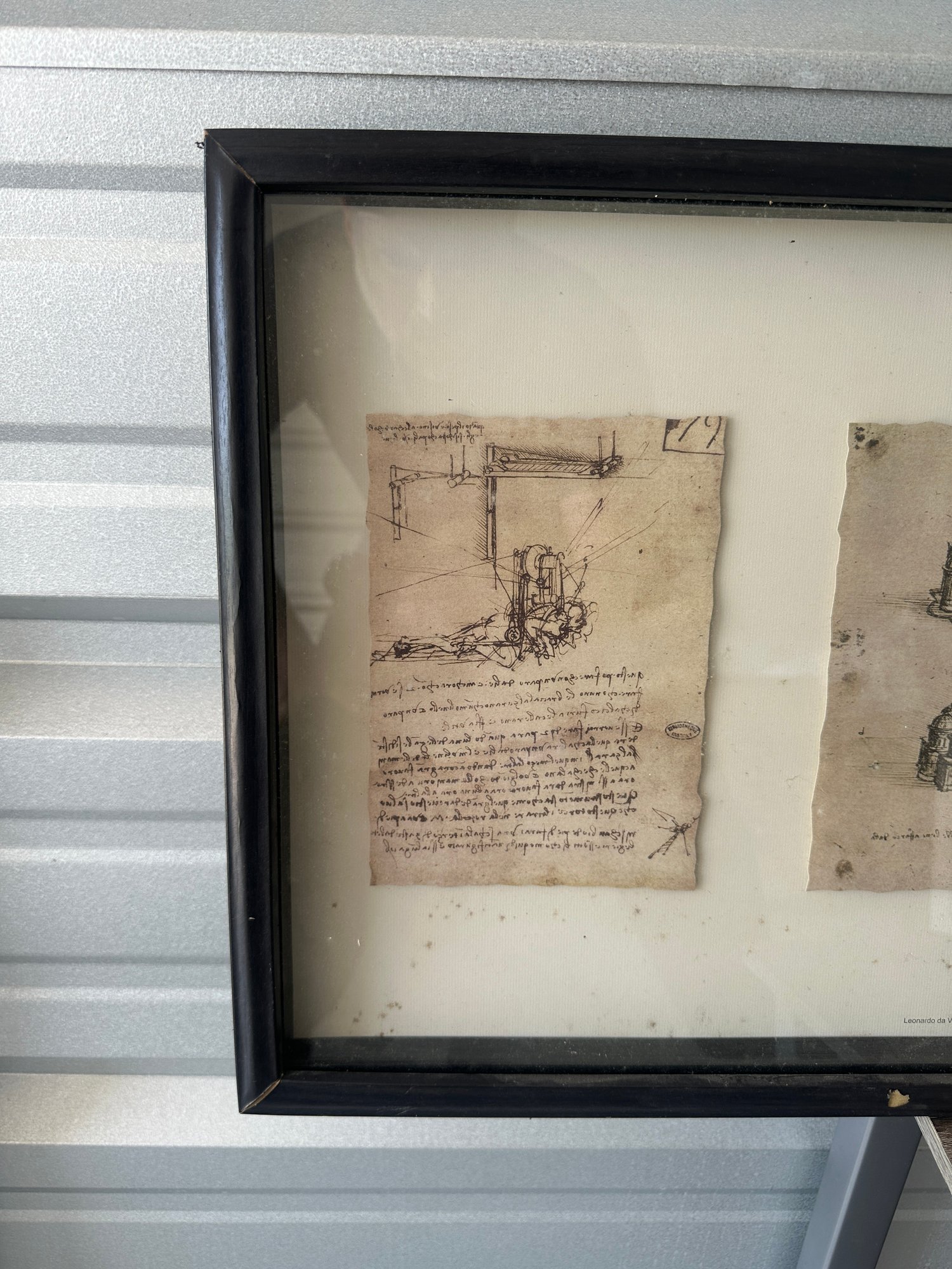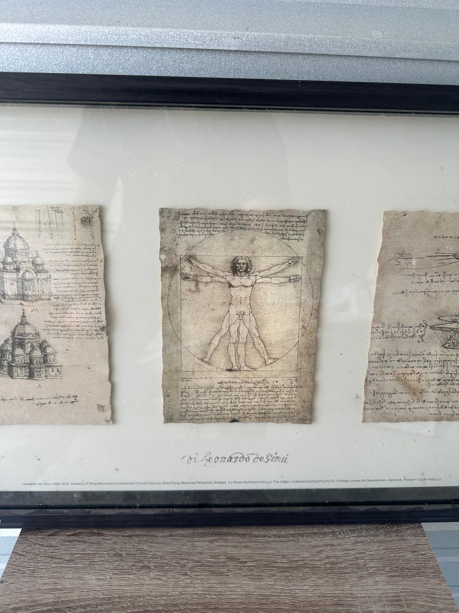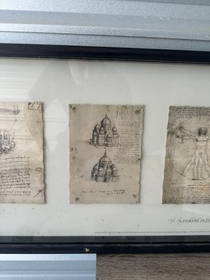 Large framed wall art featuring a collection of iconic sketches attributed to Leonardo da Vinci, including the famous Vitruvian Man along with architectural and mechanical studies.