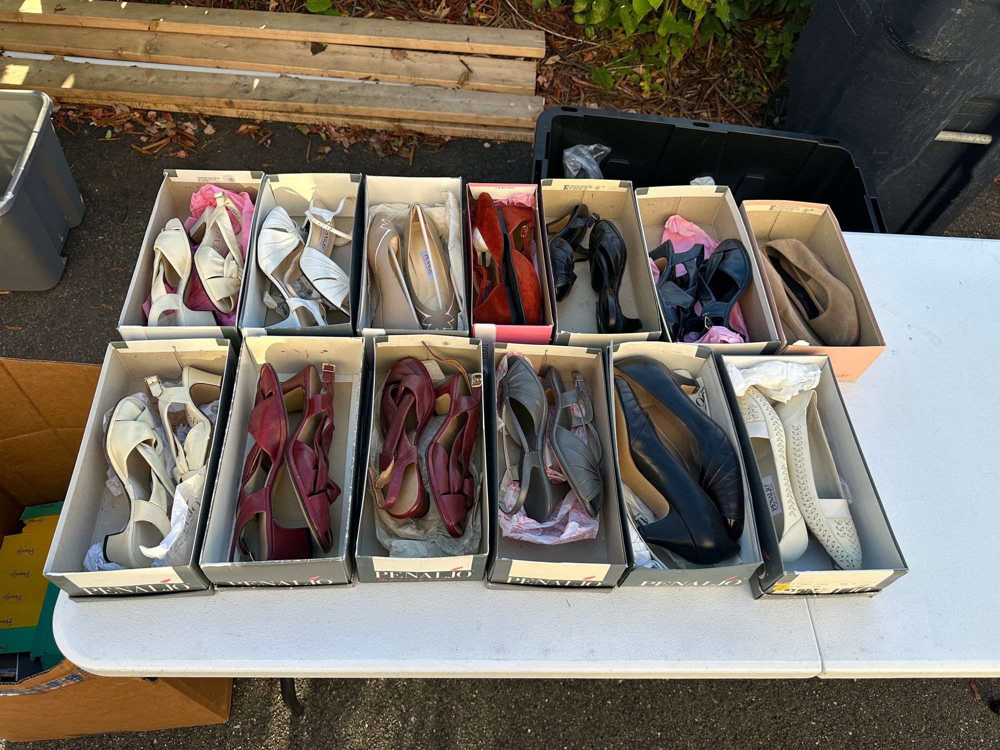 Large mixed lot of women’s shoes featuring a variety of styles including heels, sandals, flats, and dress shoes. Many pairs are stored in original boxes and several appear to be similar or matching styles, making this an excellent reseller or bulk purchase opportunity.