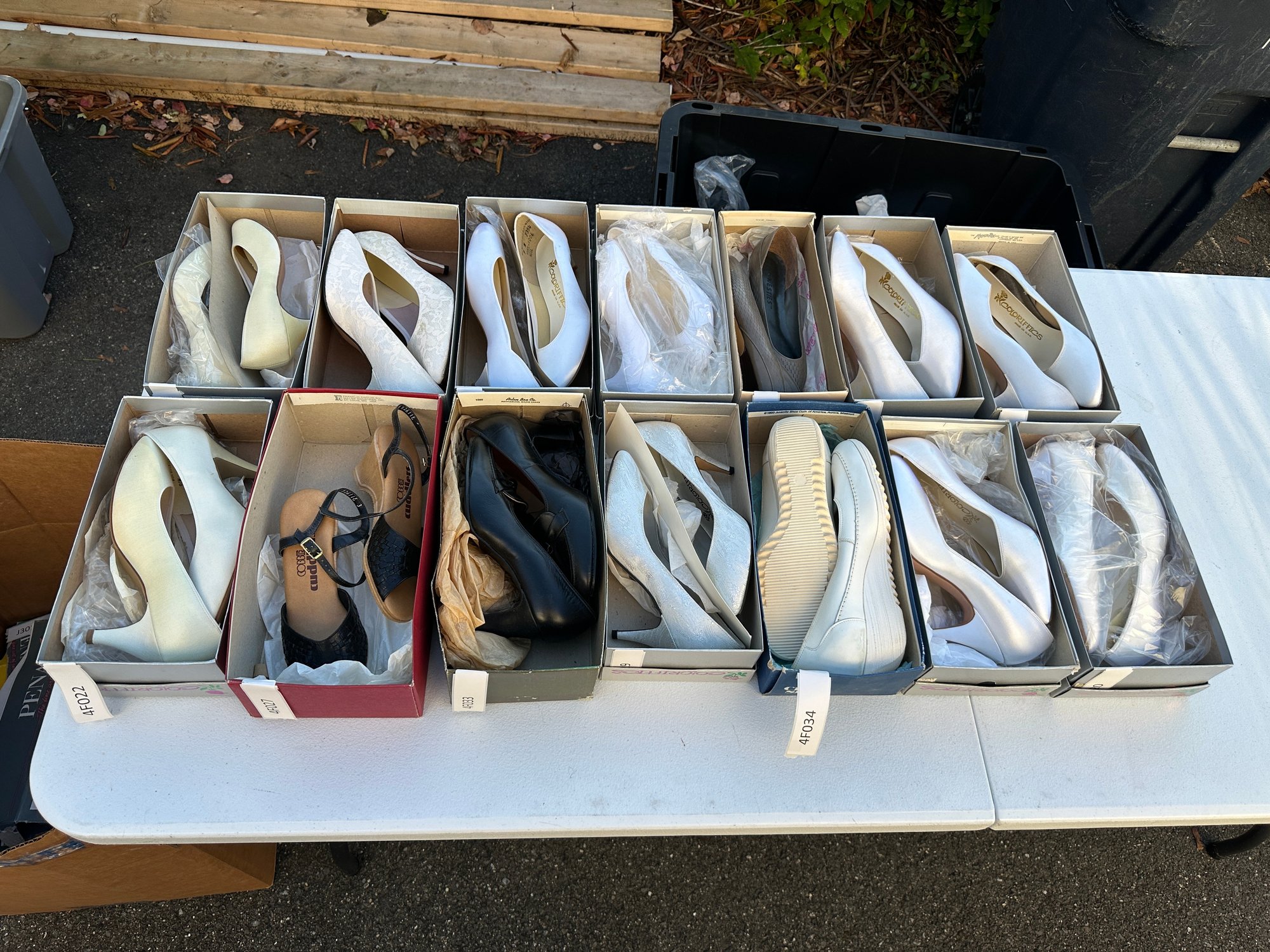 Large mixed lot of women’s shoes in white, ivory, and neutral tones, featuring a variety of styles including heels, flats, sandals, and casual footwear. Many pairs are stored in original boxes and appear ideal for events, resale, or everyday wear.