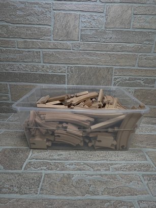 Large mixed lot of wooden train track pieces including a variety of curved and straight sections, perfect for expanding an existing train set or building custom layouts.