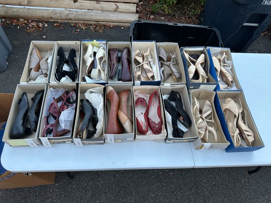 Large assorted lot of women’s shoes featuring a mix of neutral and darker tones, including heels, flats, and sandals. This lot offers a balanced variety of everyday and dress styles, making it ideal for resale or personal use.
