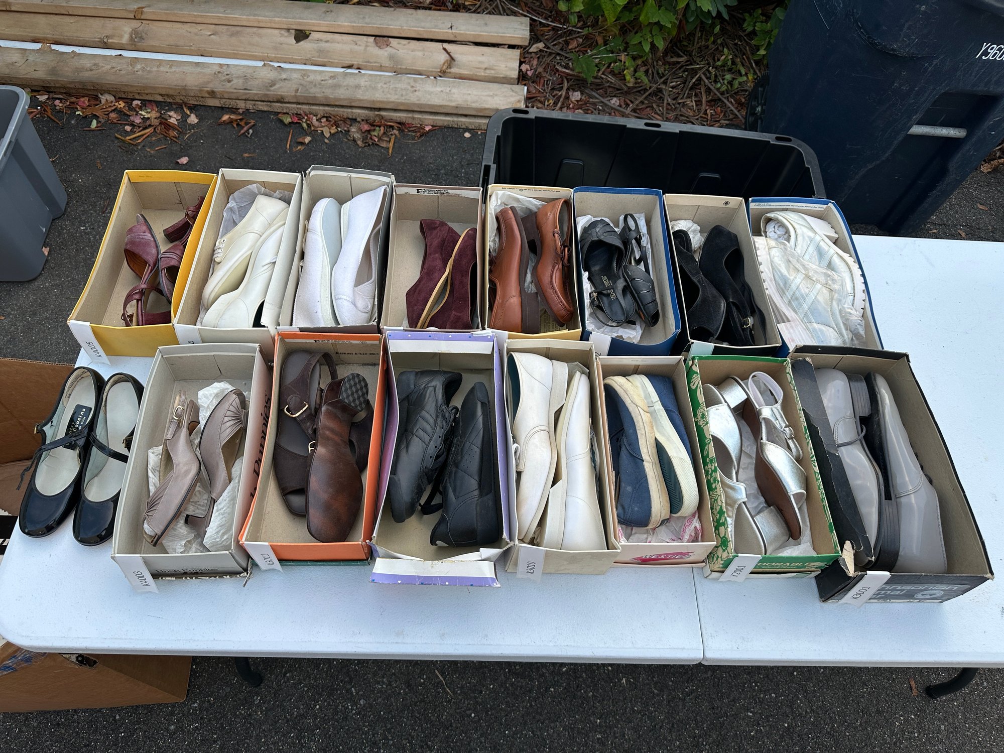 The assortment includes both neutral tones and darker colors, with multiple pairs still housed in original boxes.