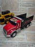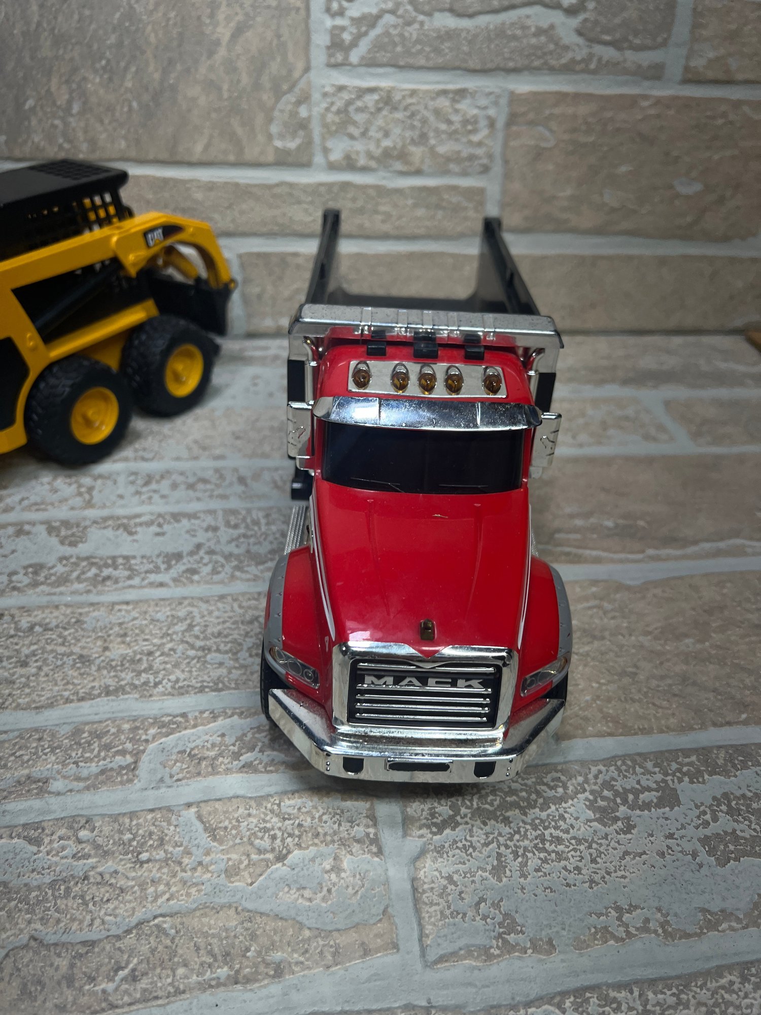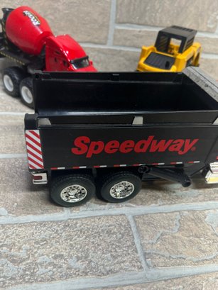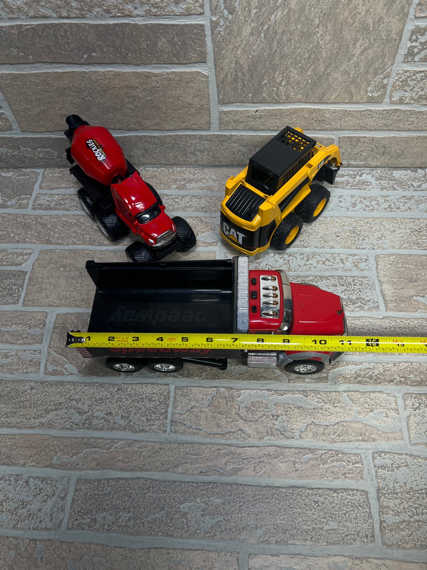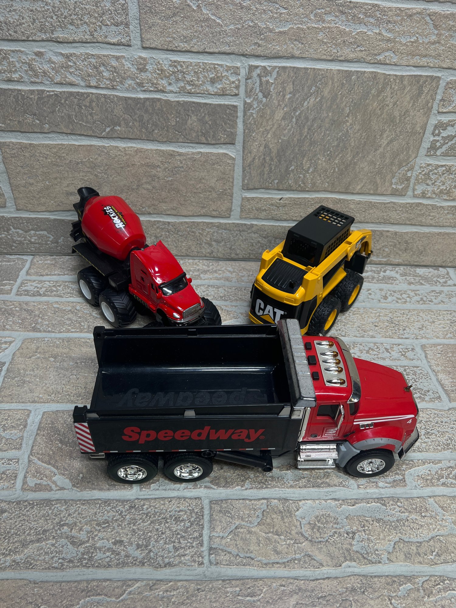 Lot of 3 toy construction vehicles including a CAT skid steer loader, Speedway dump truck, and cement mixer truck.