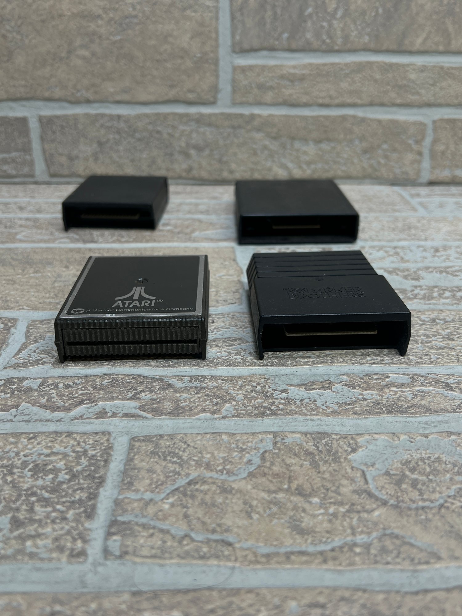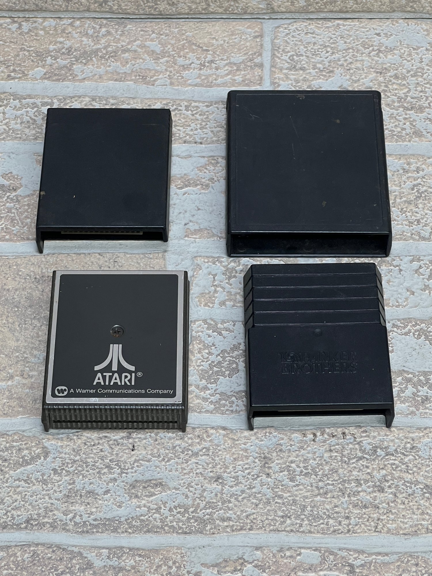Lot of four vintage cartridge storage cases compatible with Atari-style game cartridges. Includes one Atari branded case (A Warner Communications Company) and one Parker Brothers branded case, along with two additional unbranded cases.