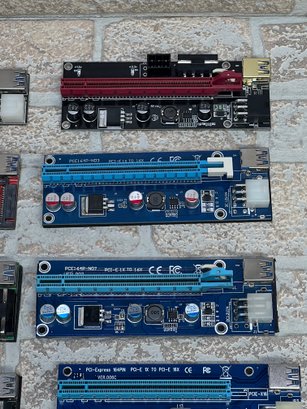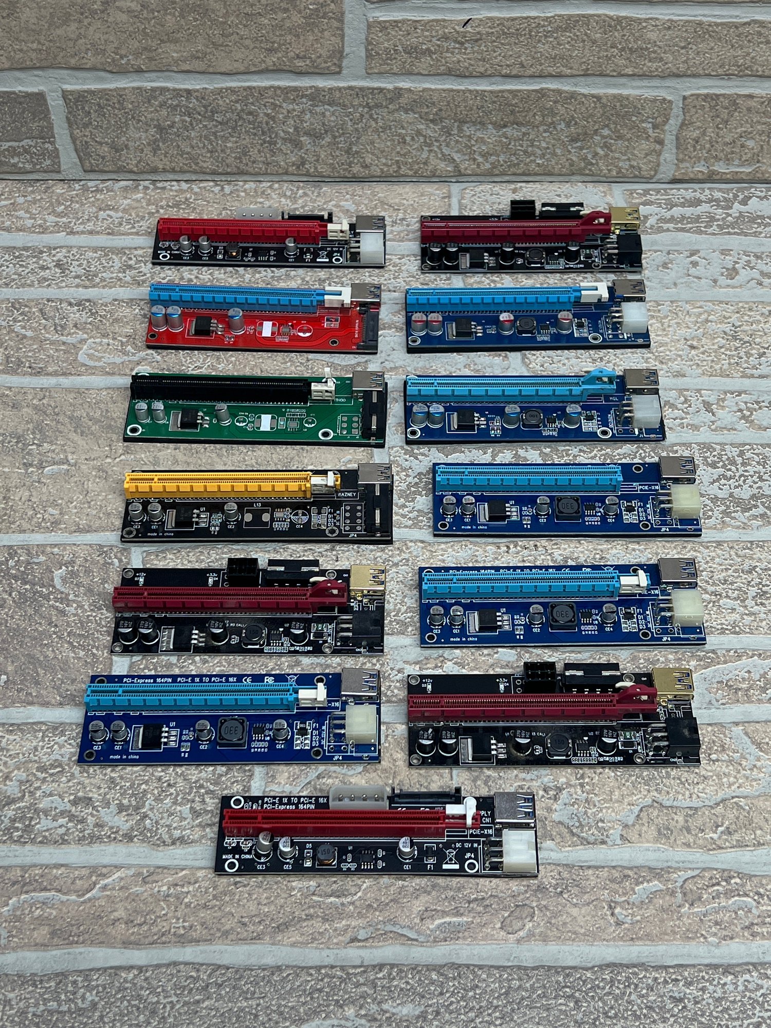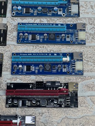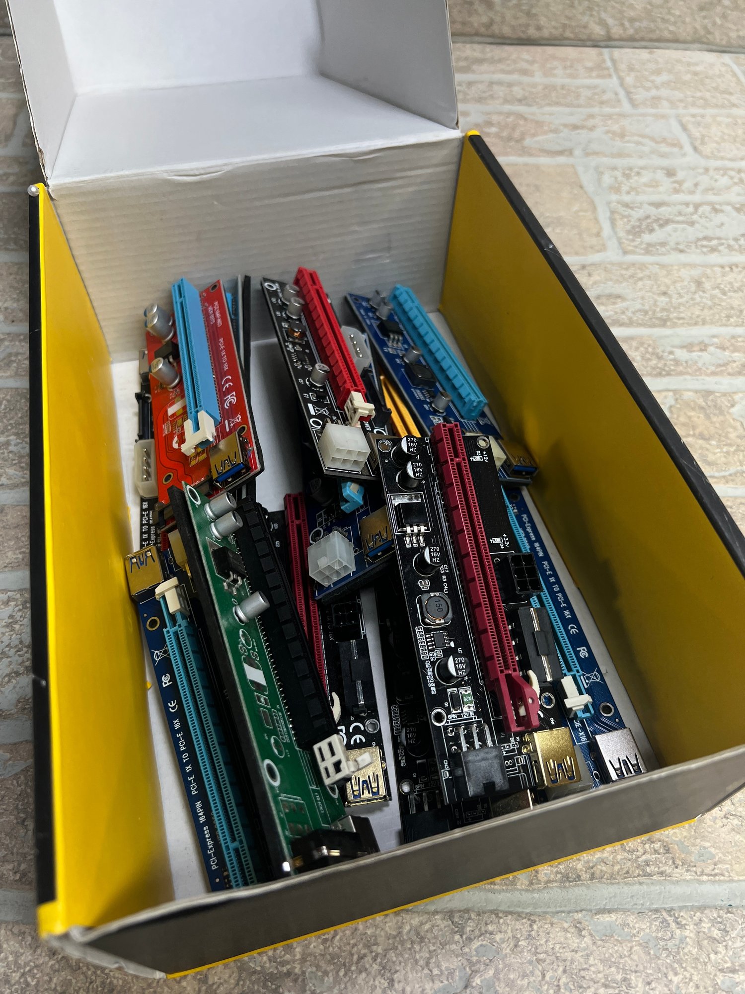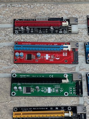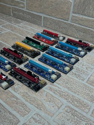 Bulk lot of PCI-E riser adapter boards commonly used for GPU mining rigs and custom PC builds.