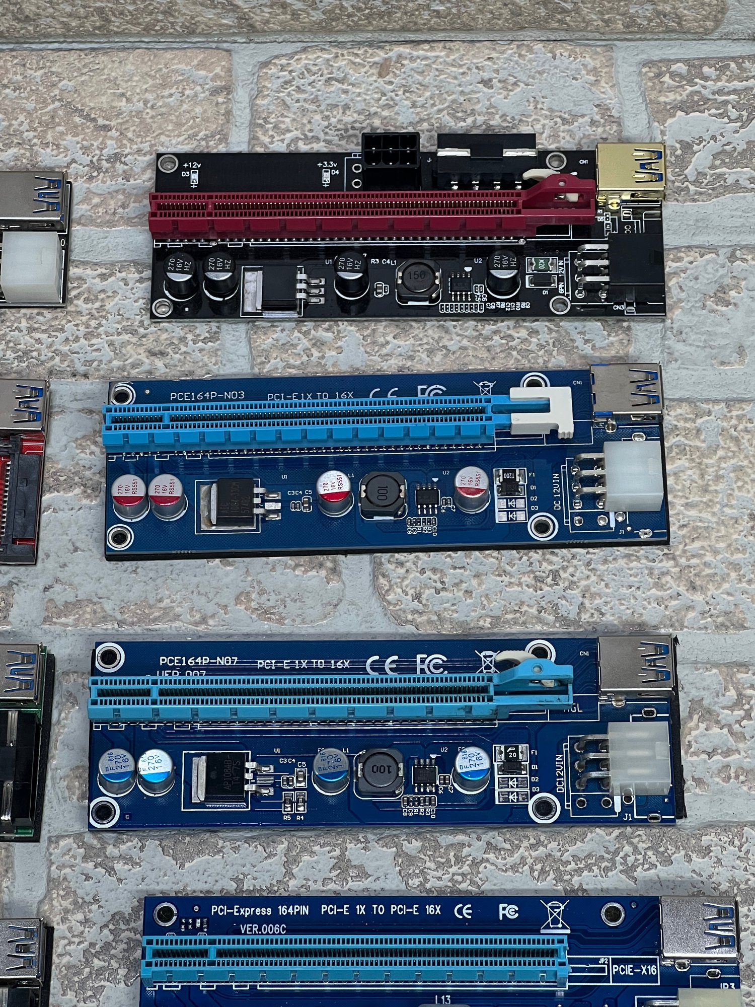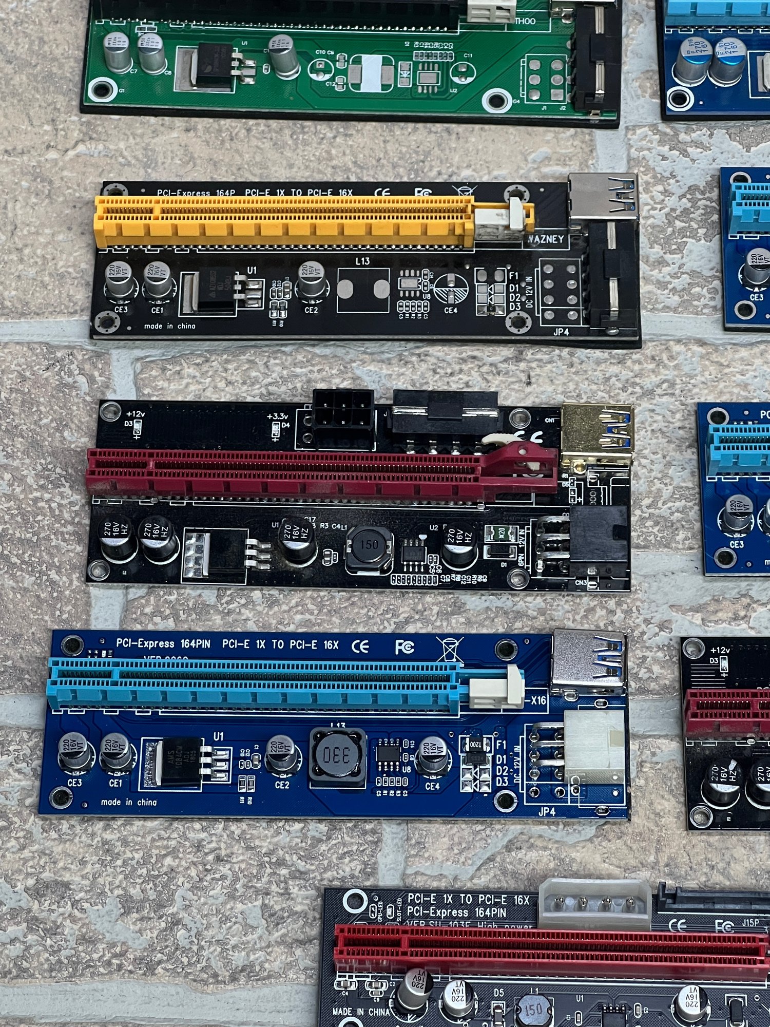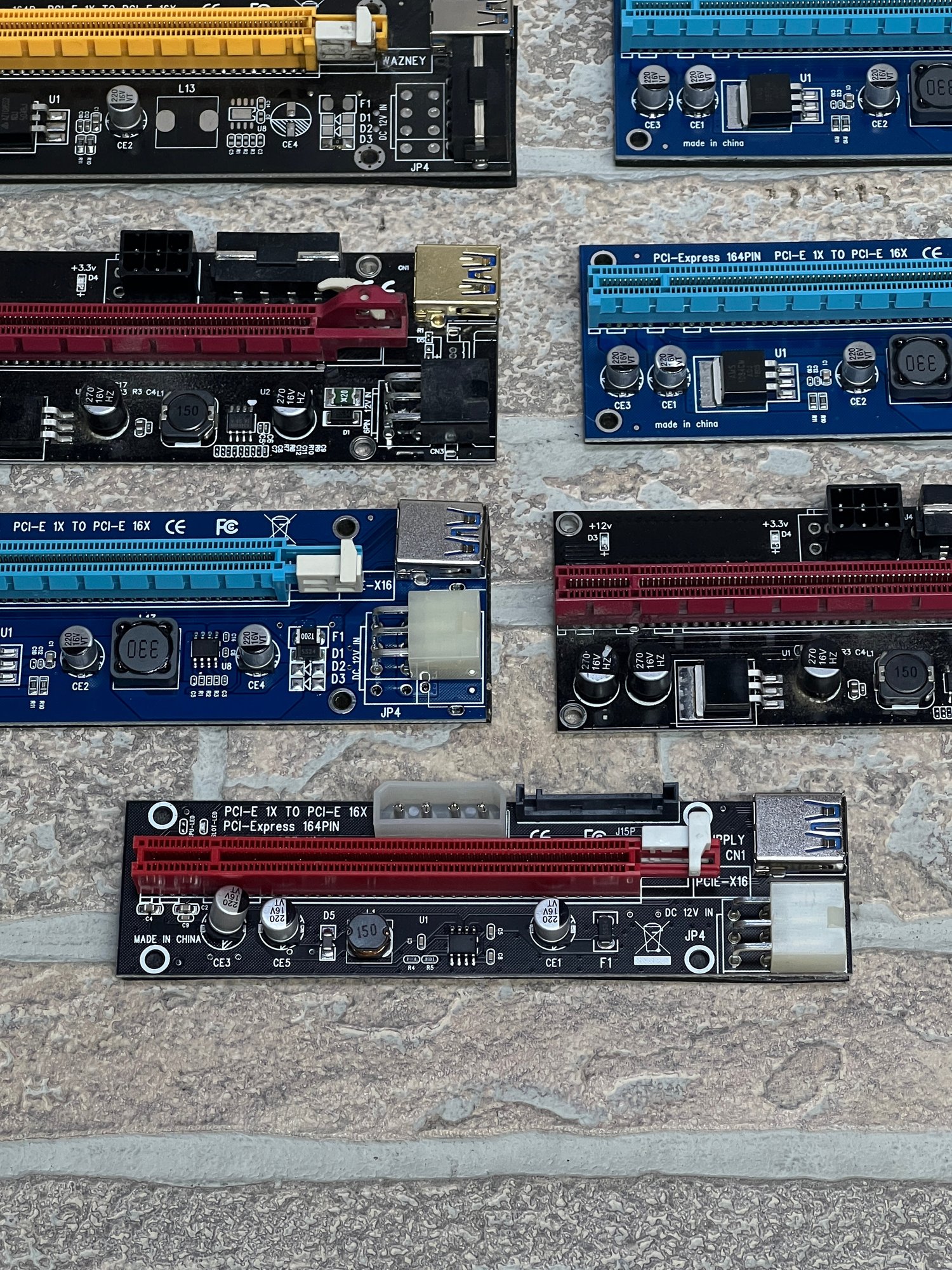 Bulk lot of PCI-E riser adapter boards commonly used for GPU mining rigs and custom PC builds.