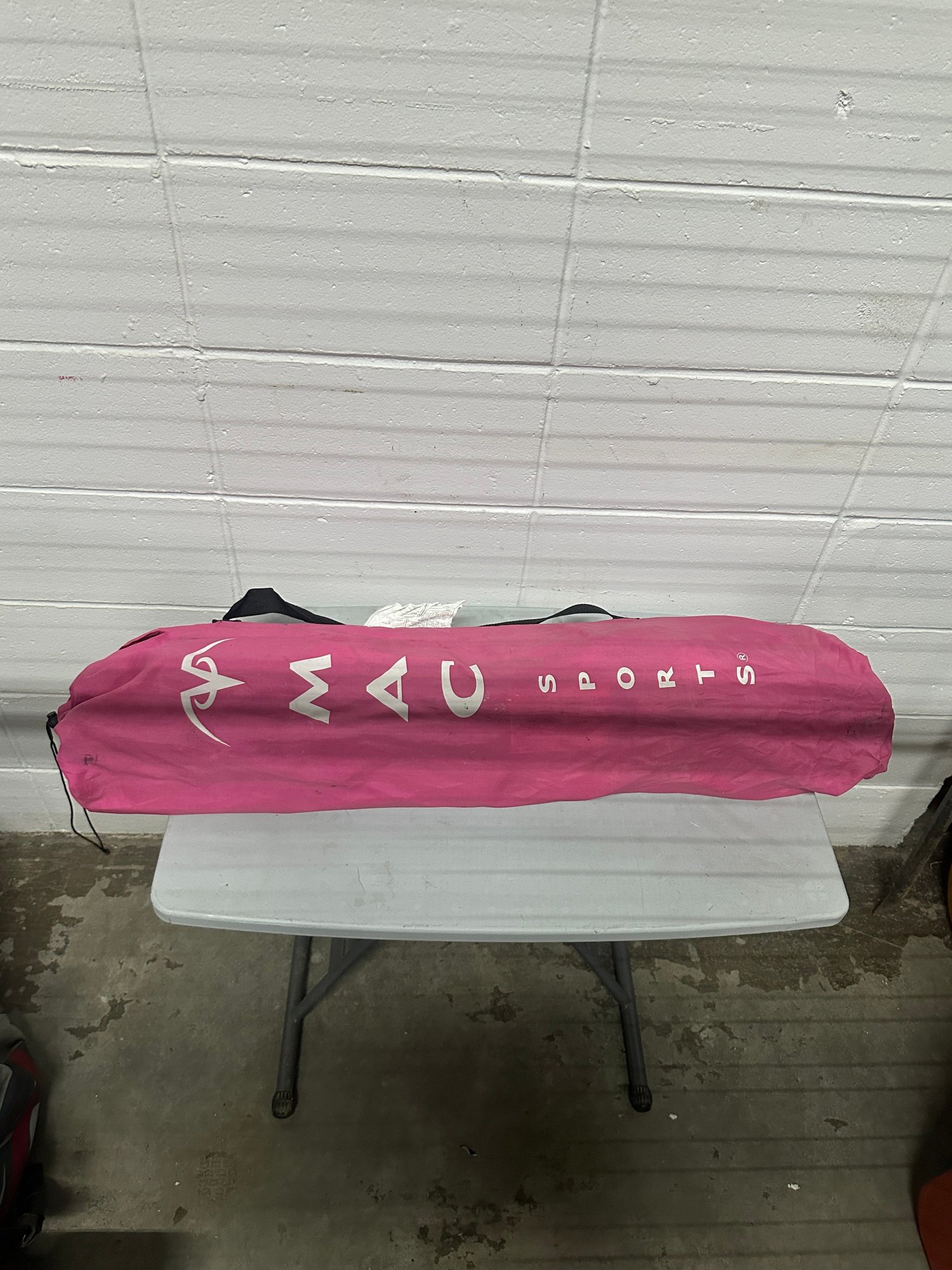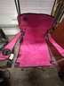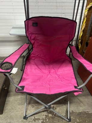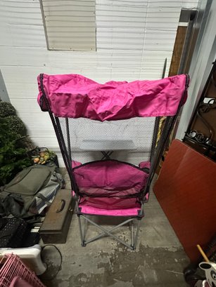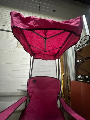 Bright pink MAC Sports folding camping chair featuring an attached overhead sun canopy, mesh back panel, and built-in cup holder.