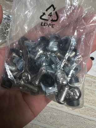 Mixed lot of assorted hardware components including cage nuts, machine screws, rubber feet/bumpers, and Allen (hex) keys. These appear to be commonly used for server racks, electronics mounting, or general hardware applications.