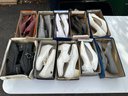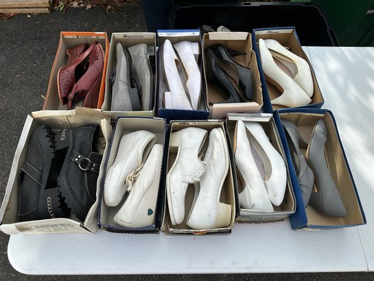 Mixed lot of women’s shoes featuring a variety of styles, including dress heels, flats, and casual footwear. This lot includes several pairs in original boxes along with a mix of neutral and classic styles.