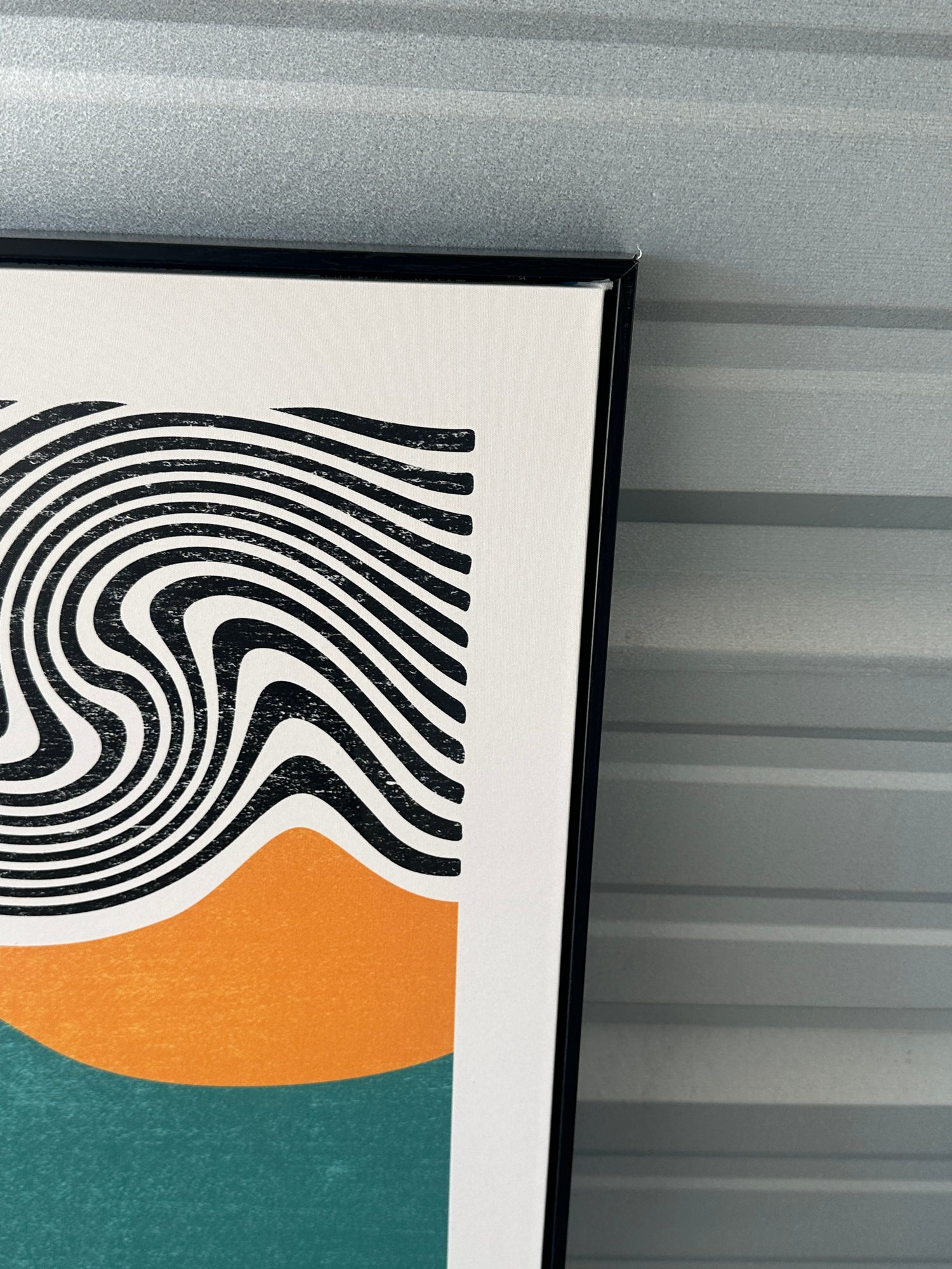 The artwork is set in a sleek black frame and ready to hang. Eye-catching and stylish, it adds a pop of color while maintaining a clean, modern look.