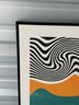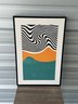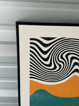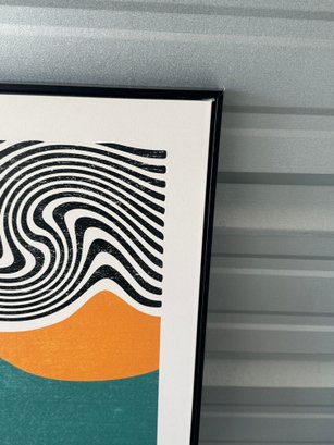 Contemporary framed wall art featuring a bold abstract design with black flowing lines over a neutral background, accented by warm orange and teal geometric shapes. This piece has a modern, minimalist aesthetic that works great in living rooms, offices, or entryways.