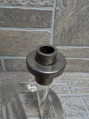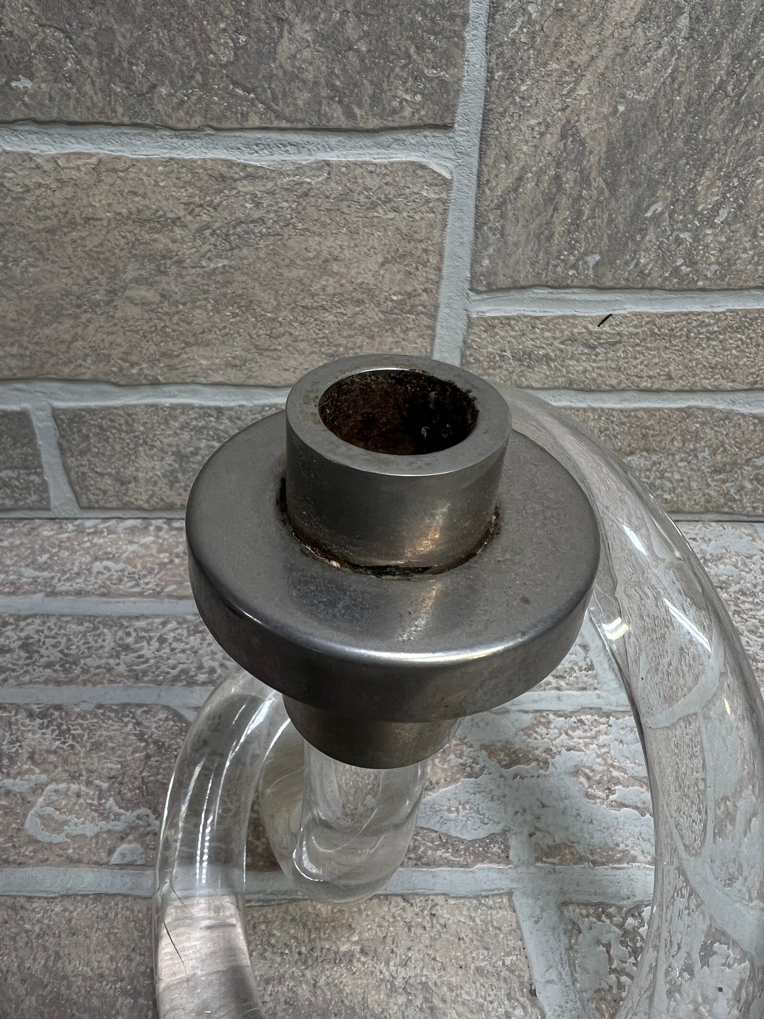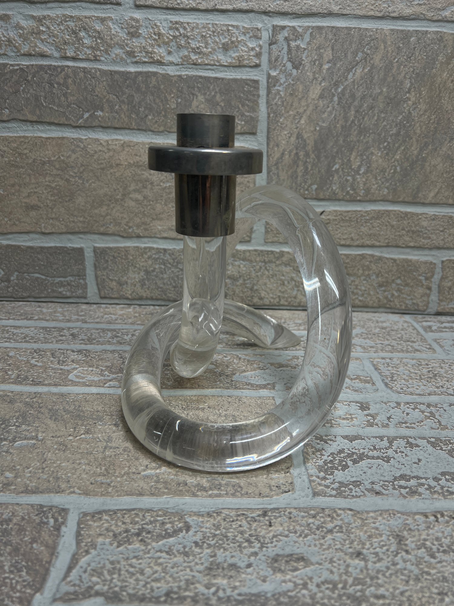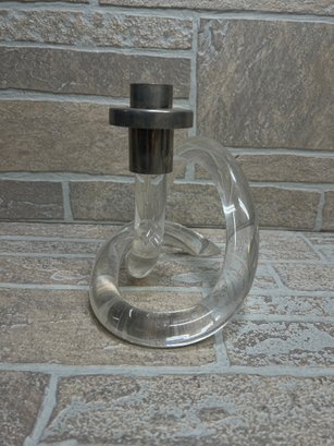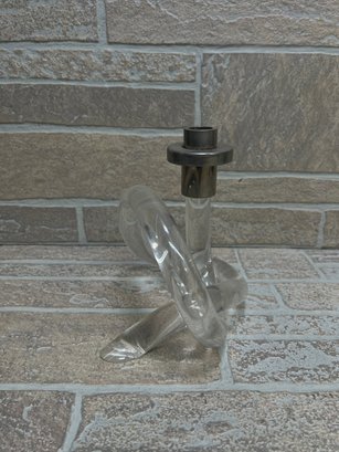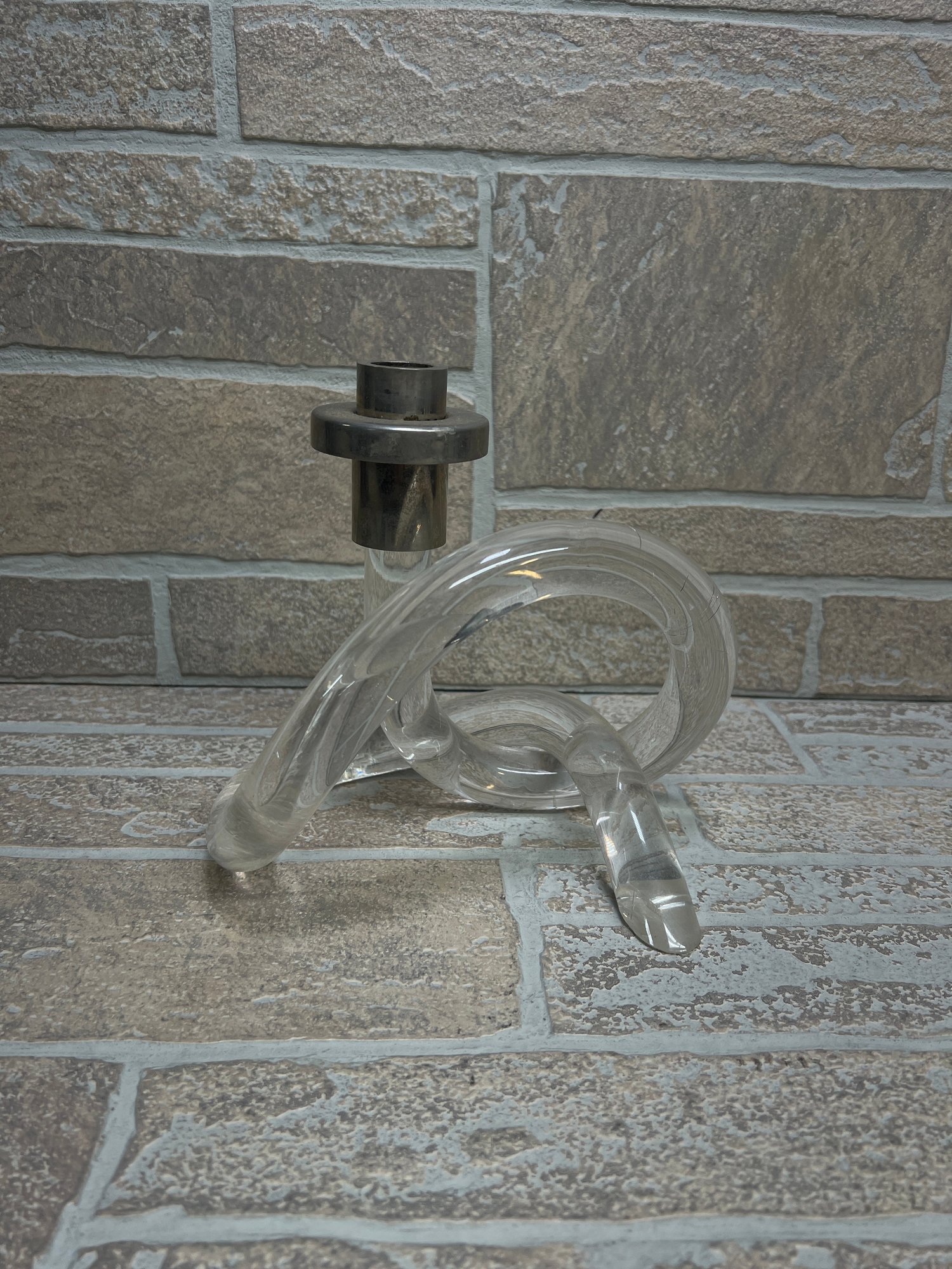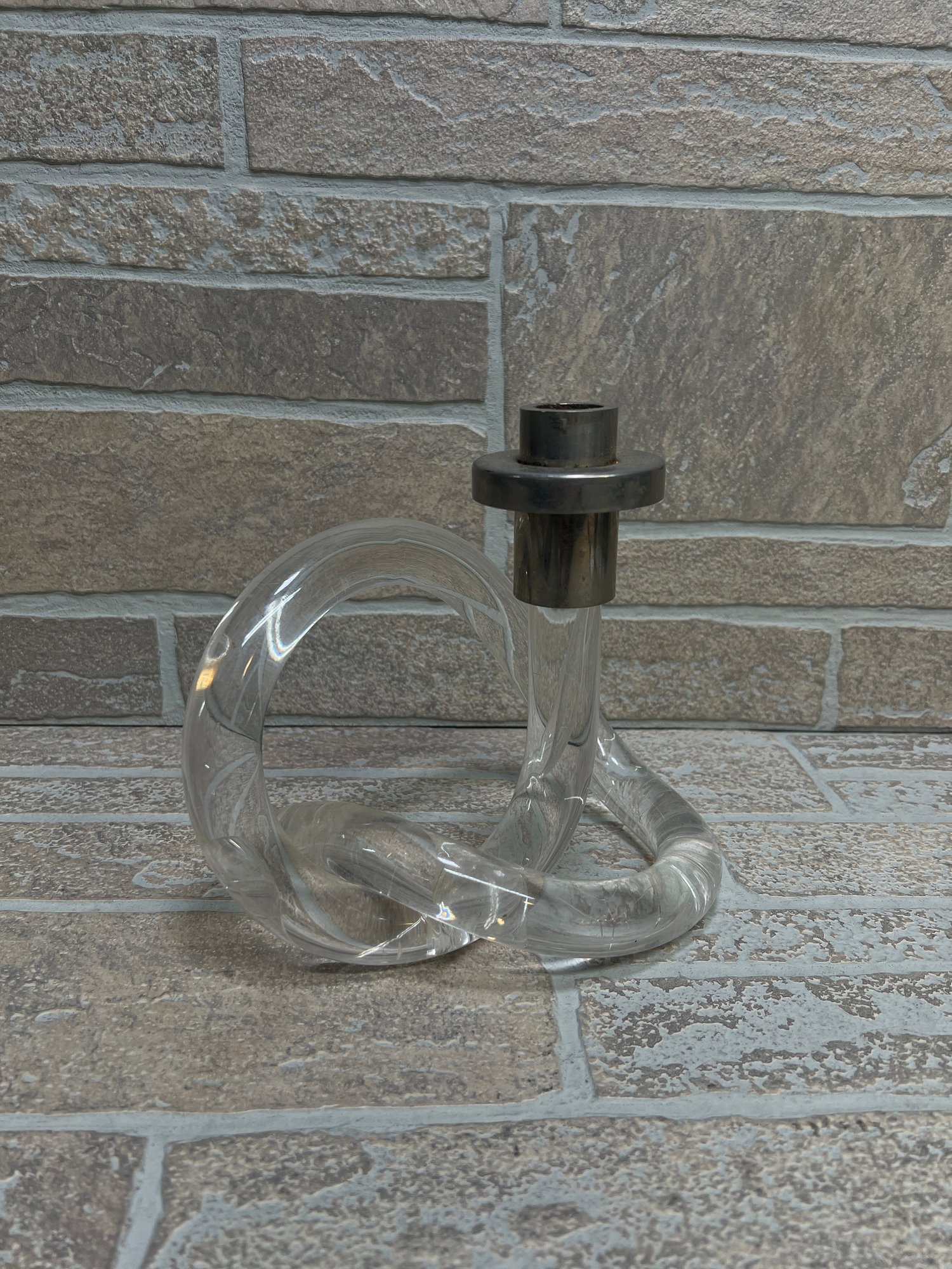 Unique modern art glass candle holder featuring an abstract twisted loop design with a metal candle cup at the top.