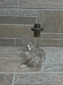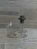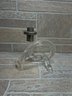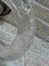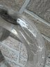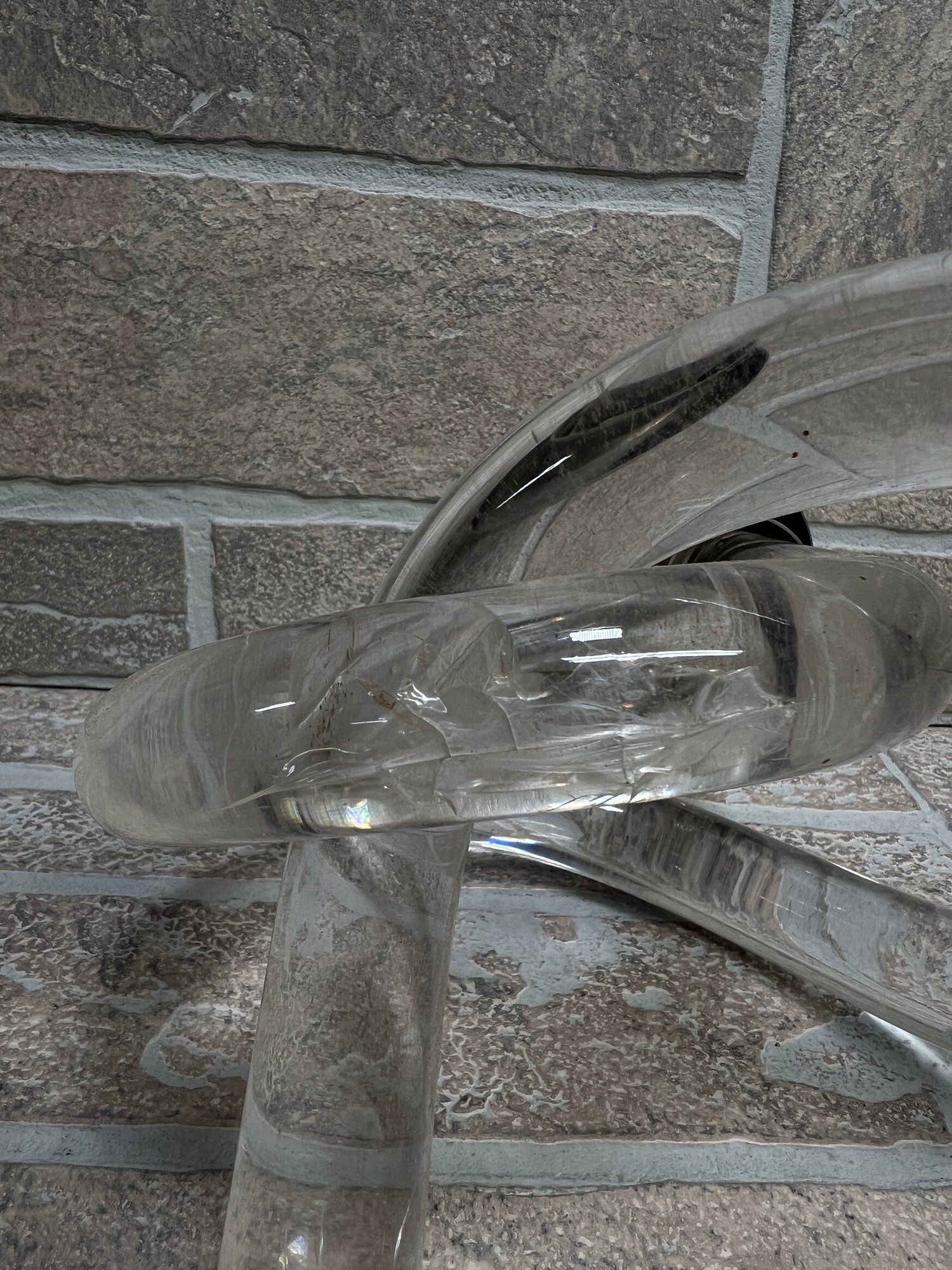 Heavy, clear glass construction with a sculptural, contemporary look. Design is reminiscent of Dorothy Thorpe style glass, known for mid-century modern decorative pieces.