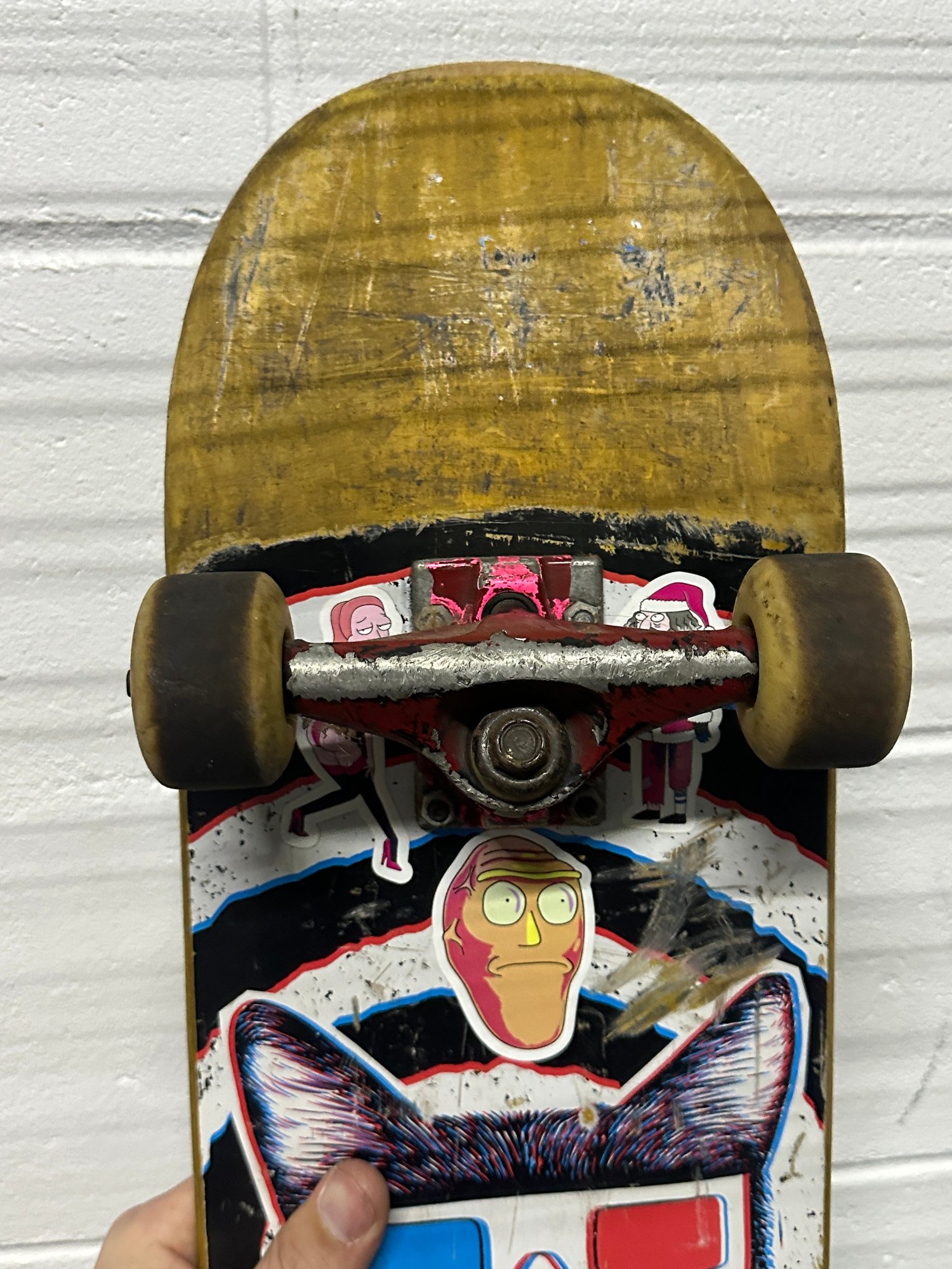 Notes: Used condition with visible wear Heavy scuffing, scratches, and graphic wear on deck Edge wear and chipping along sides Trucks show wear and oxidation Wheels are worn and used Grip tape shows wear and dirt Untested for performance – sold as-is Still usable but best suited for casual riding, display, or parts.