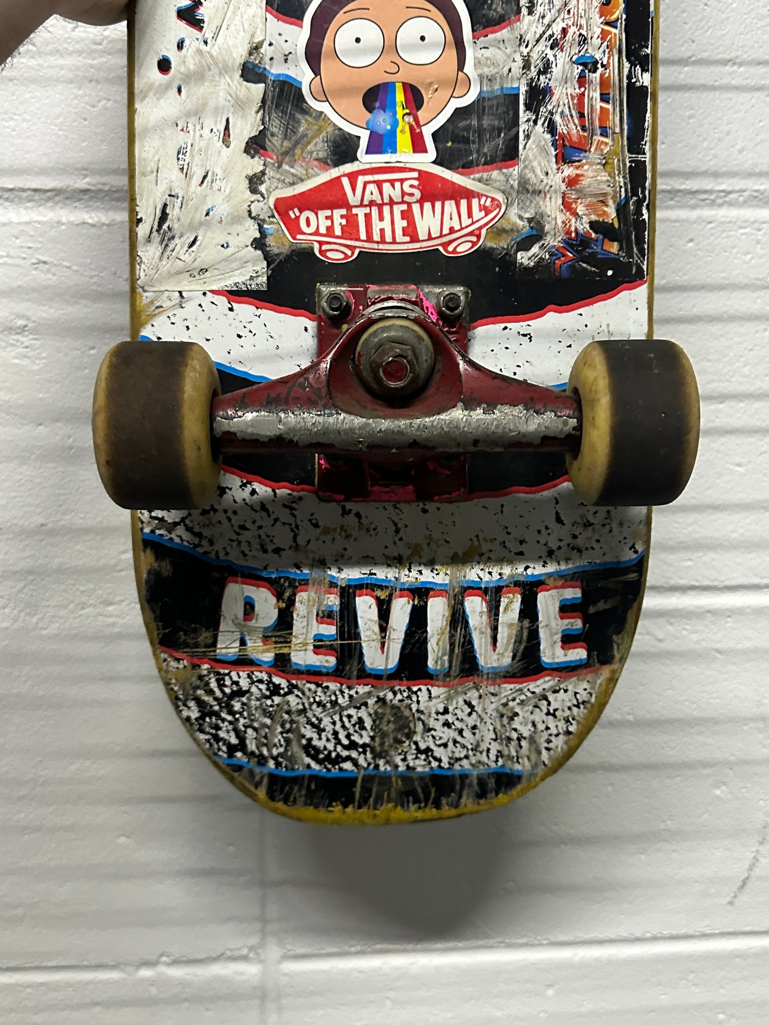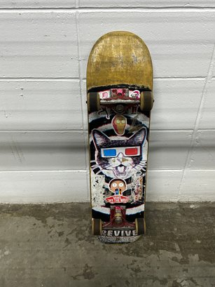 Revive brand complete skateboard featuring a graphic deck with multiple stickers including Vans “Off The Wall” and other designs. This board shows clear signs of use but remains a solid piece for skating, collecting, or display.