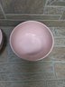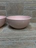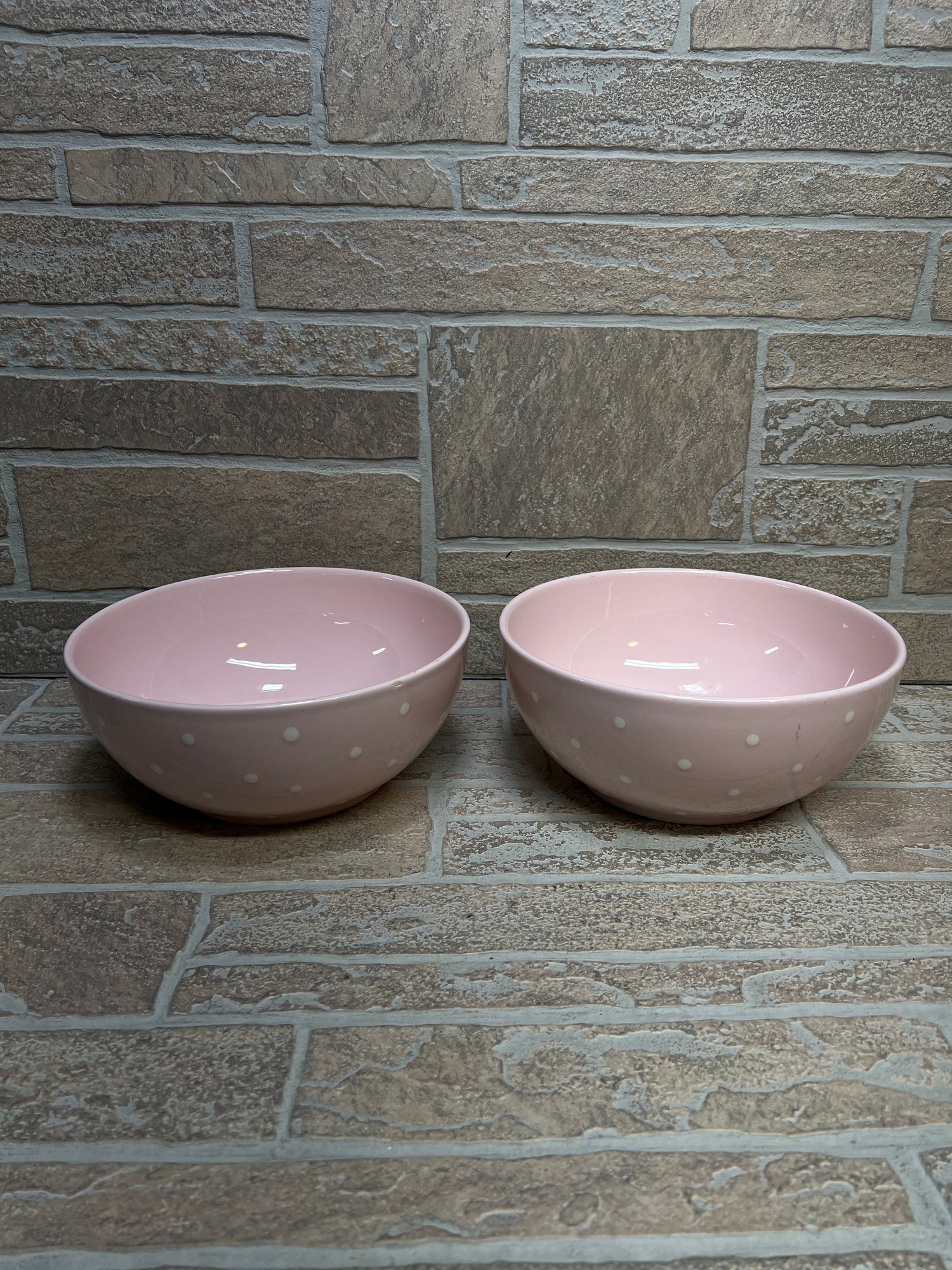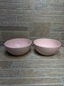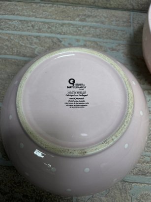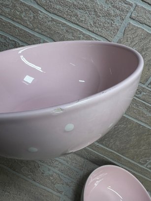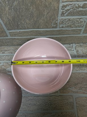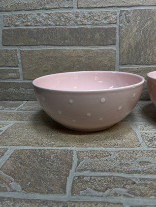 Set of two charming ceramic bowls featuring a soft pink glaze with white polka dot pattern.