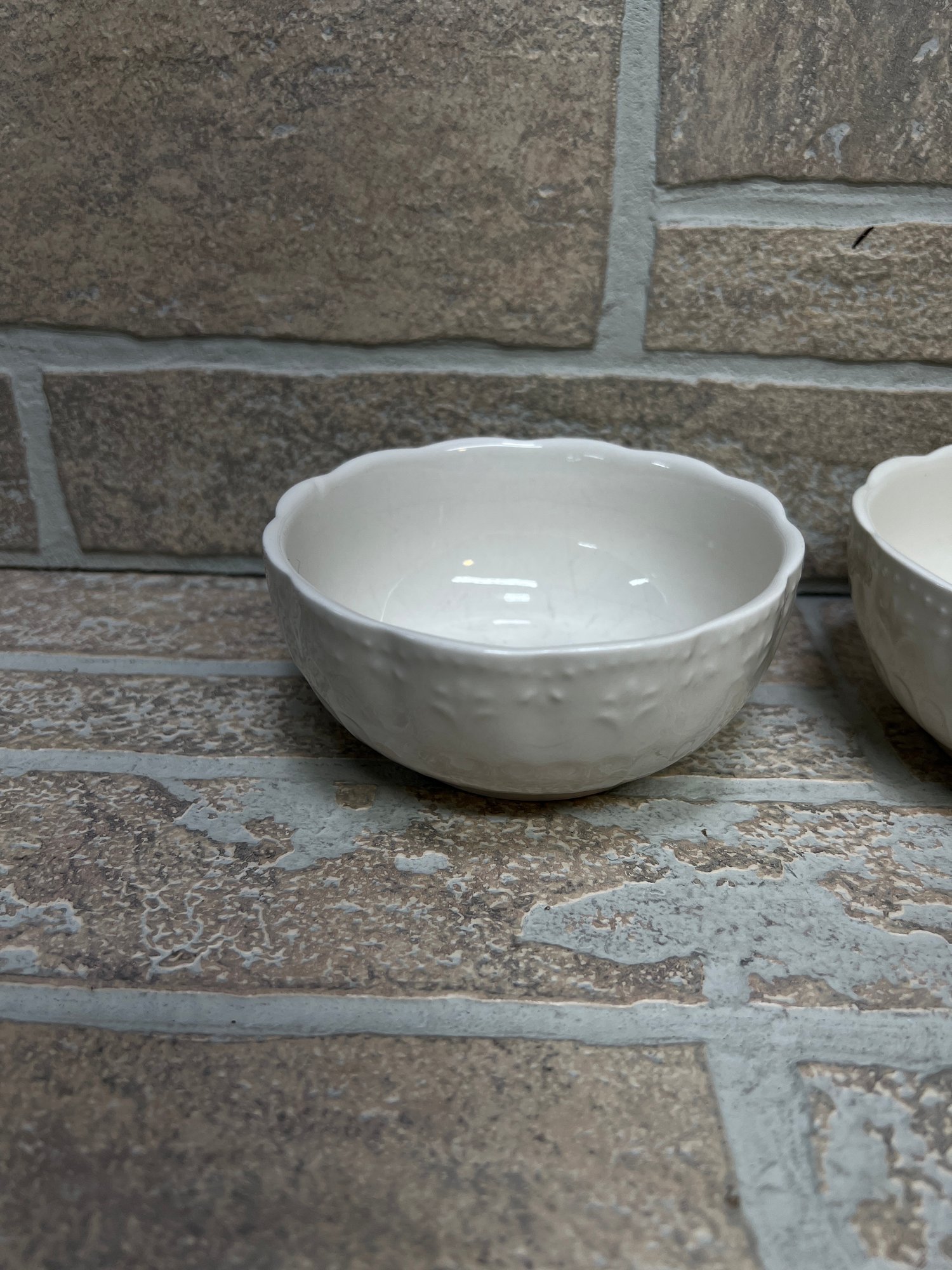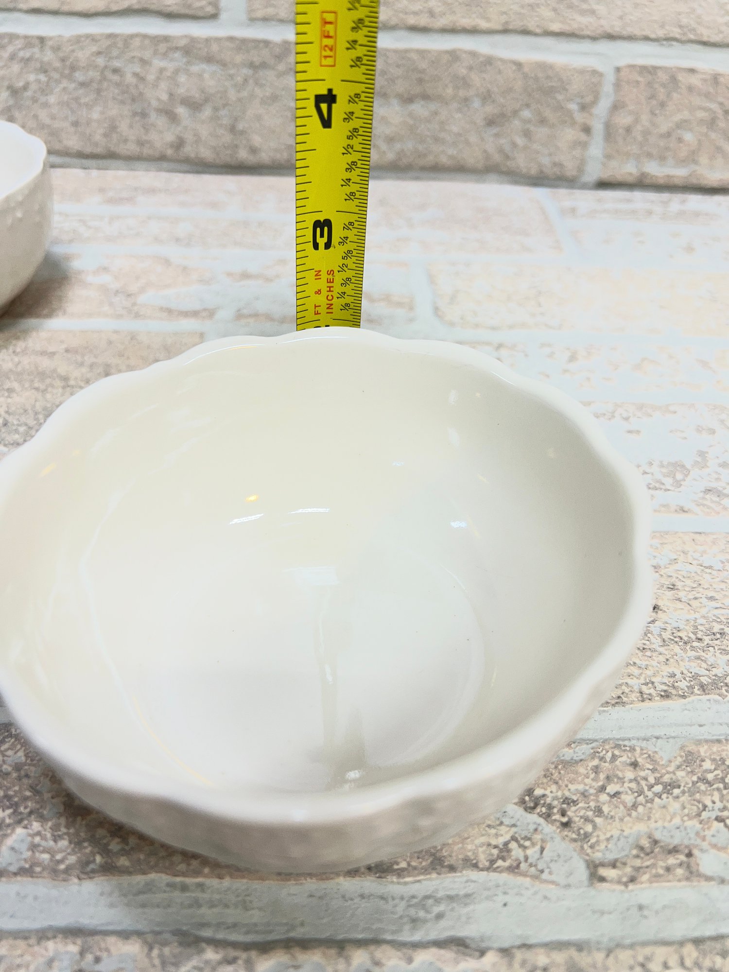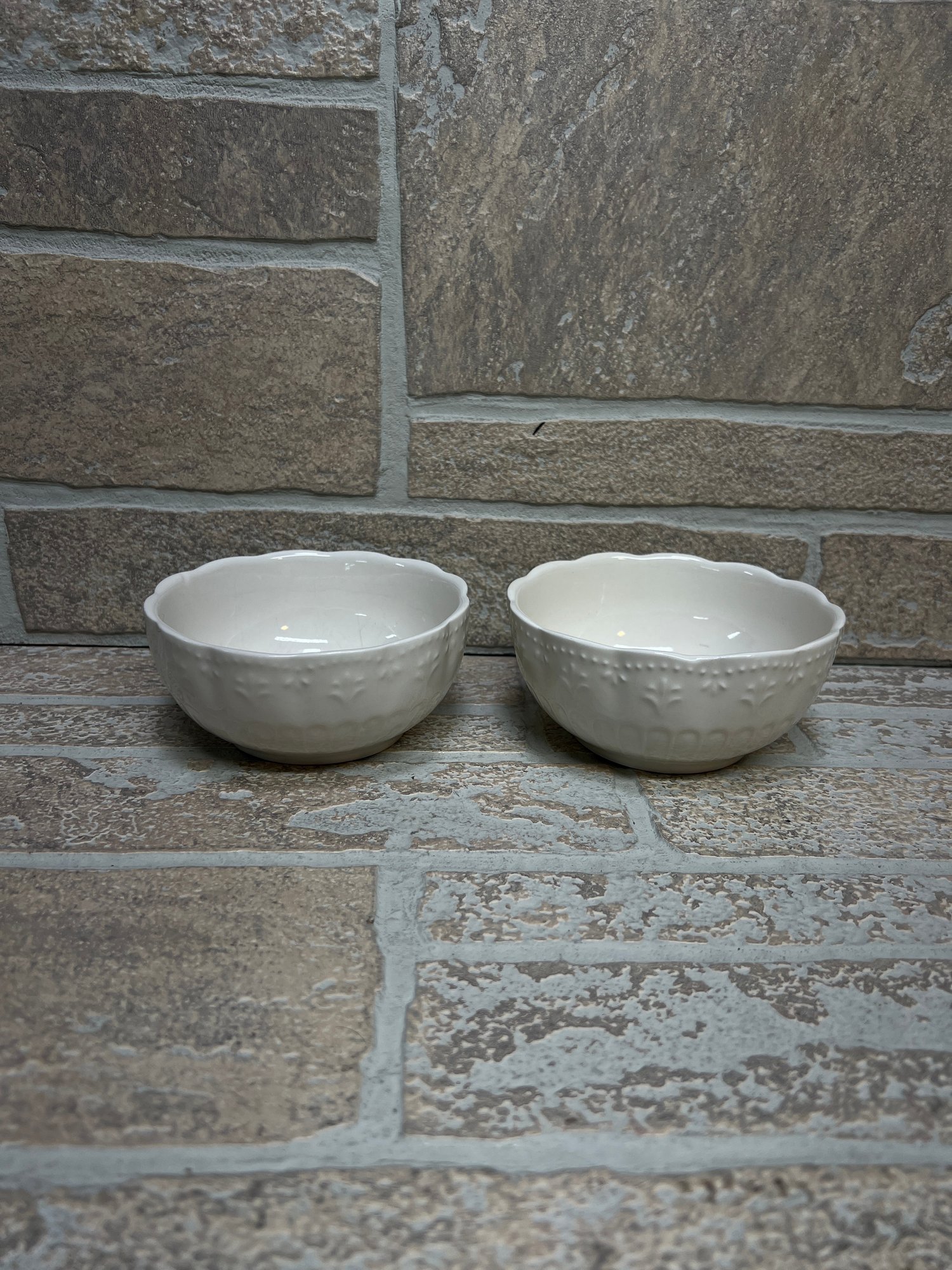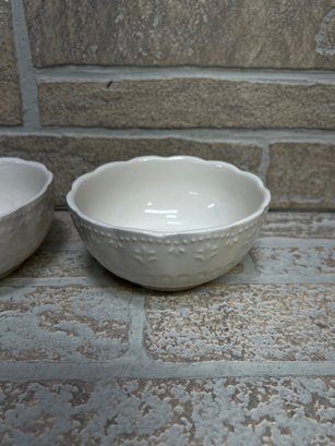 Set of two white embossed stoneware bowls from The Pioneer Woman collection.