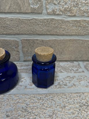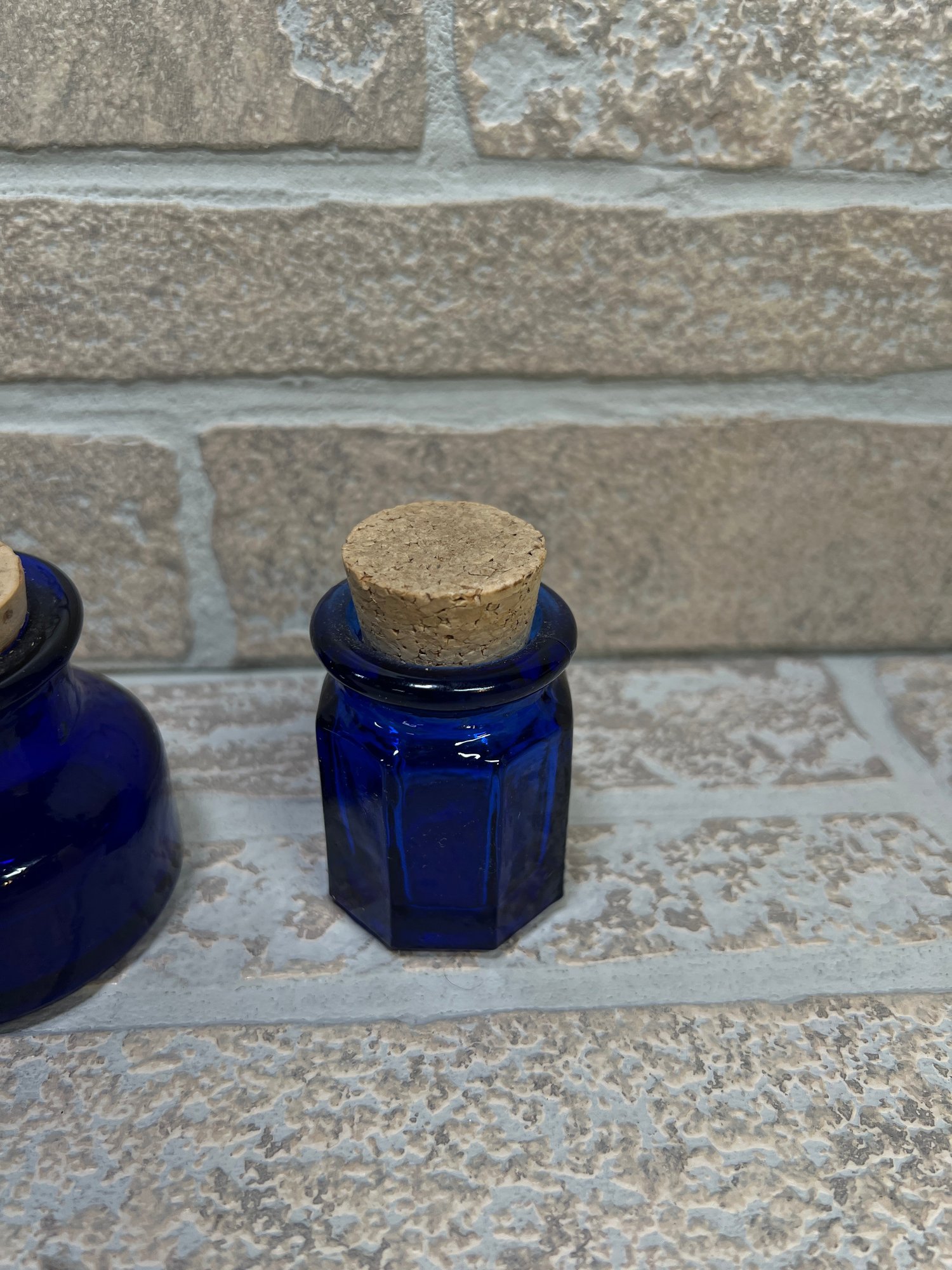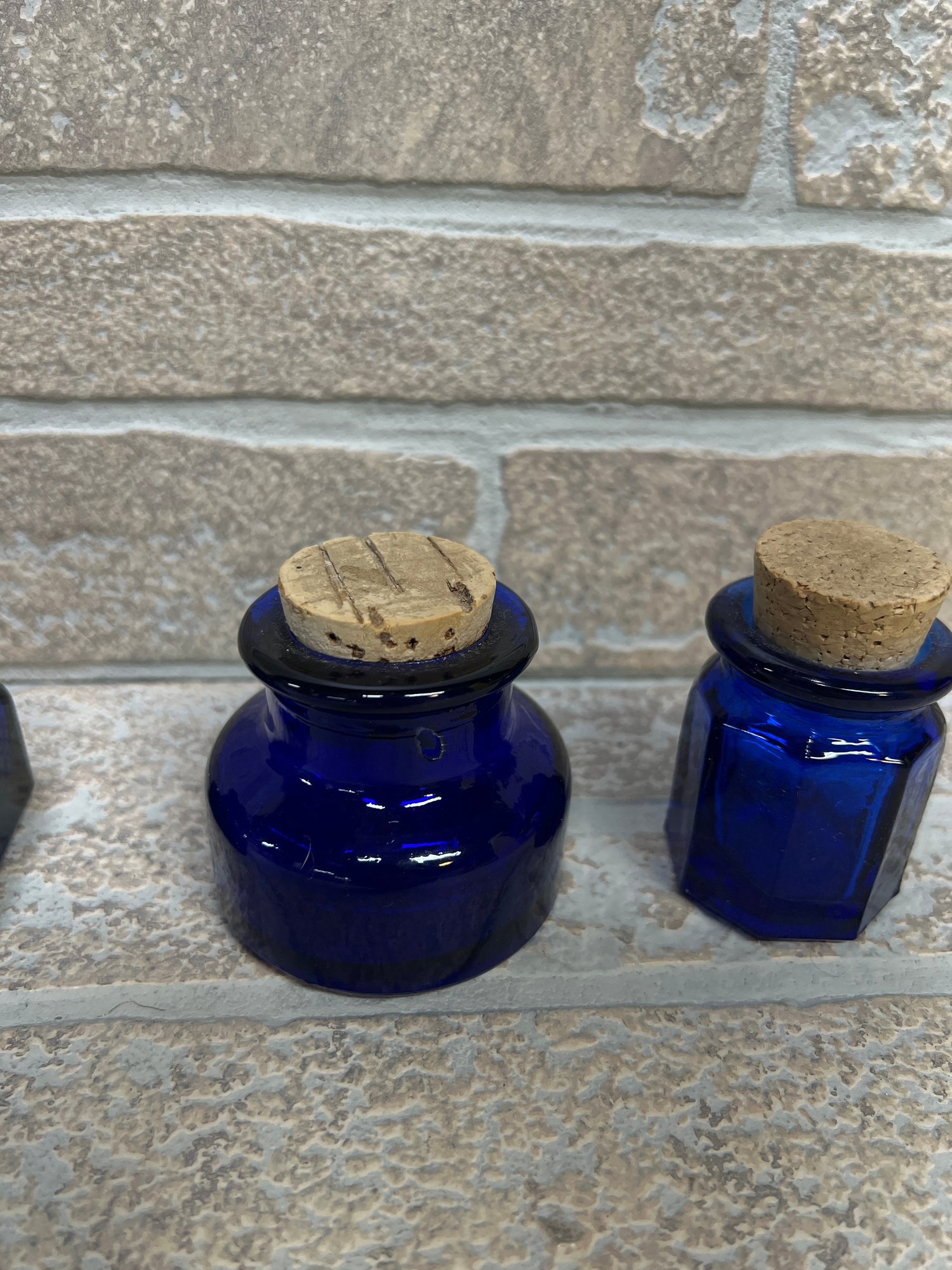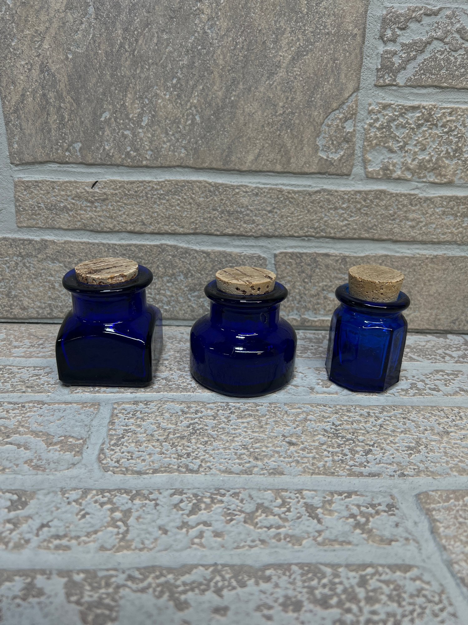 Set of three cobalt blue glass apothecary-style bottles with cork stoppers. These feature a rich deep blue color and classic shapes, perfect for display, storage, or decorative use.